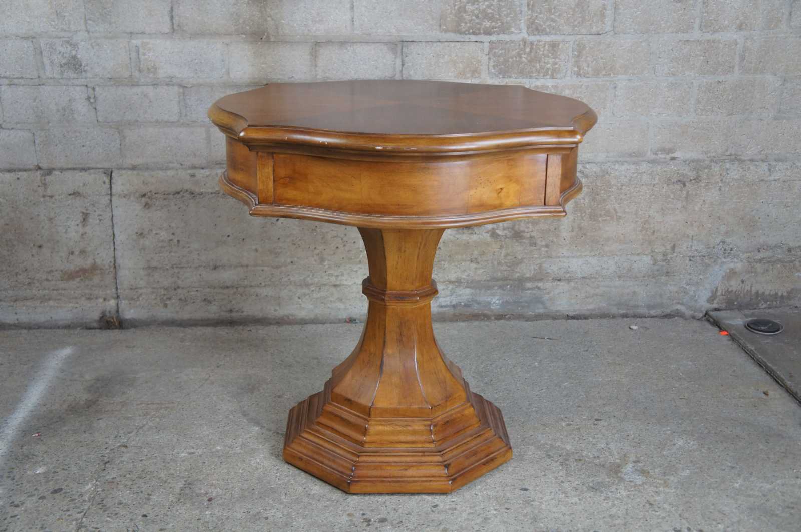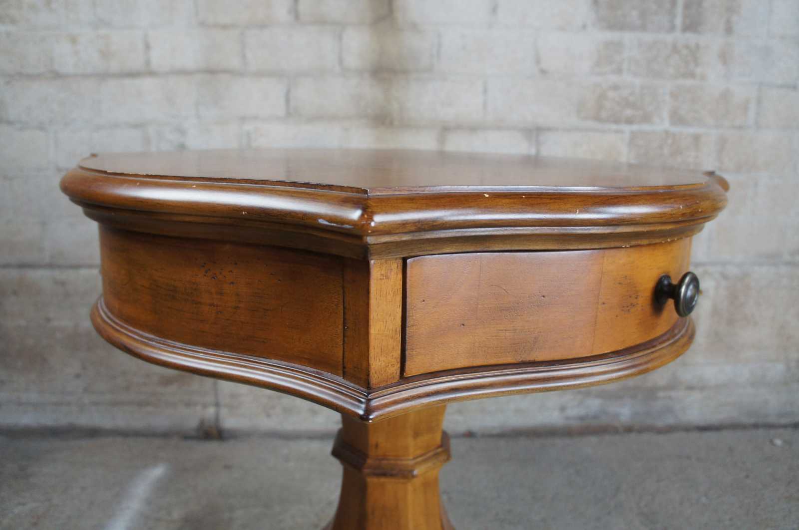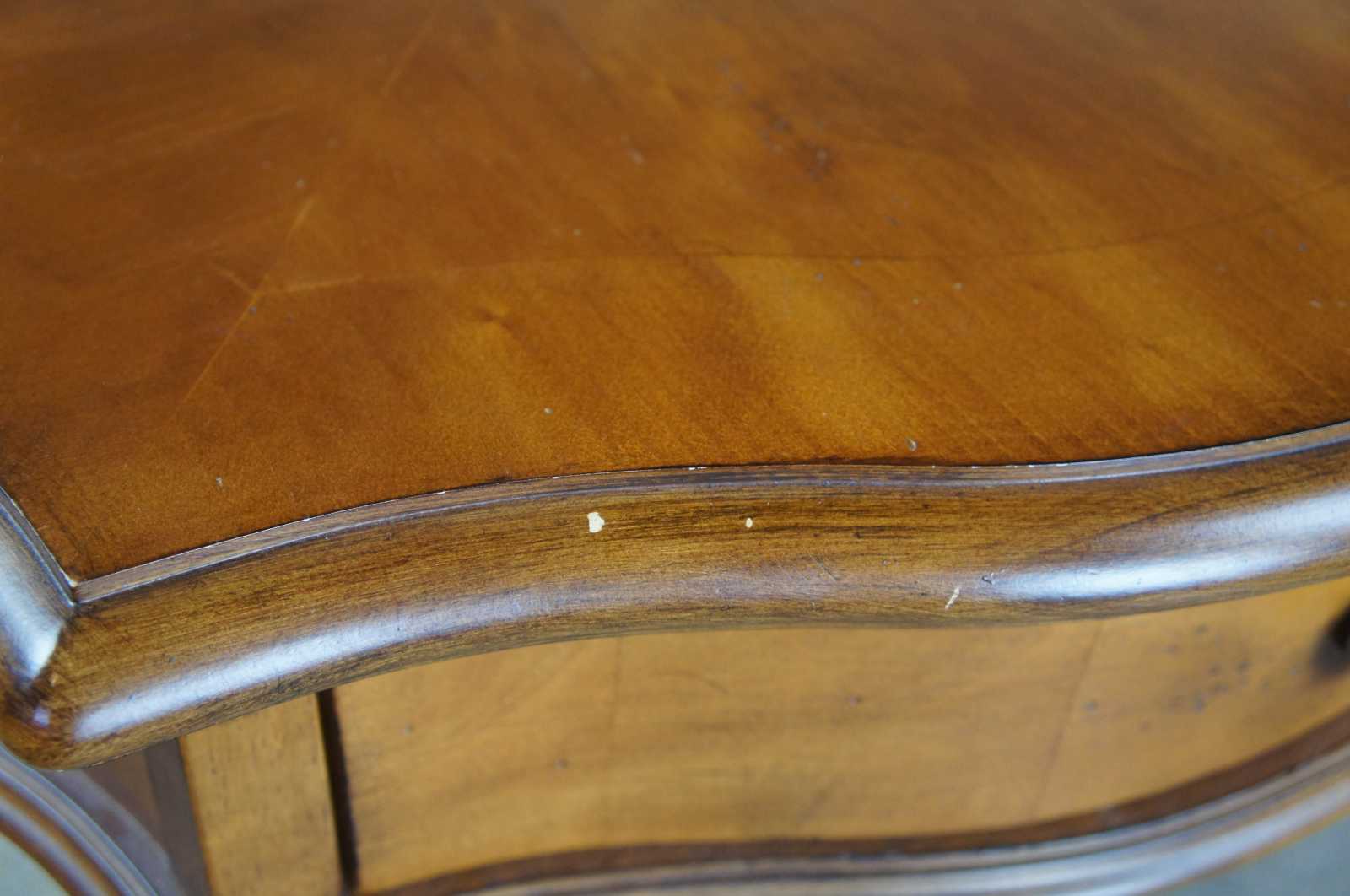Late 20th century serpentine side table. Made from birch with a two tone matchbook veneered top over octagonal base. Includes a drawer central drawer with oak construction.