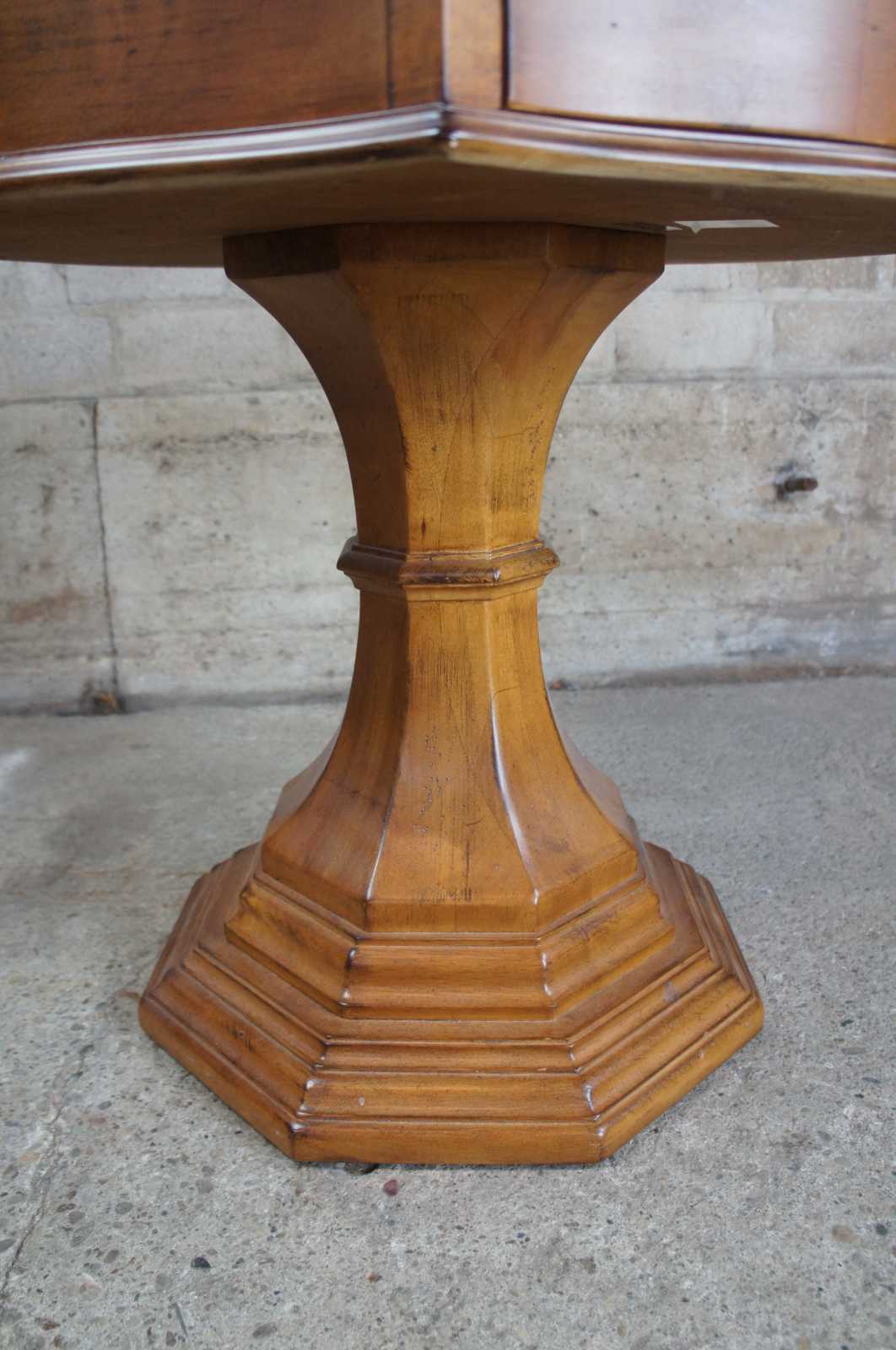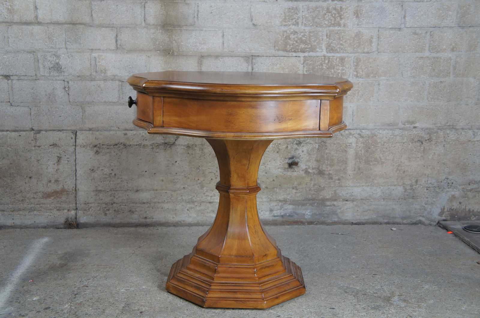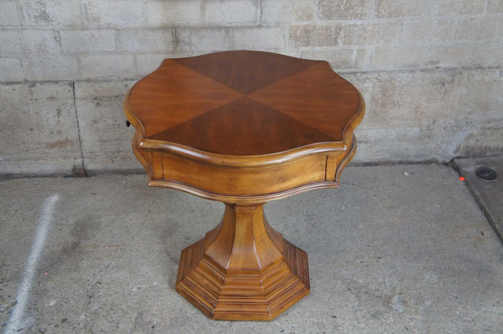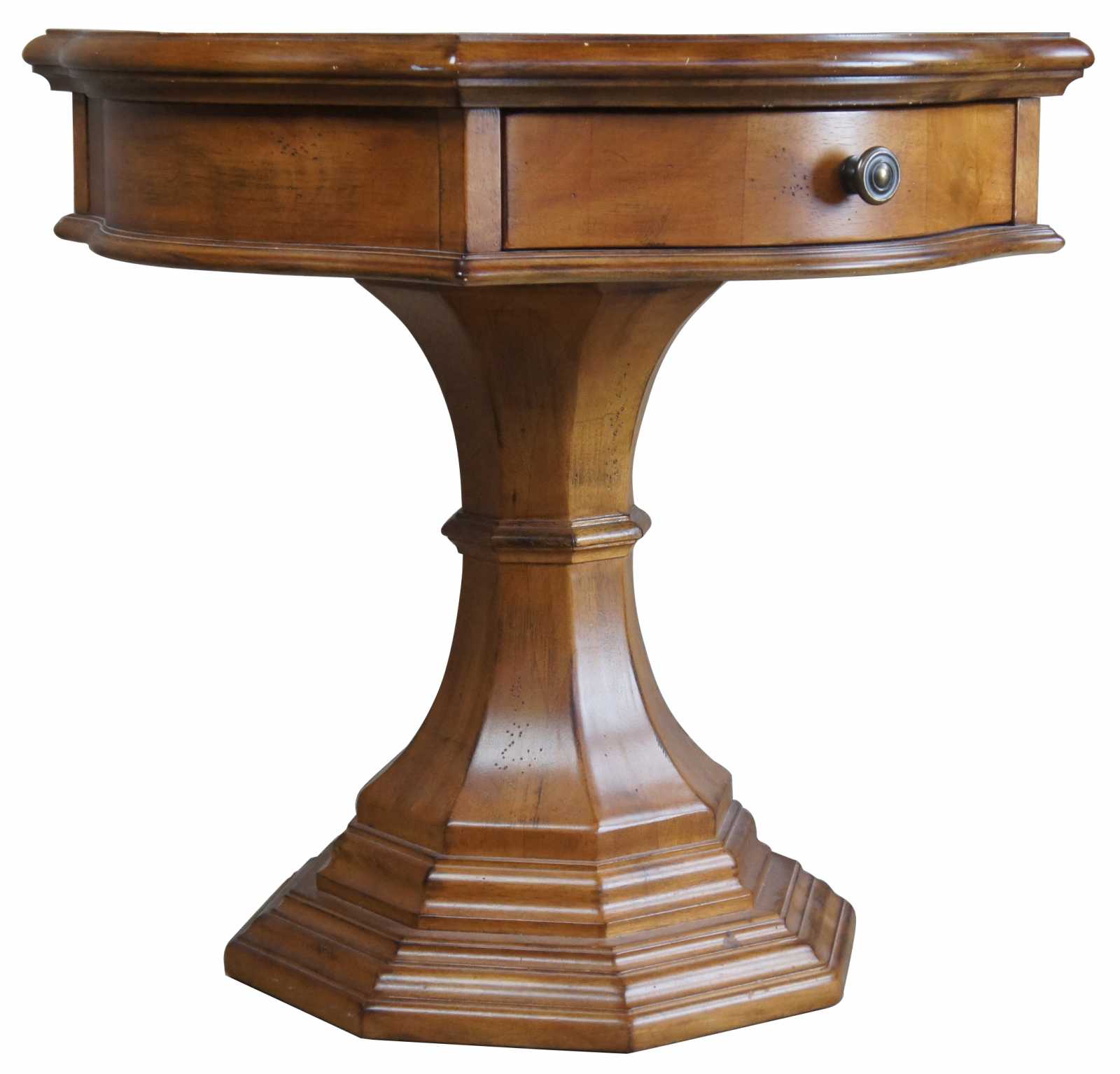 Late 20th century serpentine side table. Made from birch with a two tone matchbook veneered top over octagonal base. Includes a drawer central drawer with oak construction.