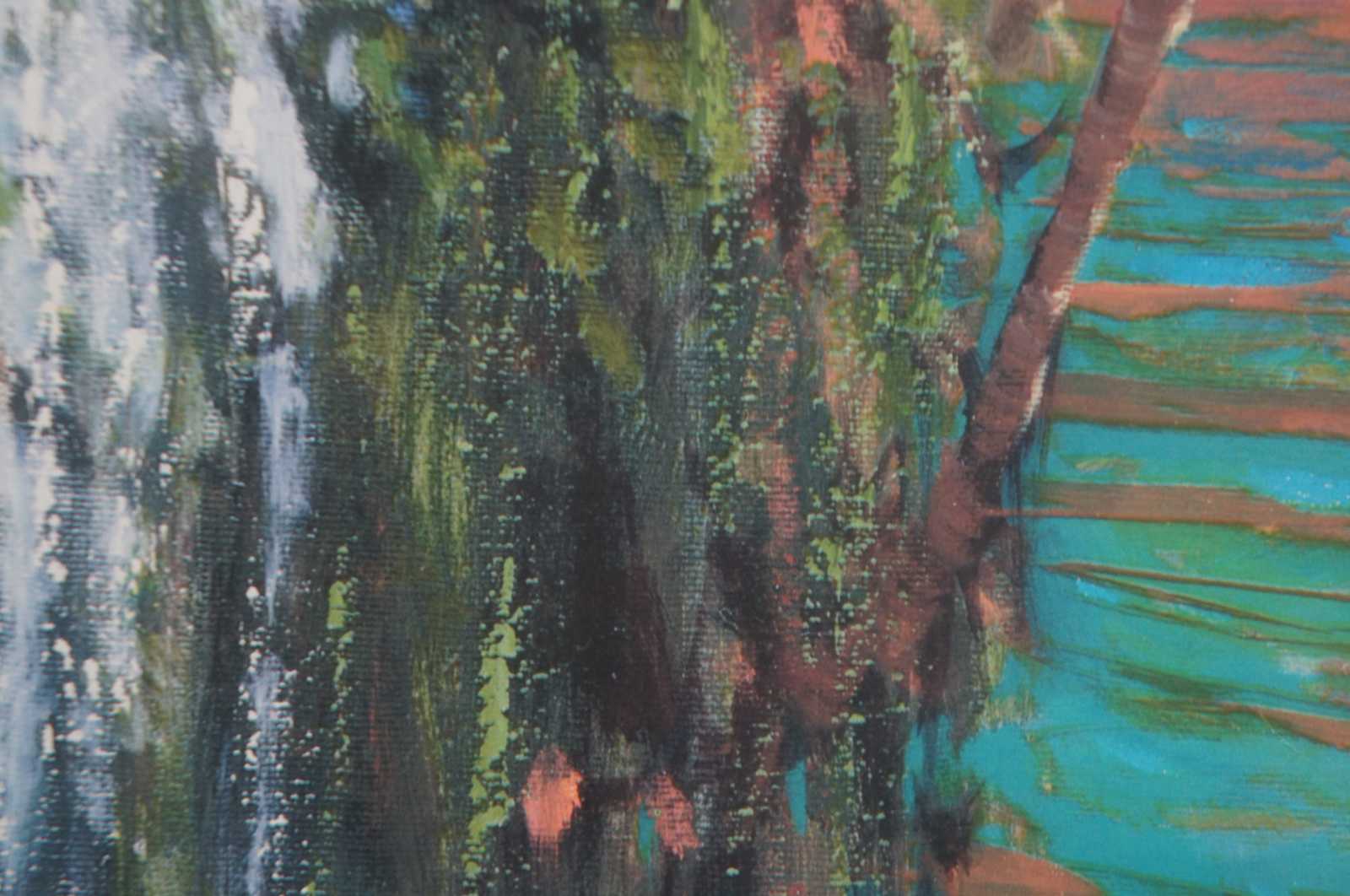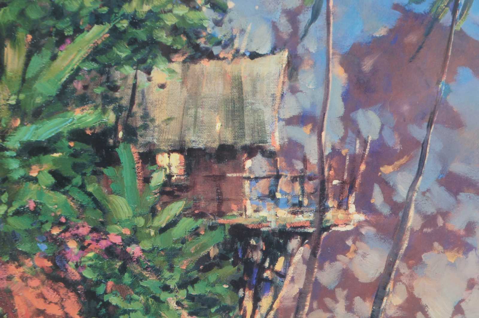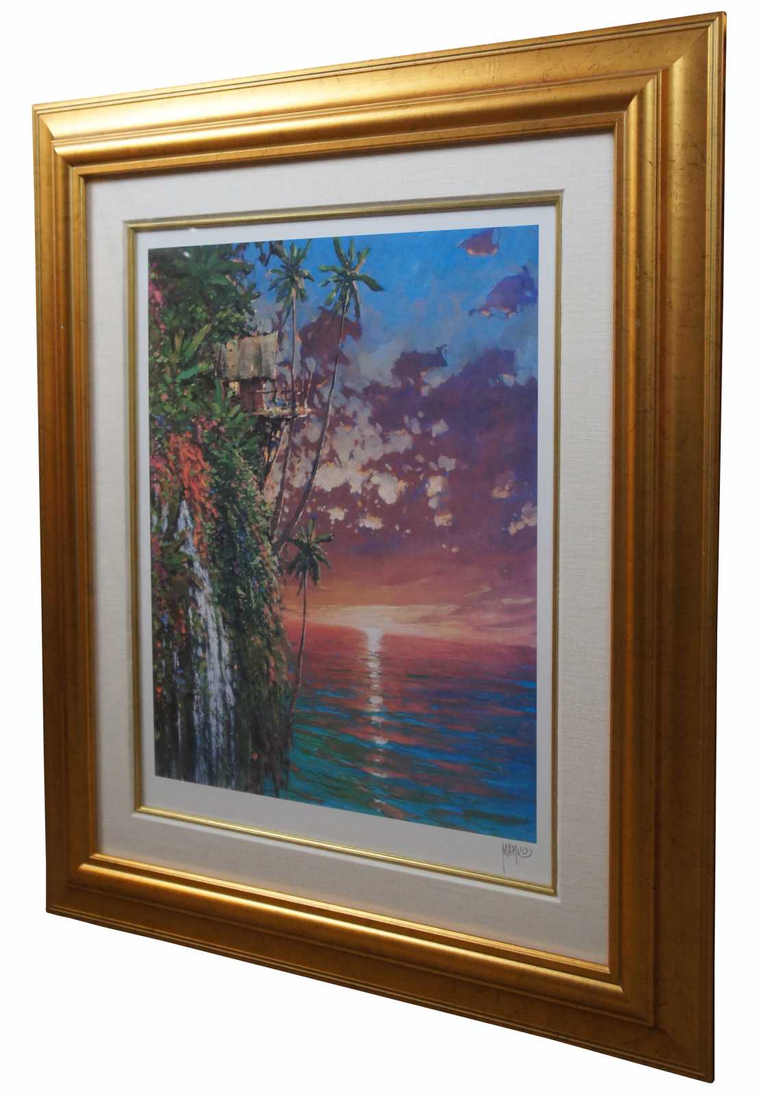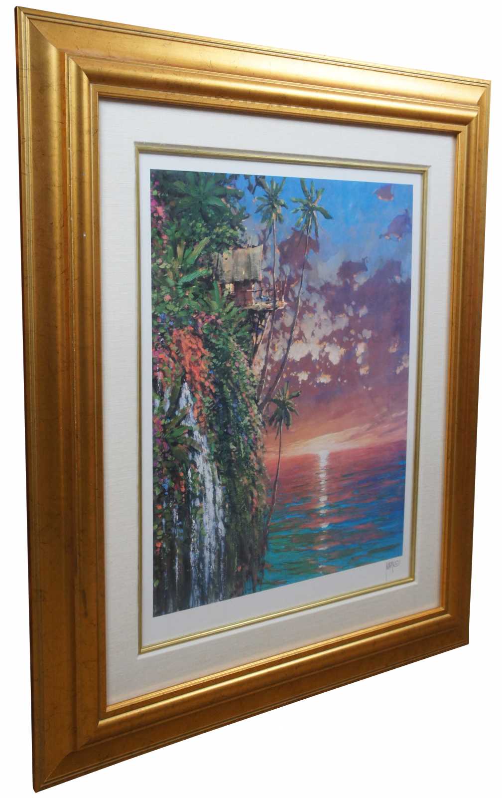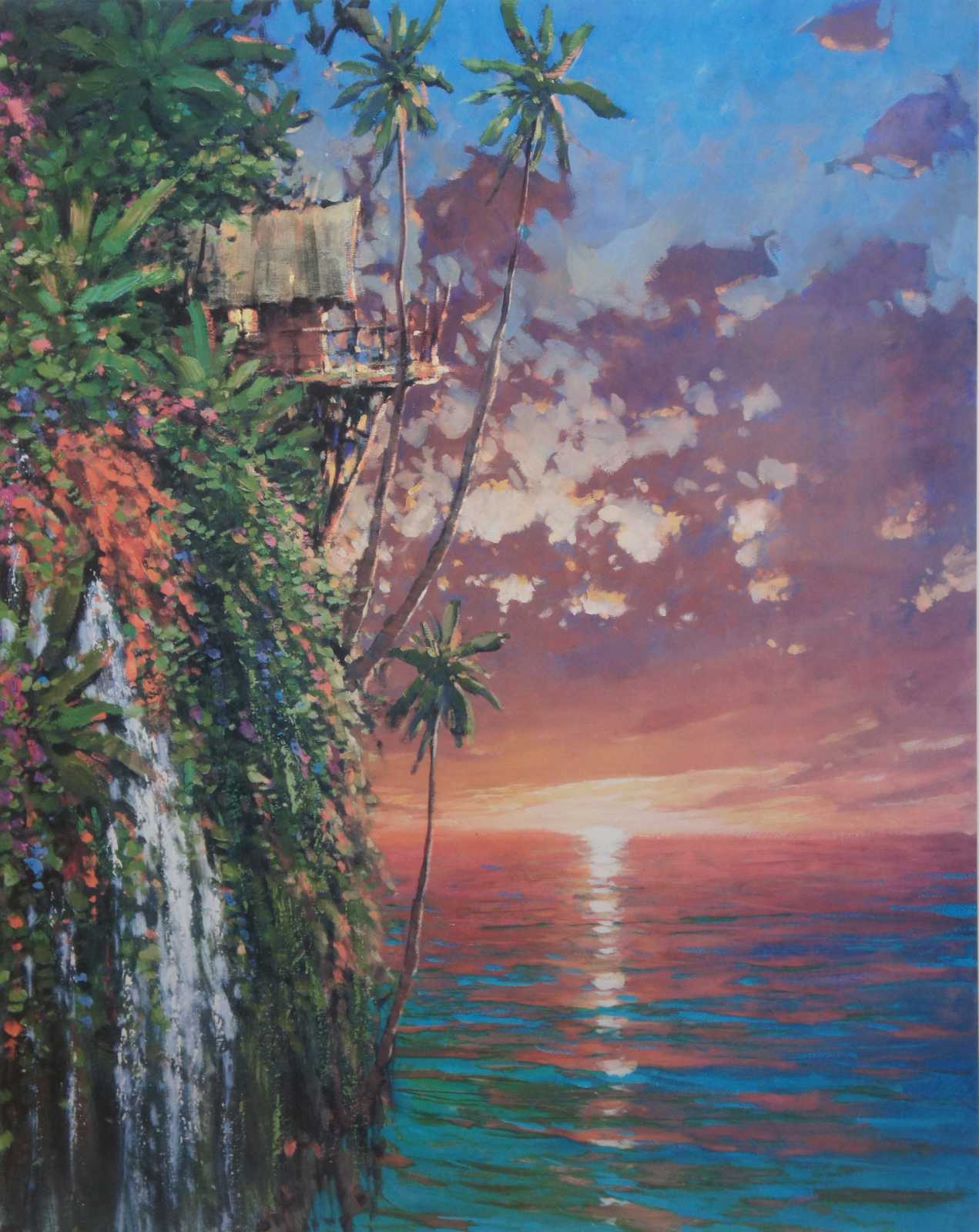 I Think of You This Time of Day” by Marko Mavrovich – seriolithograph expressionist tropical coastal landscape of an overhanging cottage on a cliff. Marko Mavrovich (Born 1960) is active/lives in United States, Croatia. Marko Mavrovich is known for Painting.