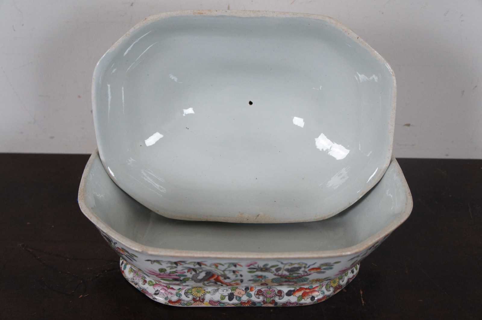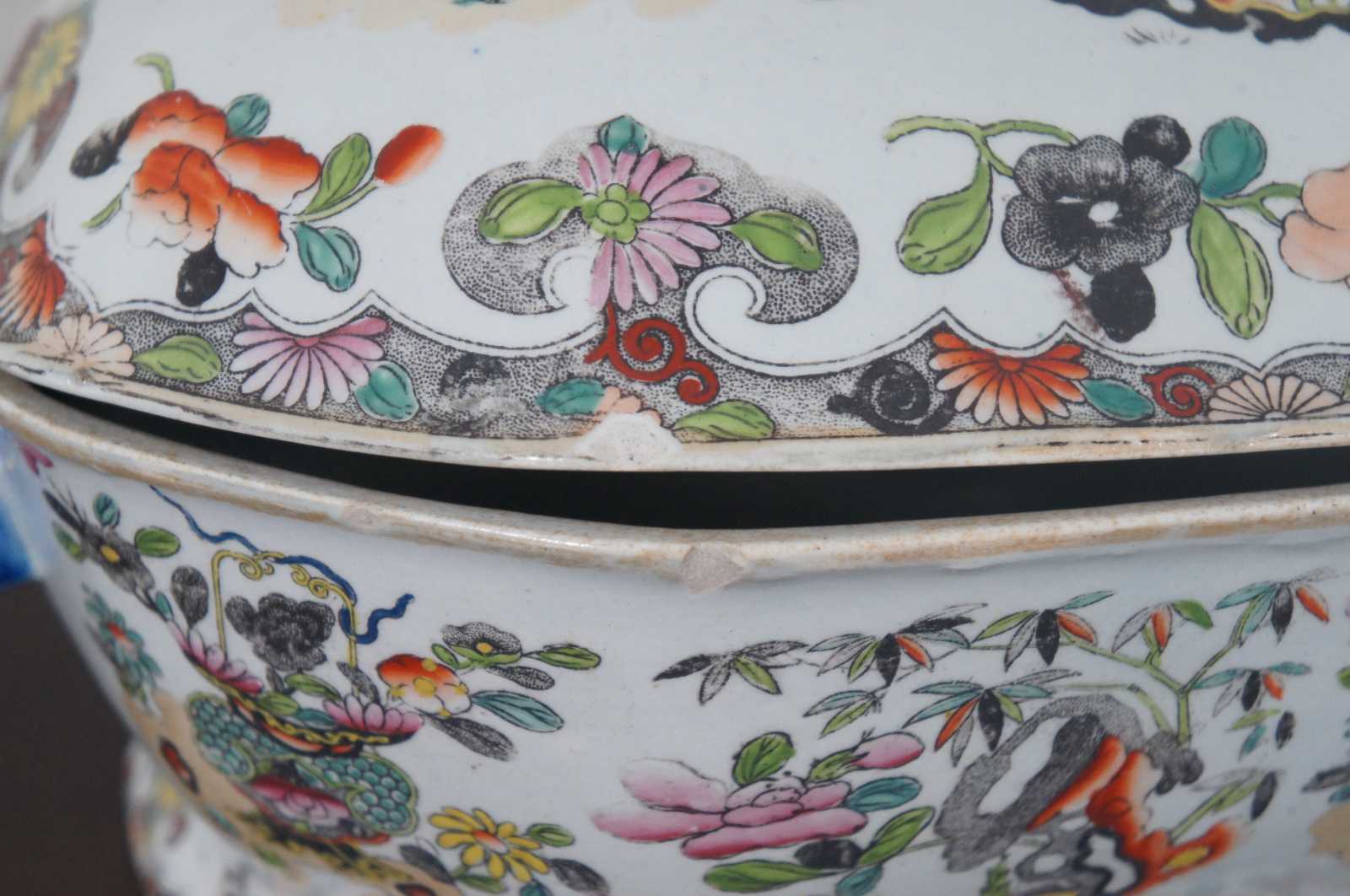 Each piece has a light grey-blue glaze and has been beautifully and carefully hand-painted in a chinoiserie pattern in bold colorful enamels over a transfer printed outline with a dark ochre outer rim.