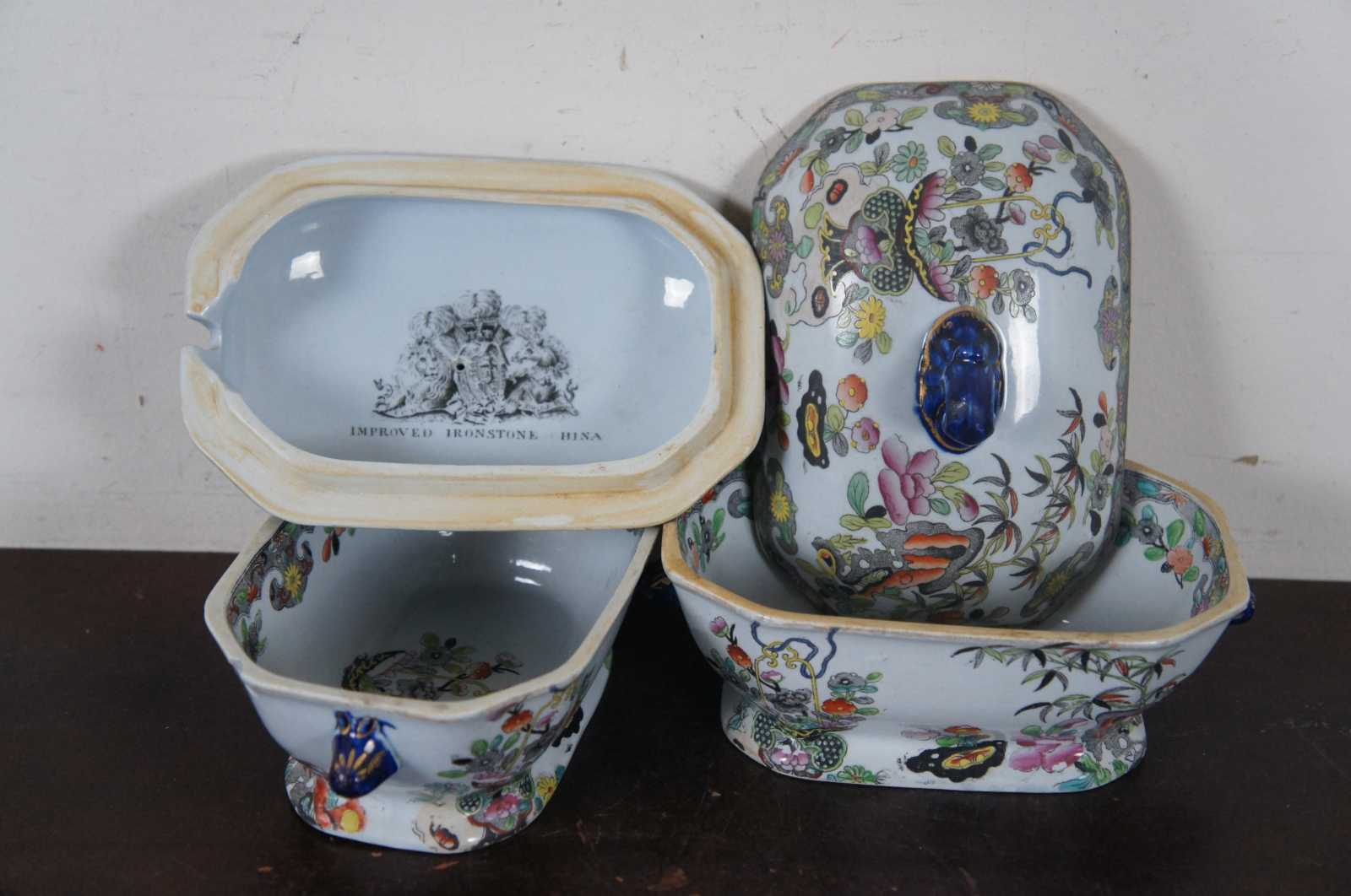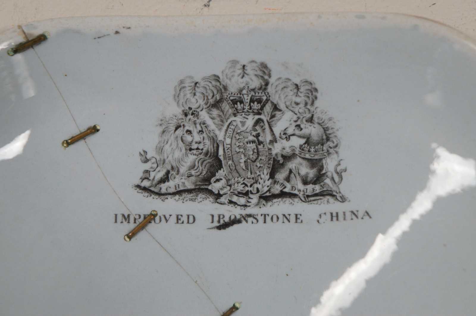 The plate is fully marked to the base with a Royal Arms mark having the Prince of Wales feathers behind and improved ironstone China below, all printed in black. A Plate in this pattern with the same back mark is illustrated on Page 243, plates 186 a & b, of Godden's Guide to Ironstone, by Geoffrey A Godden, published by The Antique Collectors' Club.