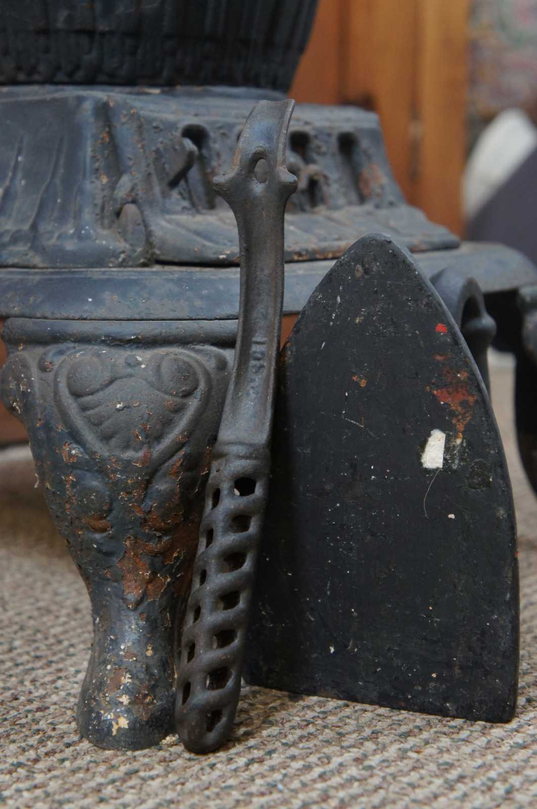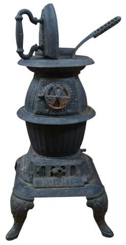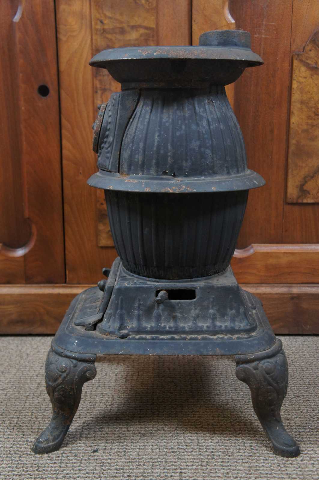 Small antique 19th century cast iron pot belly stove including flat iron and stove hook for the burner, sized for use in a railroad station or other small room. Marked slip on the lower plate, No 6.