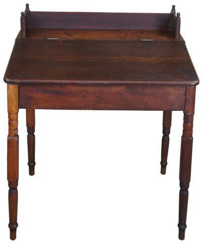 A charming 19th century slant top writing desk. Made from cherry with turned legs leading to peg feet. Features a backsplash with turned finials and large storage area underneath top.