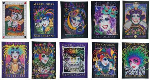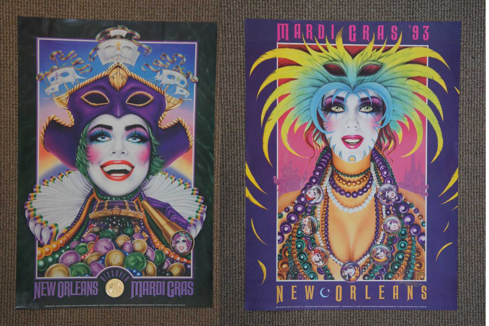 Lot of ten promotional posters for the annual Mardi gras celebration in New Orleans, spanning from 1988 to 1997, designed by Andrea Mistretta. Andrea Mistretta is a self-taught artist, illustrator, graphic designer and calligrapher. Drawing since age three, she worked with her parents in their small screen print shop during her teen years. A recipient of awards from Society of Illustrators, The Art Directors Club and the prestigious Vargas Award, she considers New Orleans citizenship bestowed by Mayor Bartholemy a very special honor. An activist for the protection artists’ rights, Andrea also works vigorously as an environmental activist and founder of Friends of White’s Pond where her studio is located.