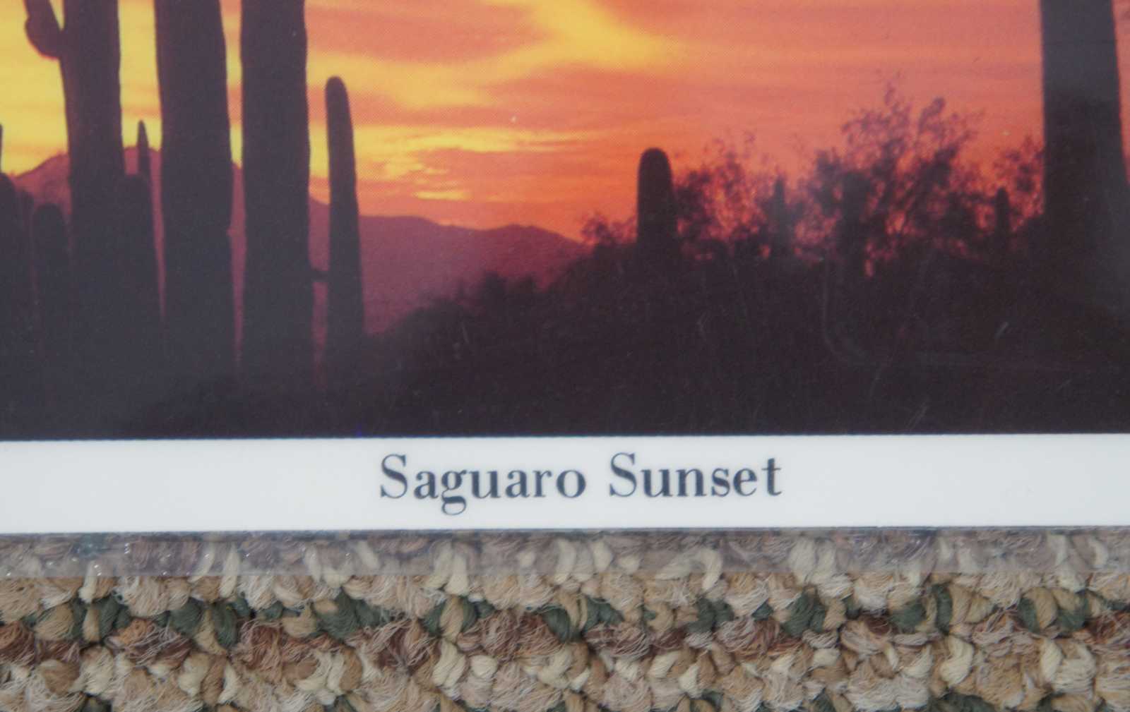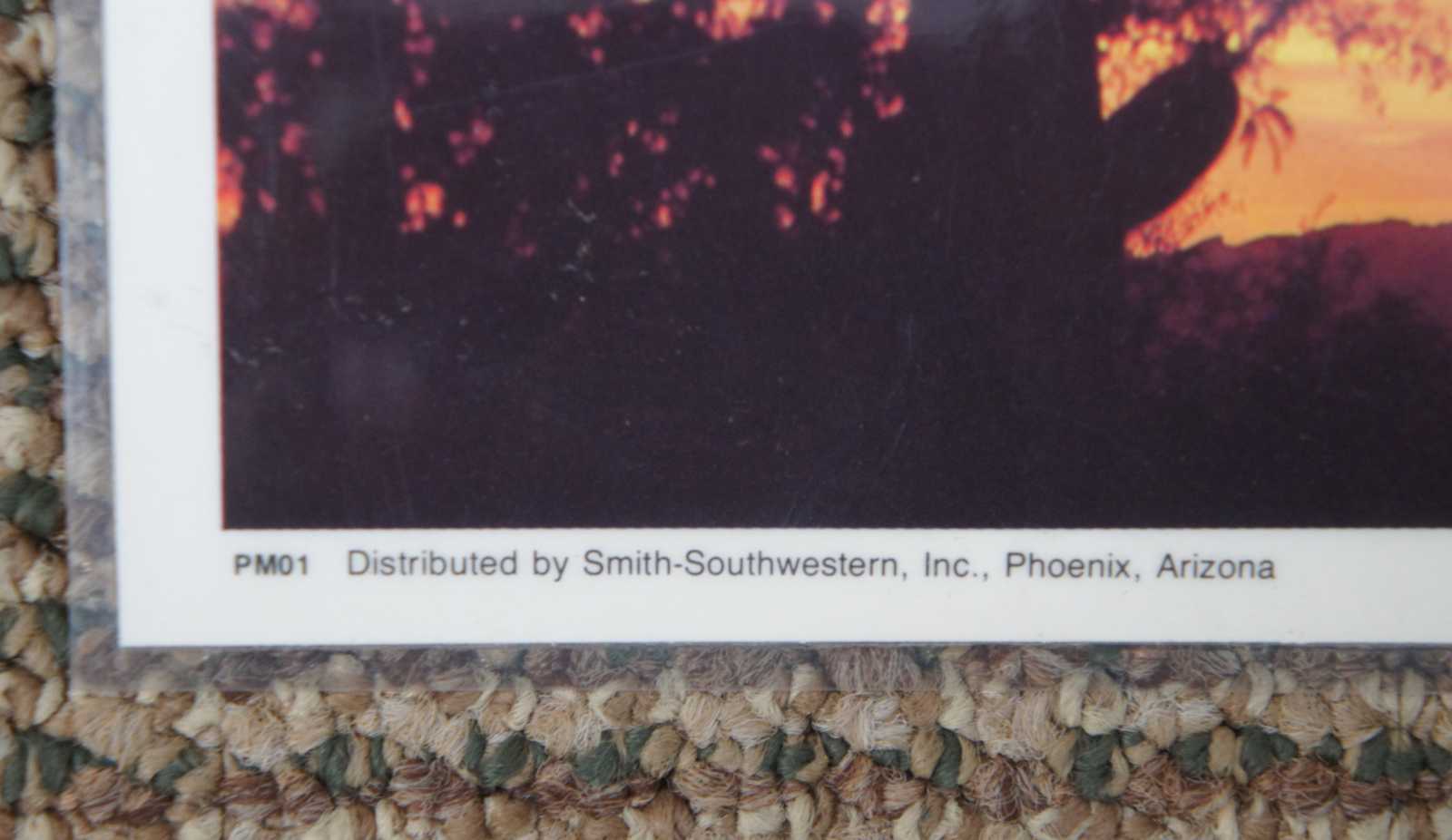 Double sided laminated print featuring a landscape photograph by Ray Manley on one side titled “Saguaro Sunset” distributed by Smith-Southwestern, Inc, and on the reverse an illustrated tableau of common desert plants and animals.