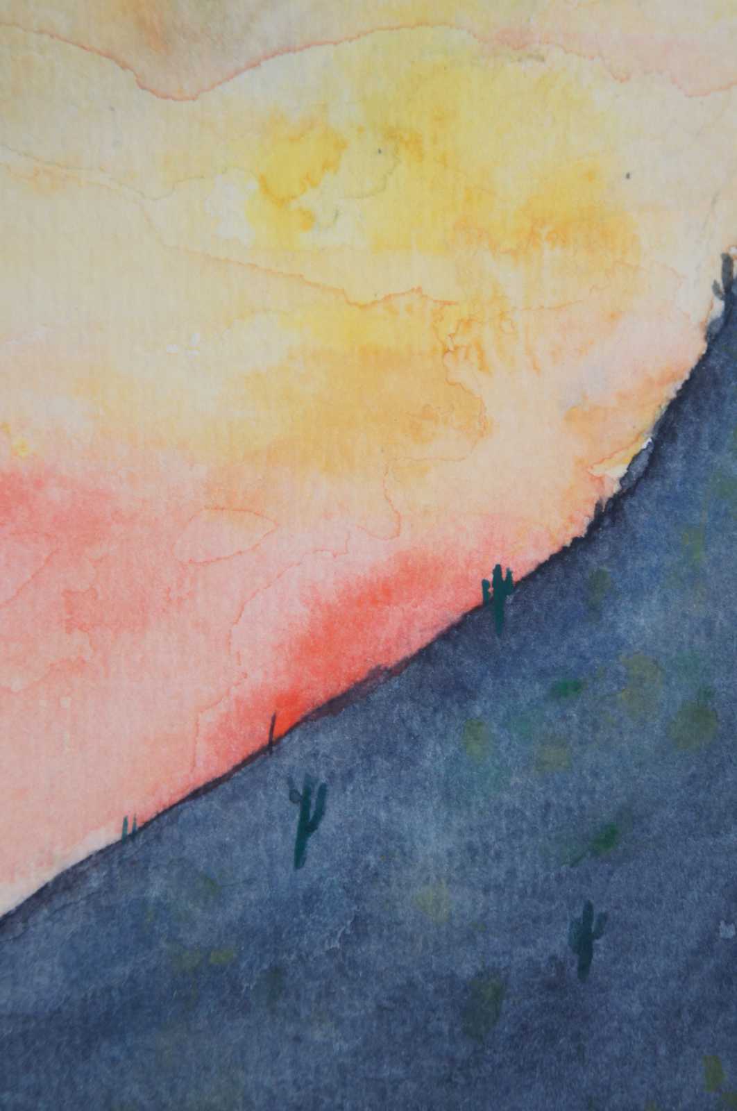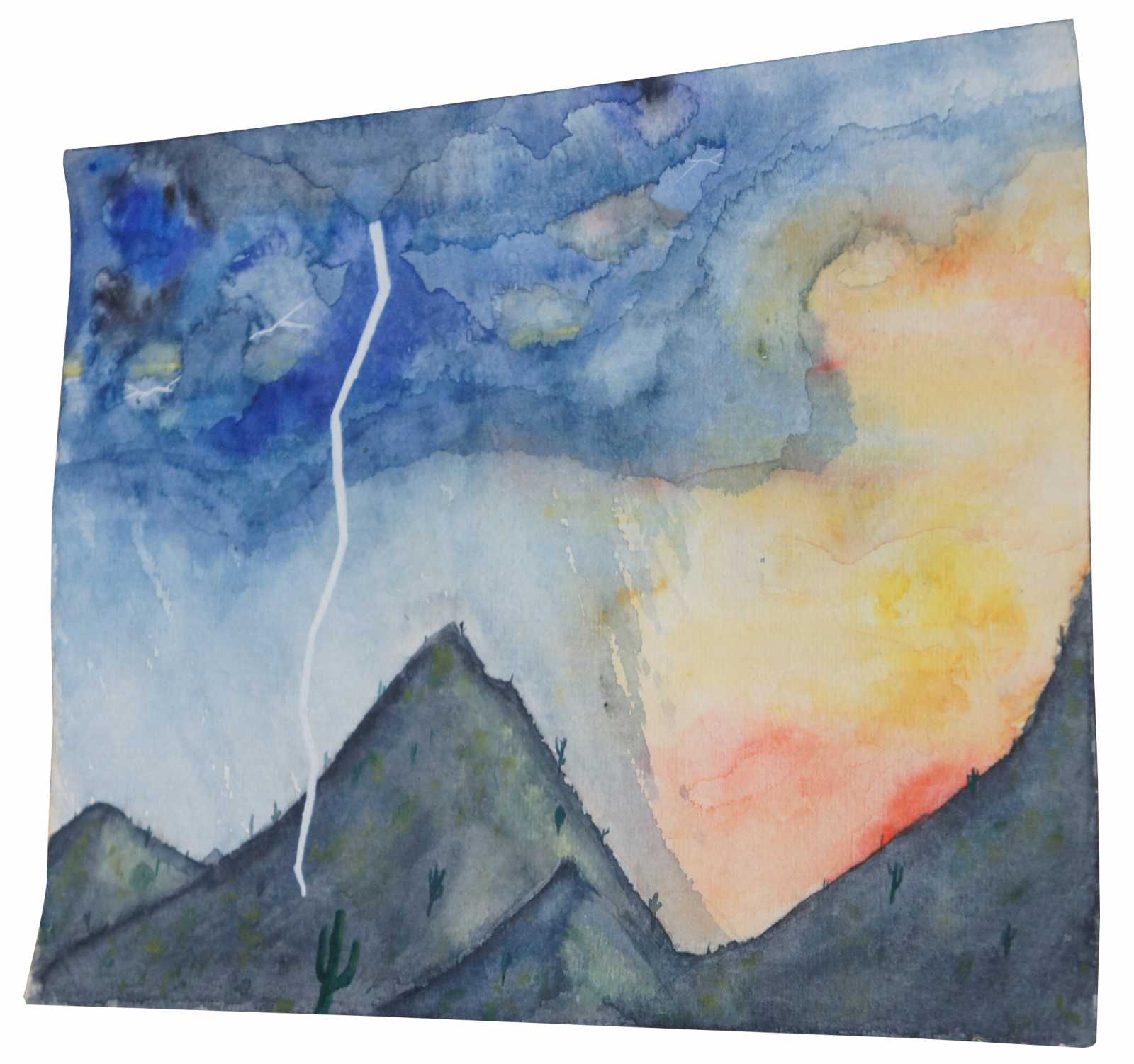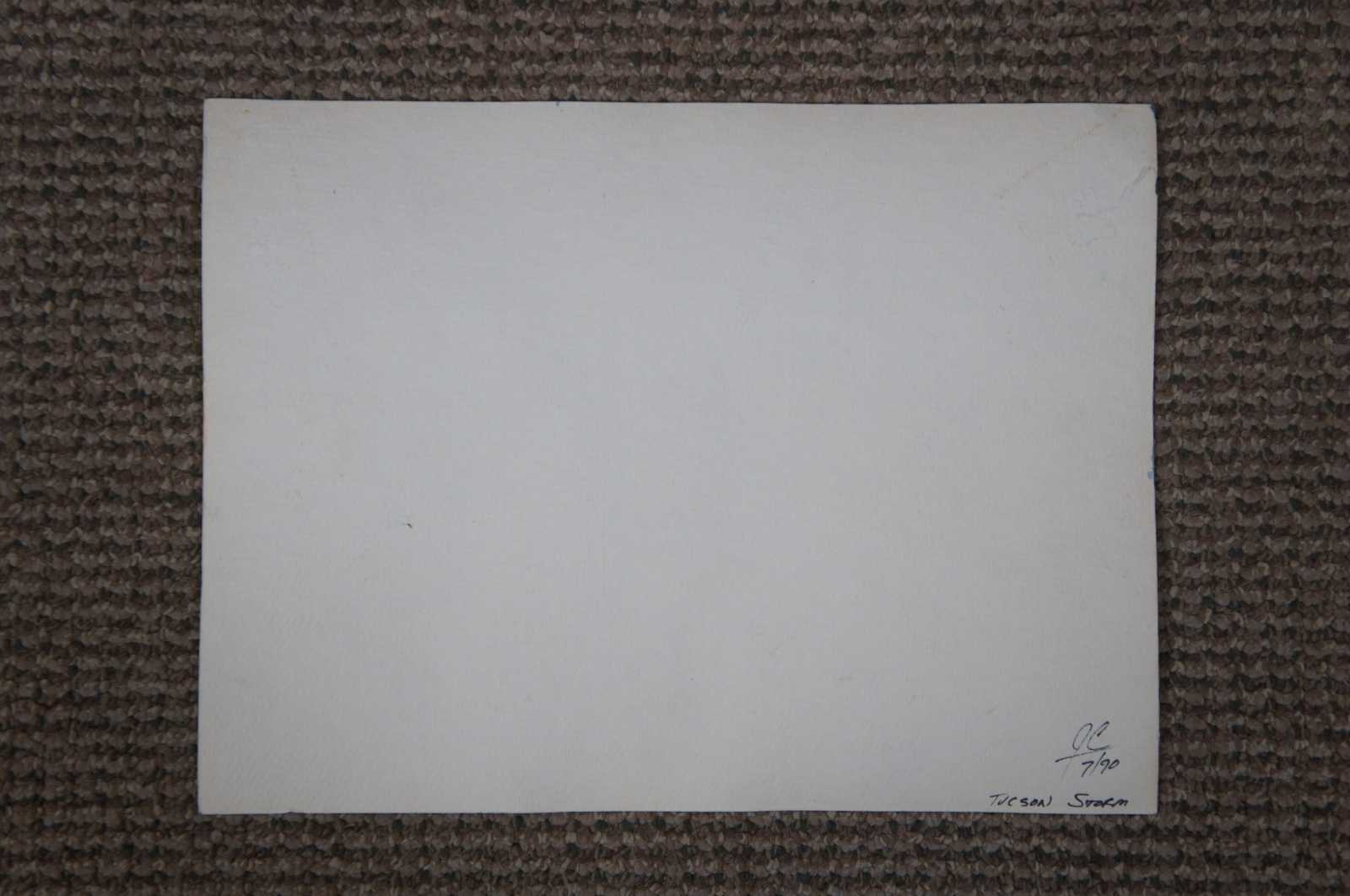Vintage 1990 watercolor landscape painting titled “Tucson Storm,” featuring cactus scattered mountains at sunset with a thunderstorm rolling in. Initialed by the artist on the reverse.