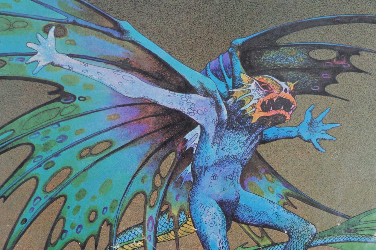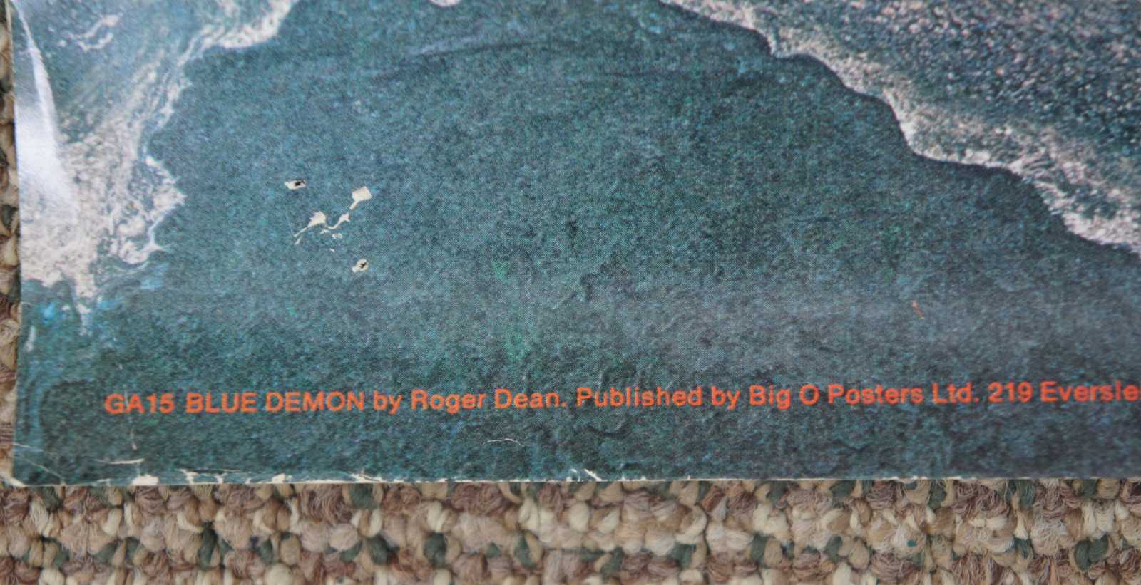 Original vintage 1970’s art poster titled “Blue Demon” by Roger Dean, printed in England for Bog O Posters Ltd. William Roger Dean, known as Roger Dean, is an English artist, designer, and publisher. He is best known for his work on posters and album covers for musicians, which he began painting in the late 1960s. The artists for whom he did the most art are English rock bands Yes and Asia.