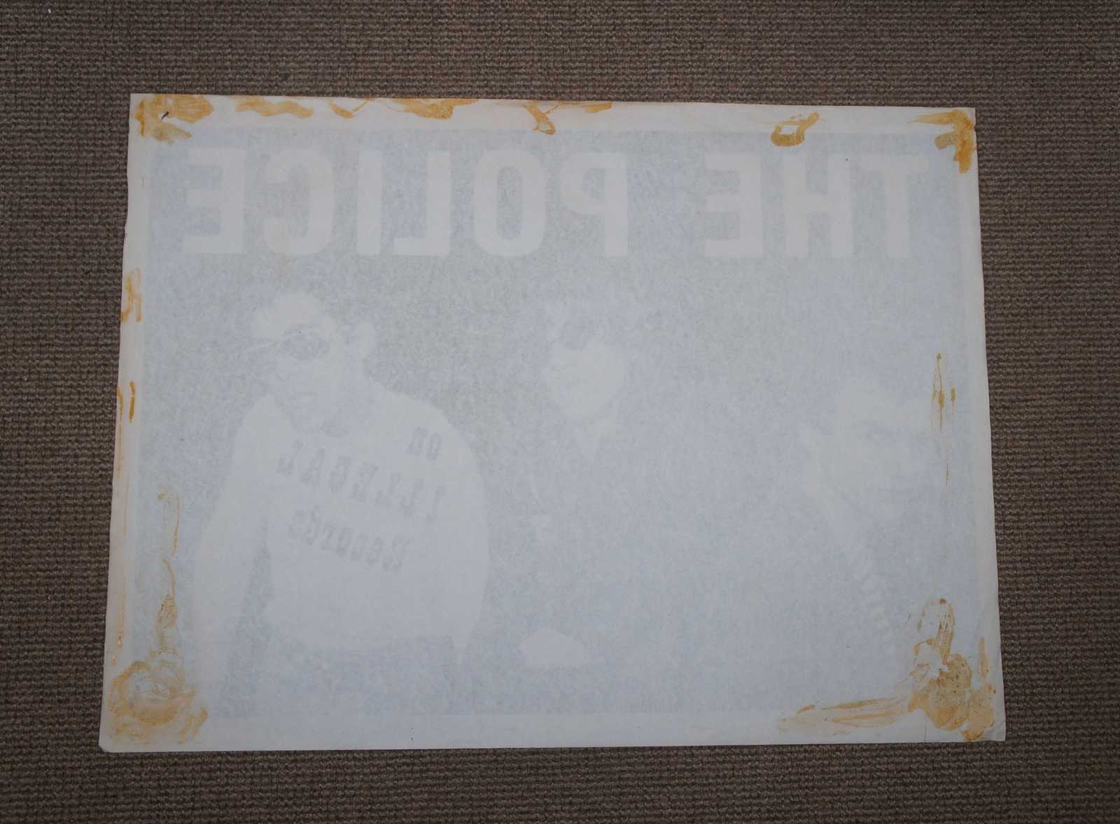 The Police were an English rock band formed in London in 1977. For most of their history the line-up consisted of primary songwriter Sting (lead vocals, bass guitar), Andy Summers (guitar) and Stewart Copeland (drums, percussion). The Police became globally popular in the late 1970s and early 1980s. Illegal Records was an independent record label, founded in 1977 by Miles Copeland III with his younger brother Stewart Copeland and the manager of The Police, Paul Mulligan.[1] The label released The Police's debut single, ""Fall Out"".[2]