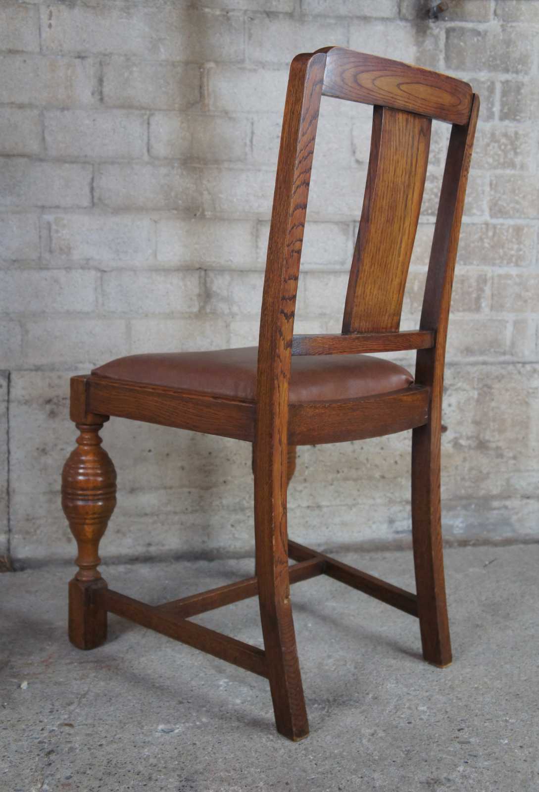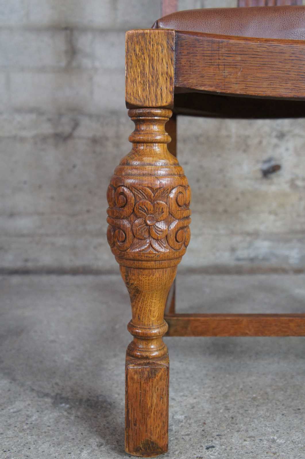 A lovely pair of 1930s Elizabethan revival dining side chairs by Jacob Summers & Sons. Part of their Hillcrest Suite as seen on page 18 of their catalog. Made from oak with a flower carved back, leather saddle seat and robust baluster shaped from legs. The company was founded by Jacob Summers in the 1880s and at the time these chairs were made, their factory was located in Tottenham, North London in the UK. Upholstered in leather made in British India. The British Raj was under rule by the British Crown in India from 1858 to 1947.