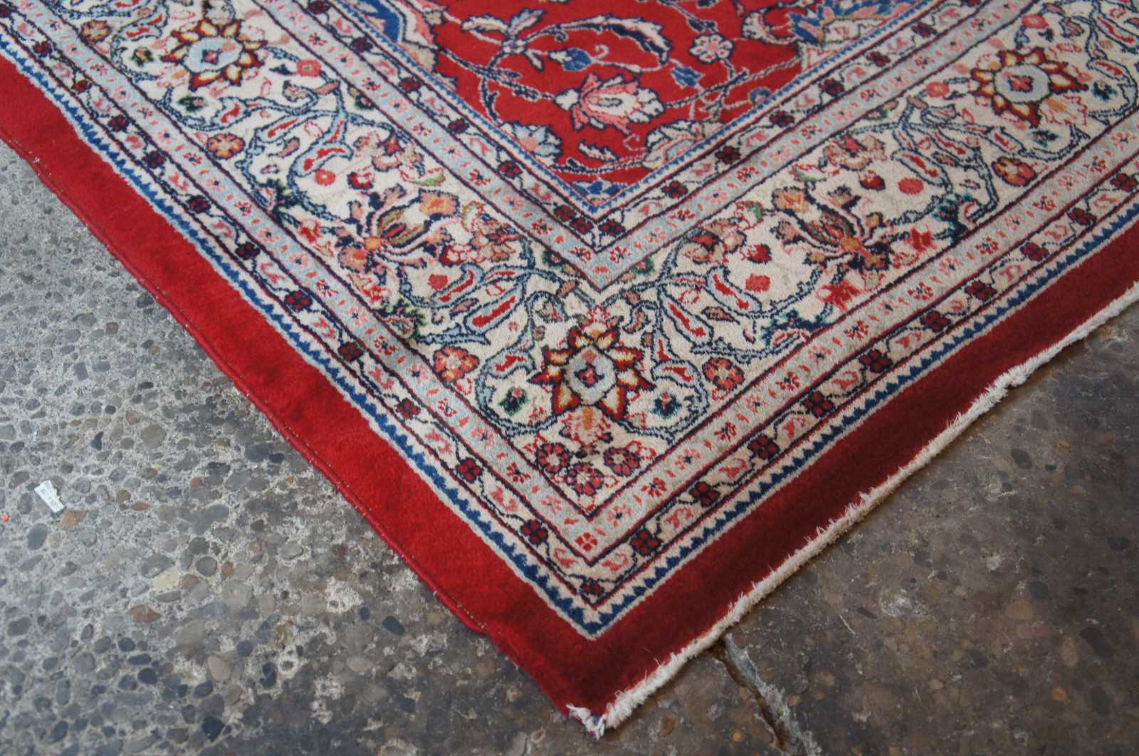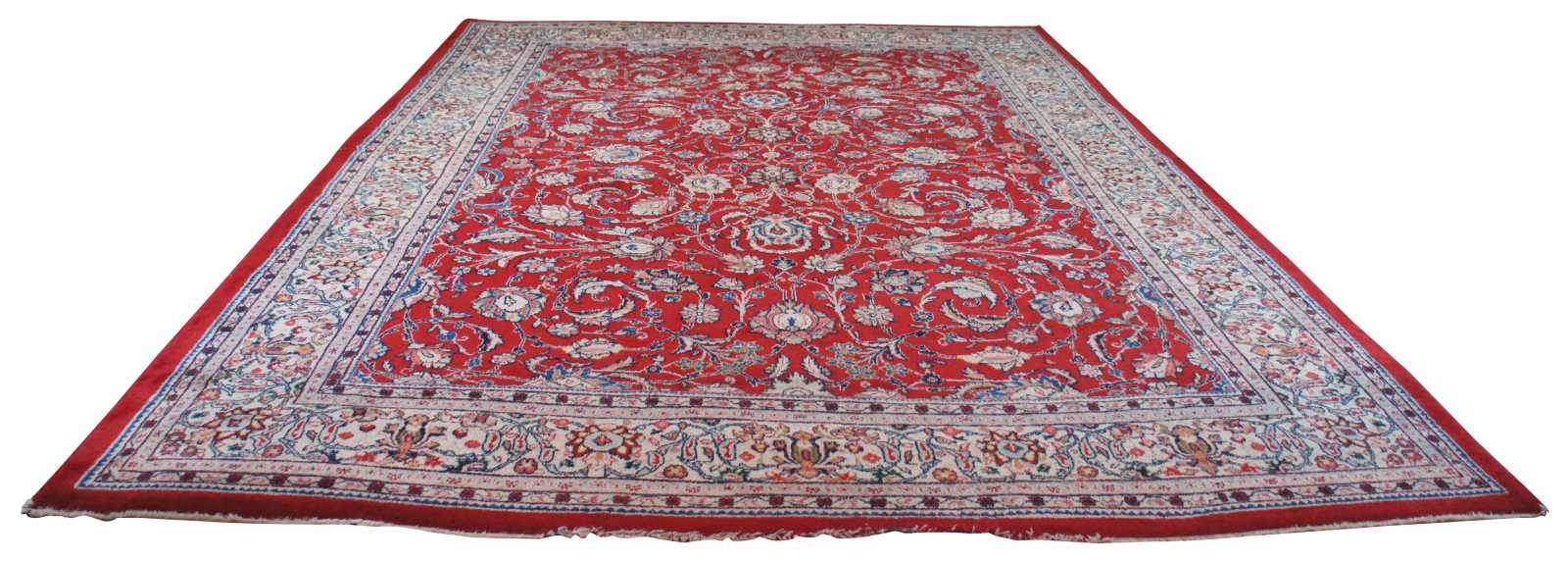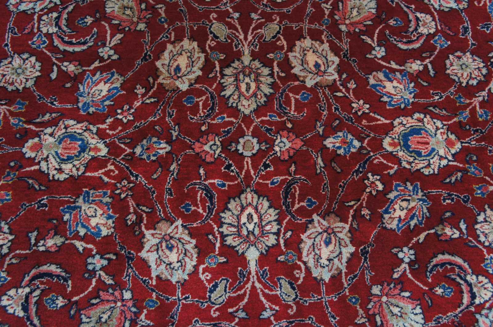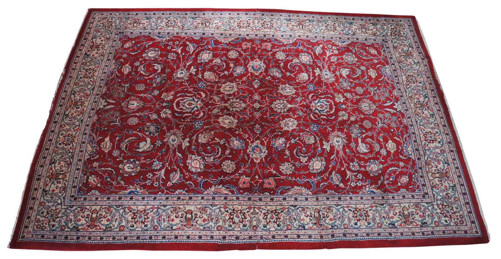 Large antique floral all over area rug featuring a red field with ornate floral accents in greens, blues, pink and brown.