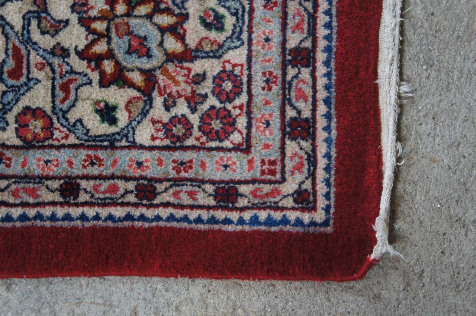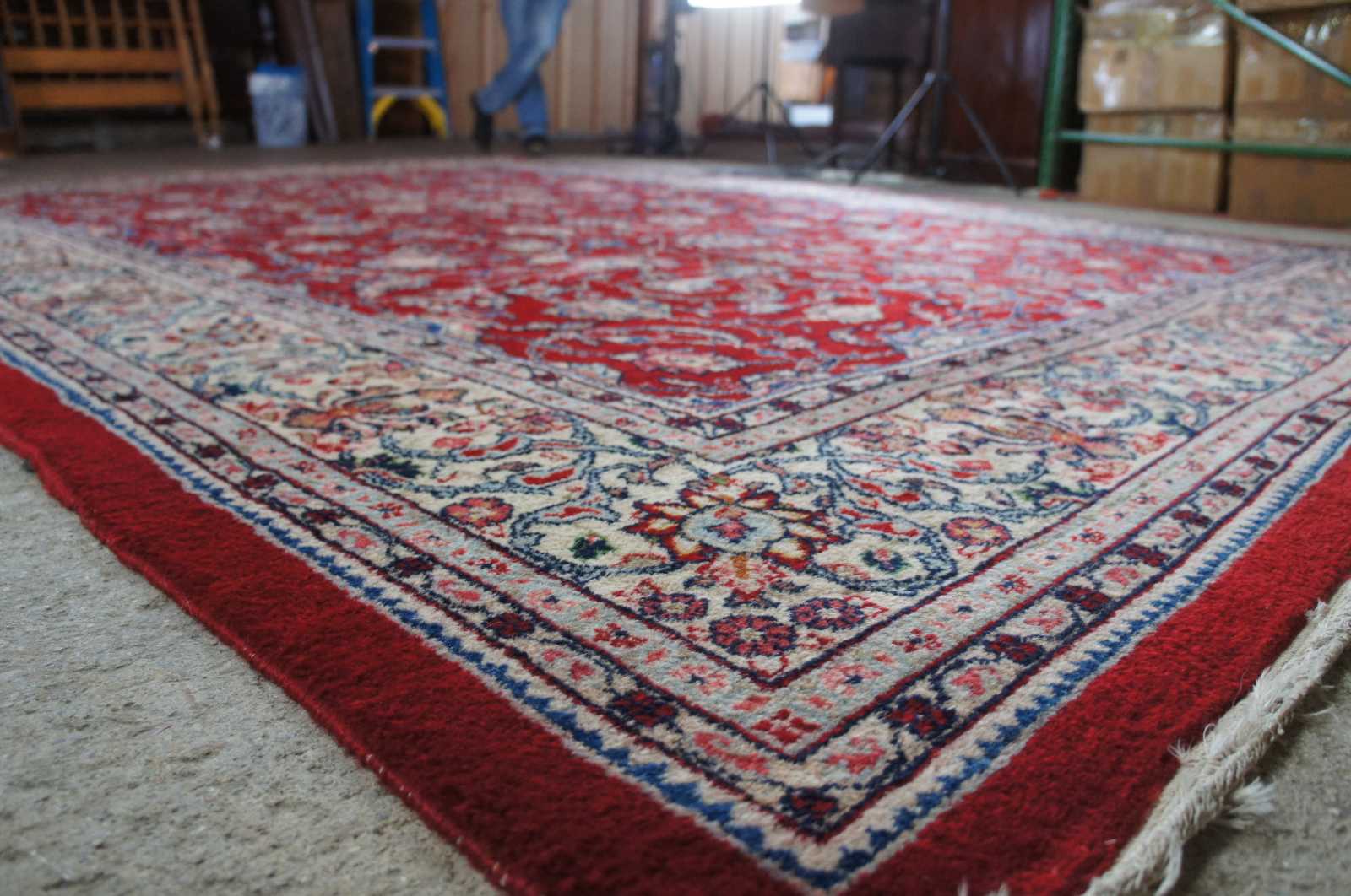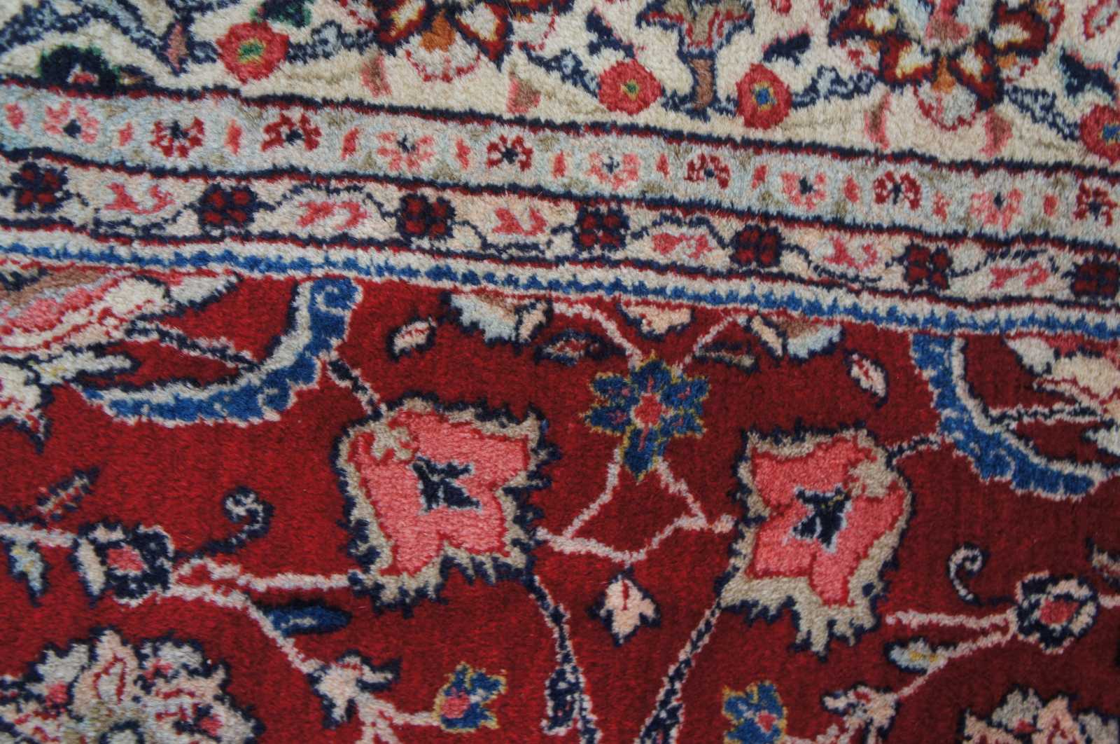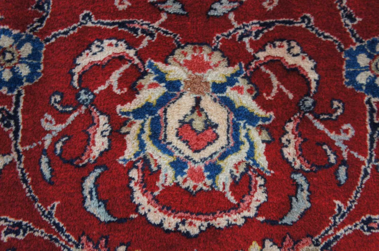 Large antique floral all over area rug featuring a red field with ornate floral accents in greens, blues, pink and brown.