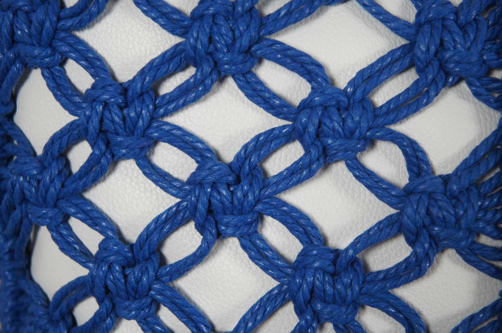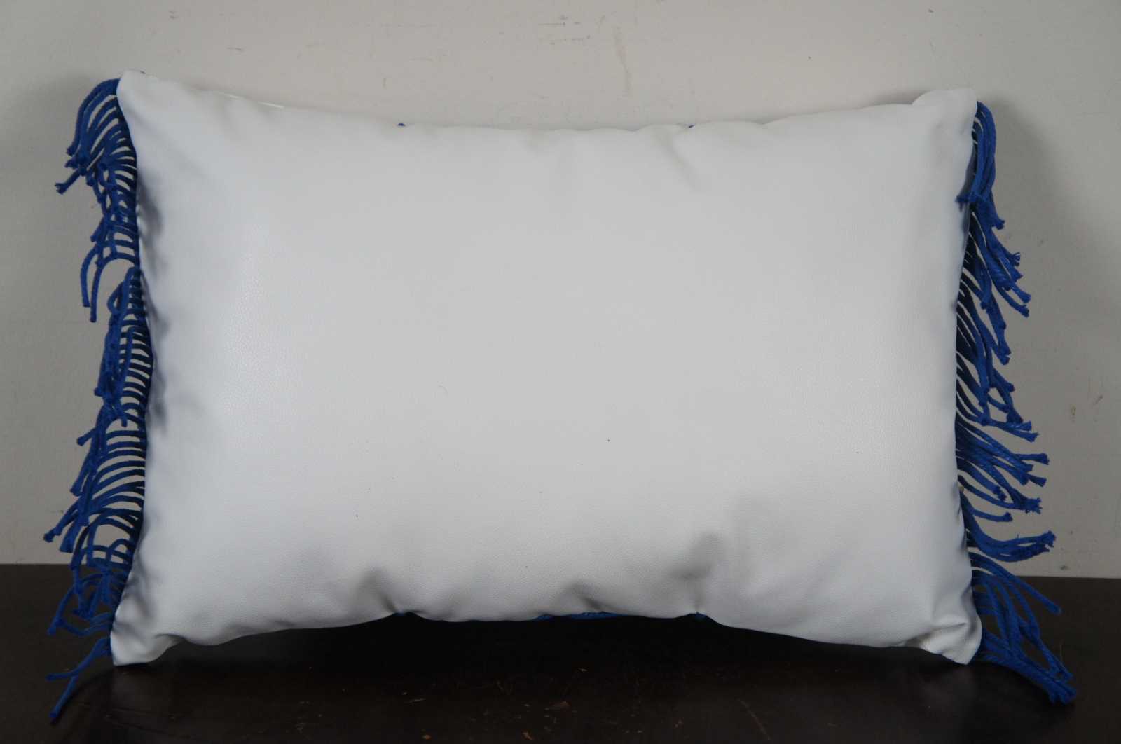 White and blue Frontgate lumbar pillow with blue macrame covering on one side and fringed edges.