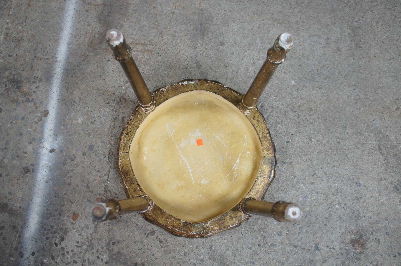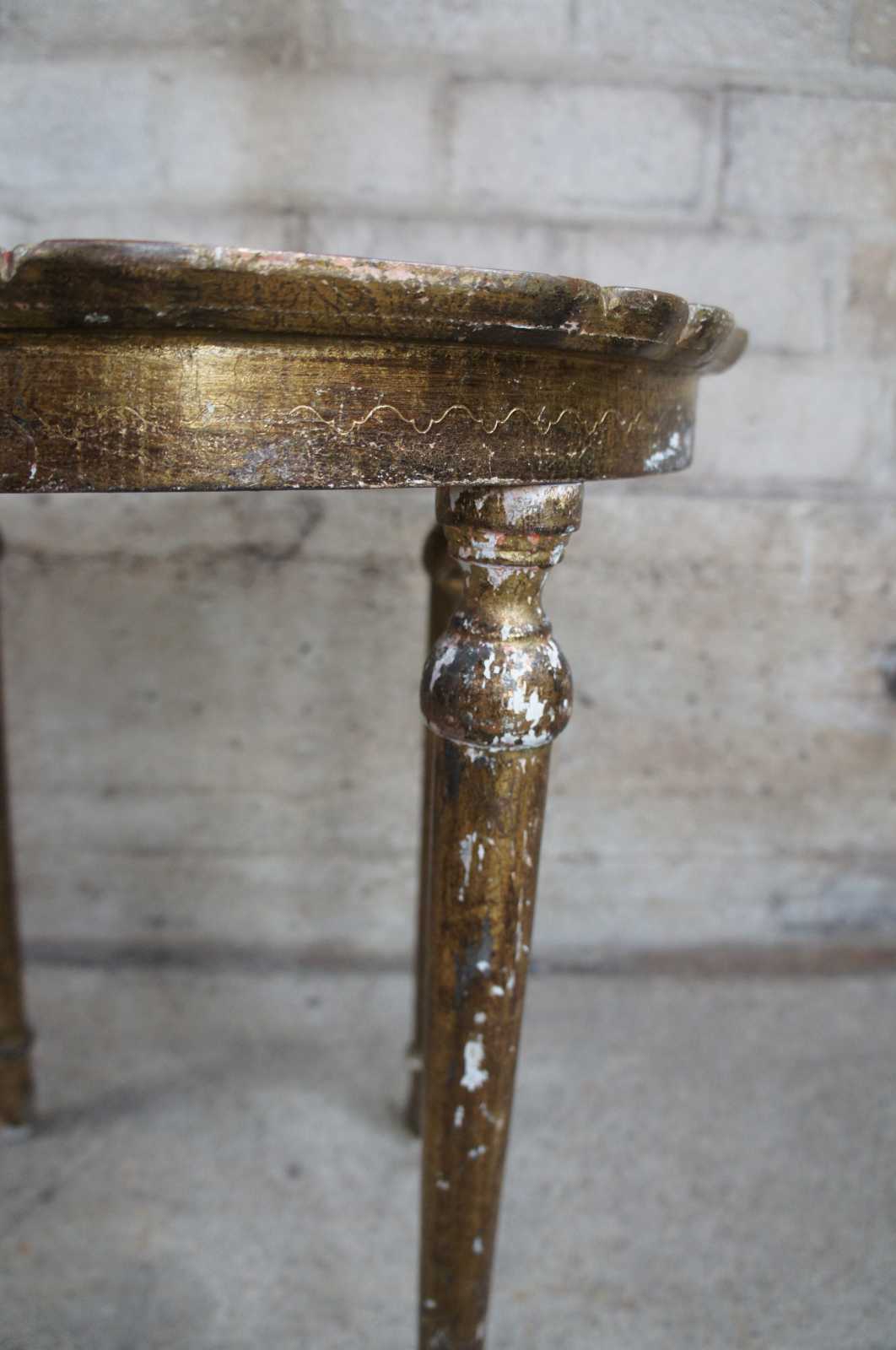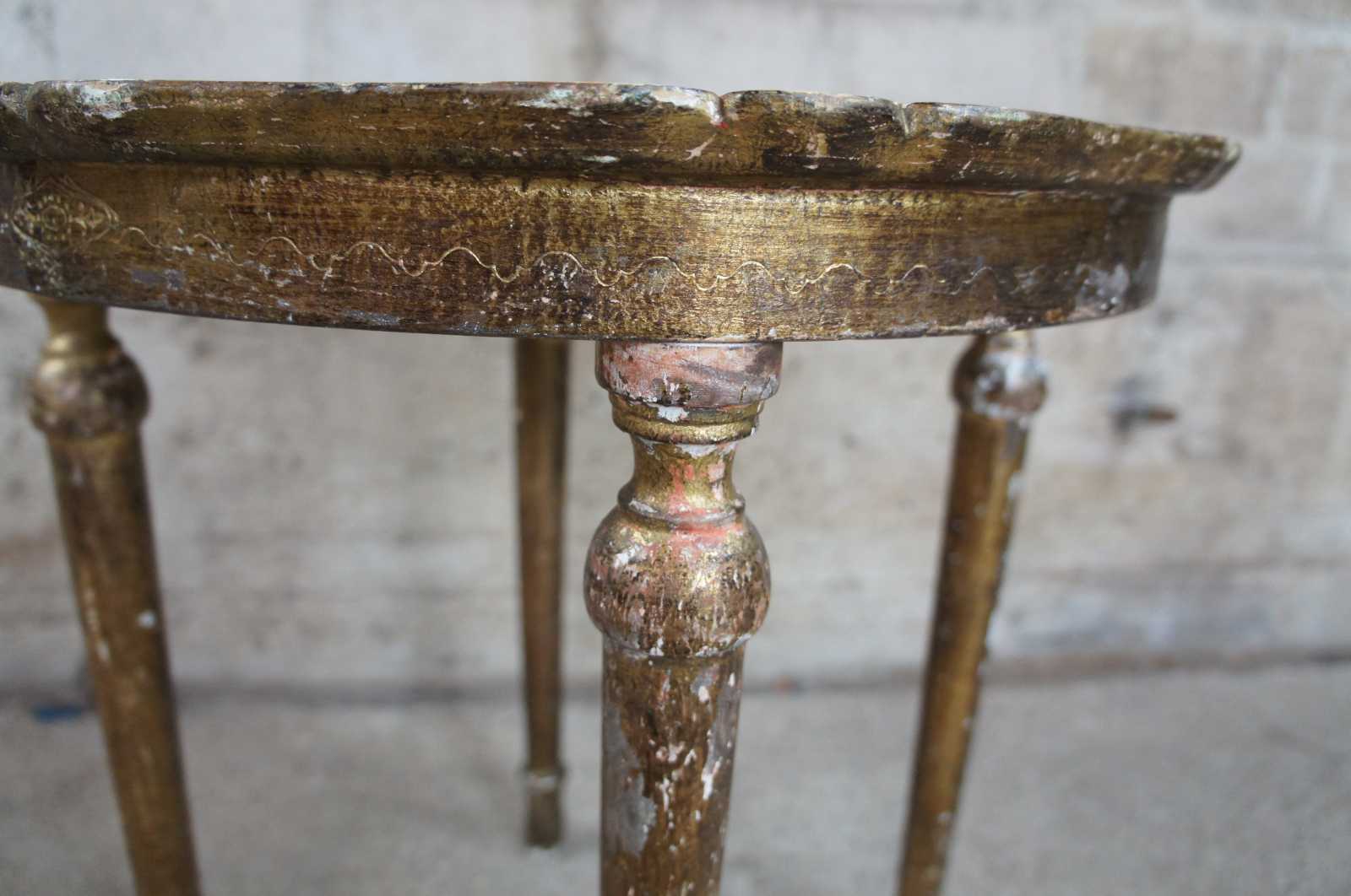 Circa 1928 antique Italian florentine toleware table. Features a scalloped top with fleur de lis design over four tapered legs.