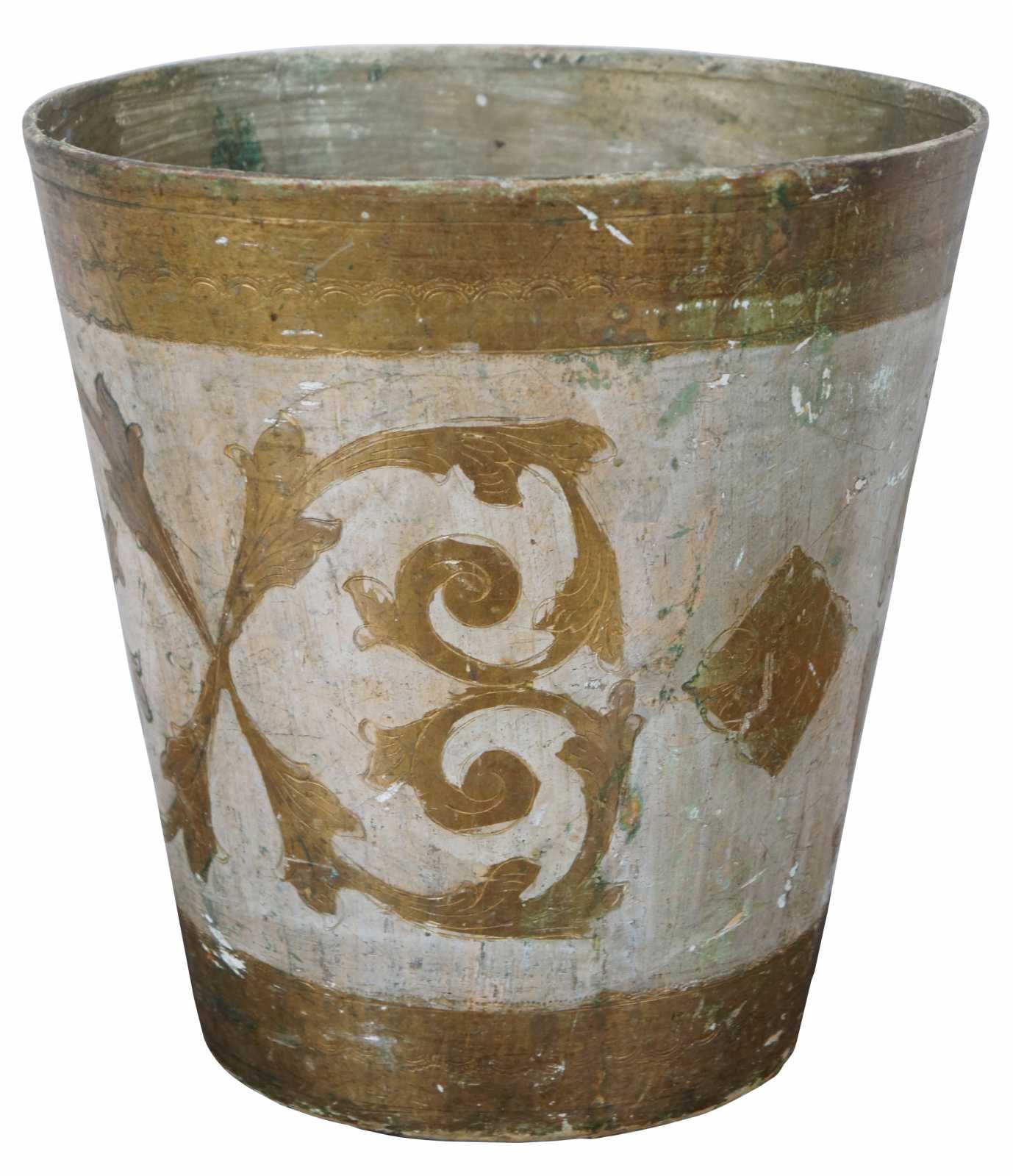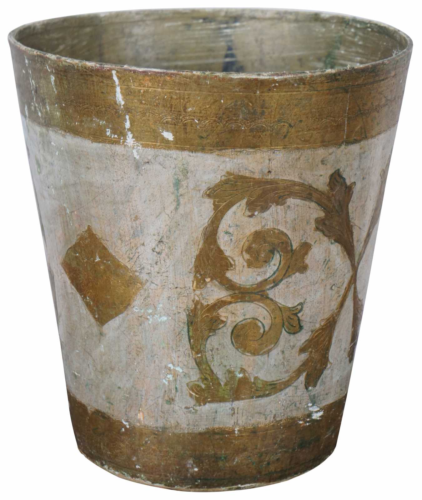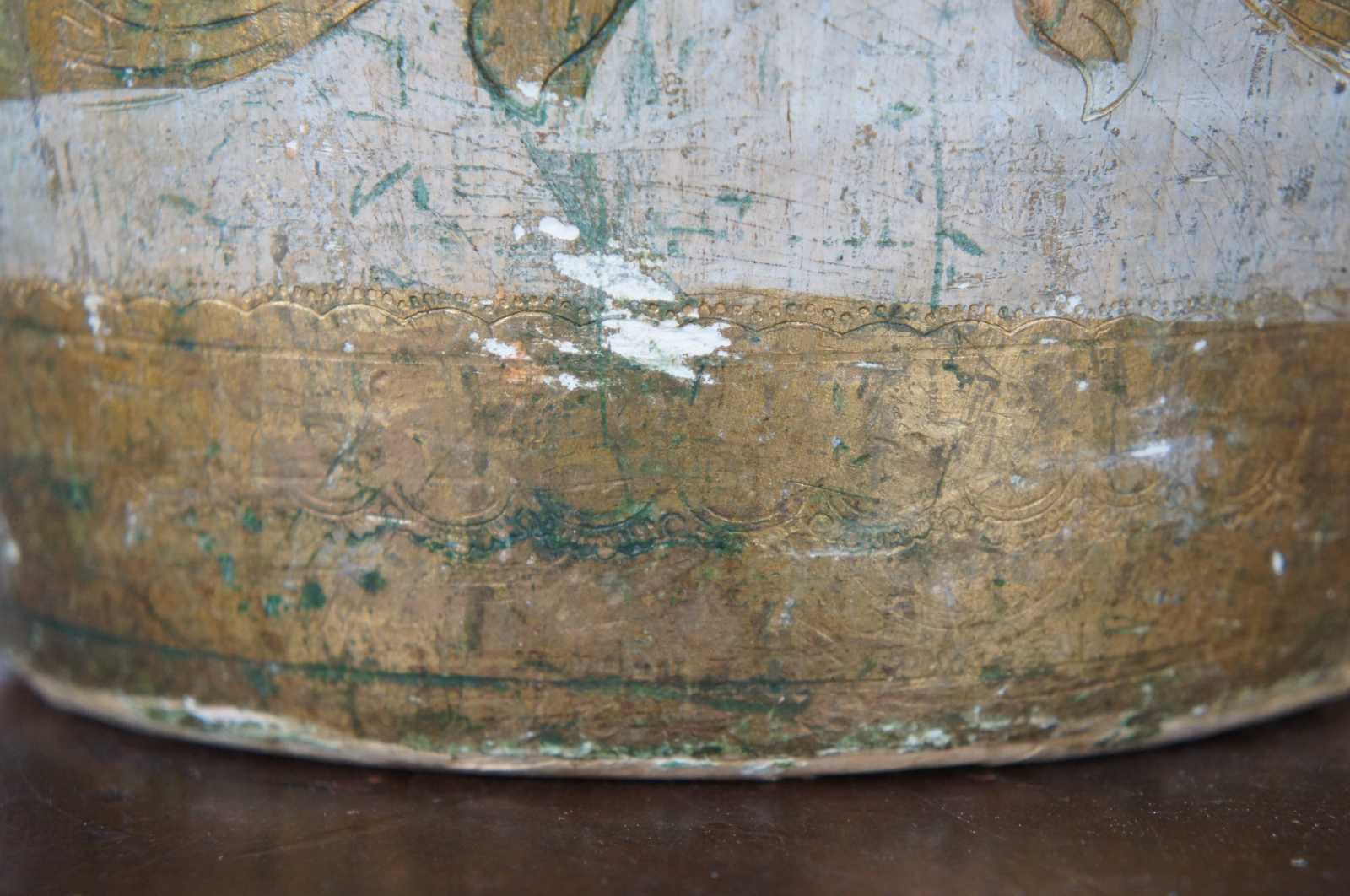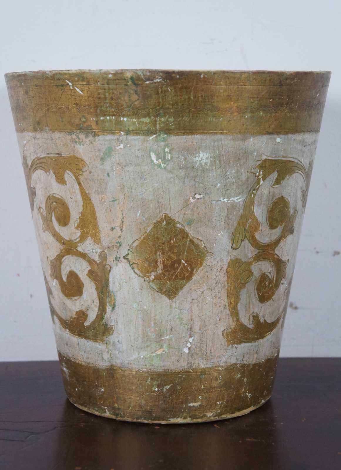 Vintage round white and gold painted Italian Florentine wood waste basket.