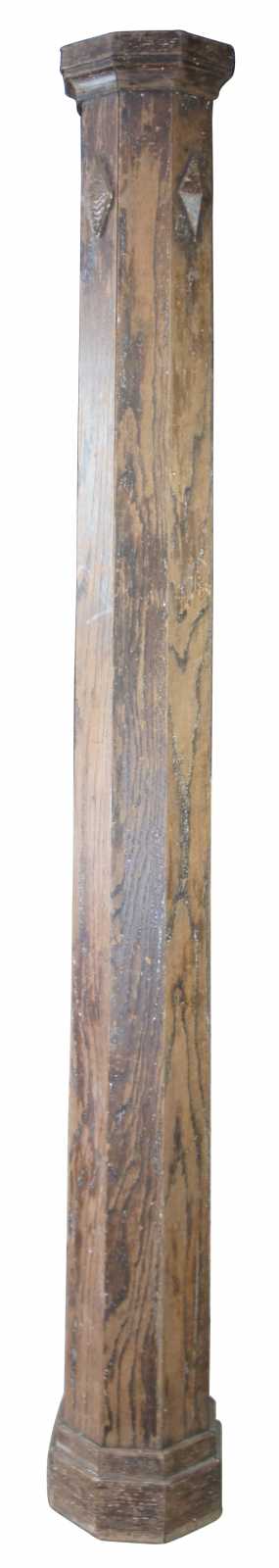 20th century relaimed architectural column or pillar. Made of oak, featuring eight sides with a slight taper from bottom to top and accented with diamond embellishment carvings.