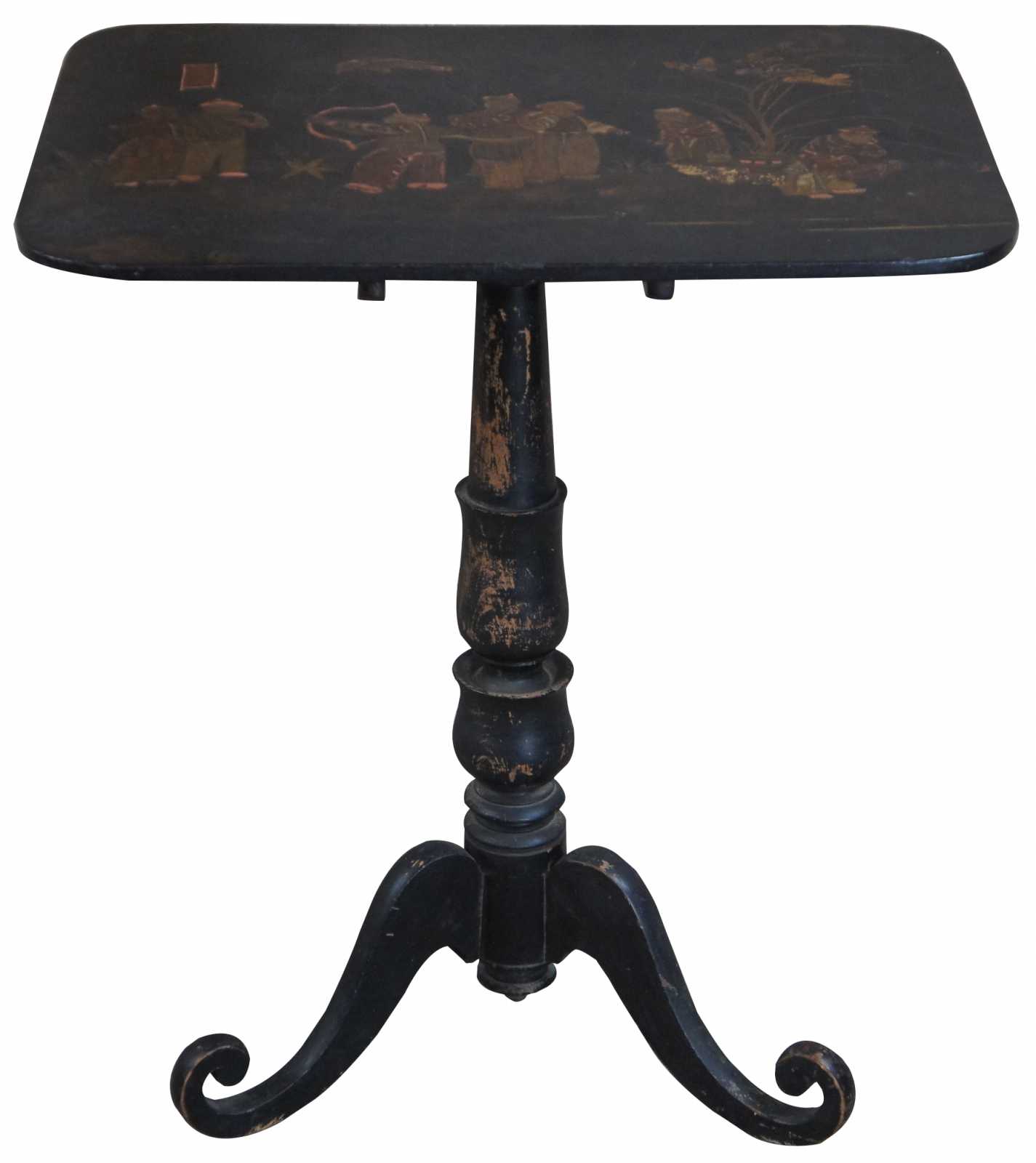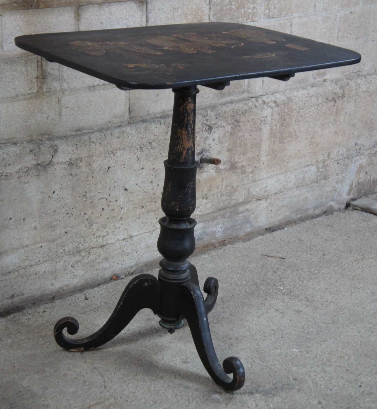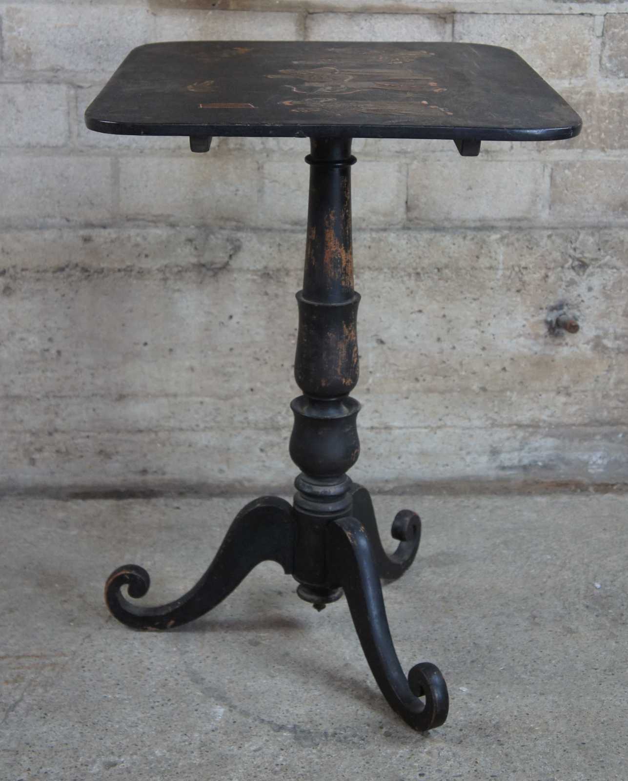 Antique Regency jappanned tilt top table. Features a distressed back finish with figures along the table top. Depicts a carnival scene with musicians, smokers and bow and arrow.