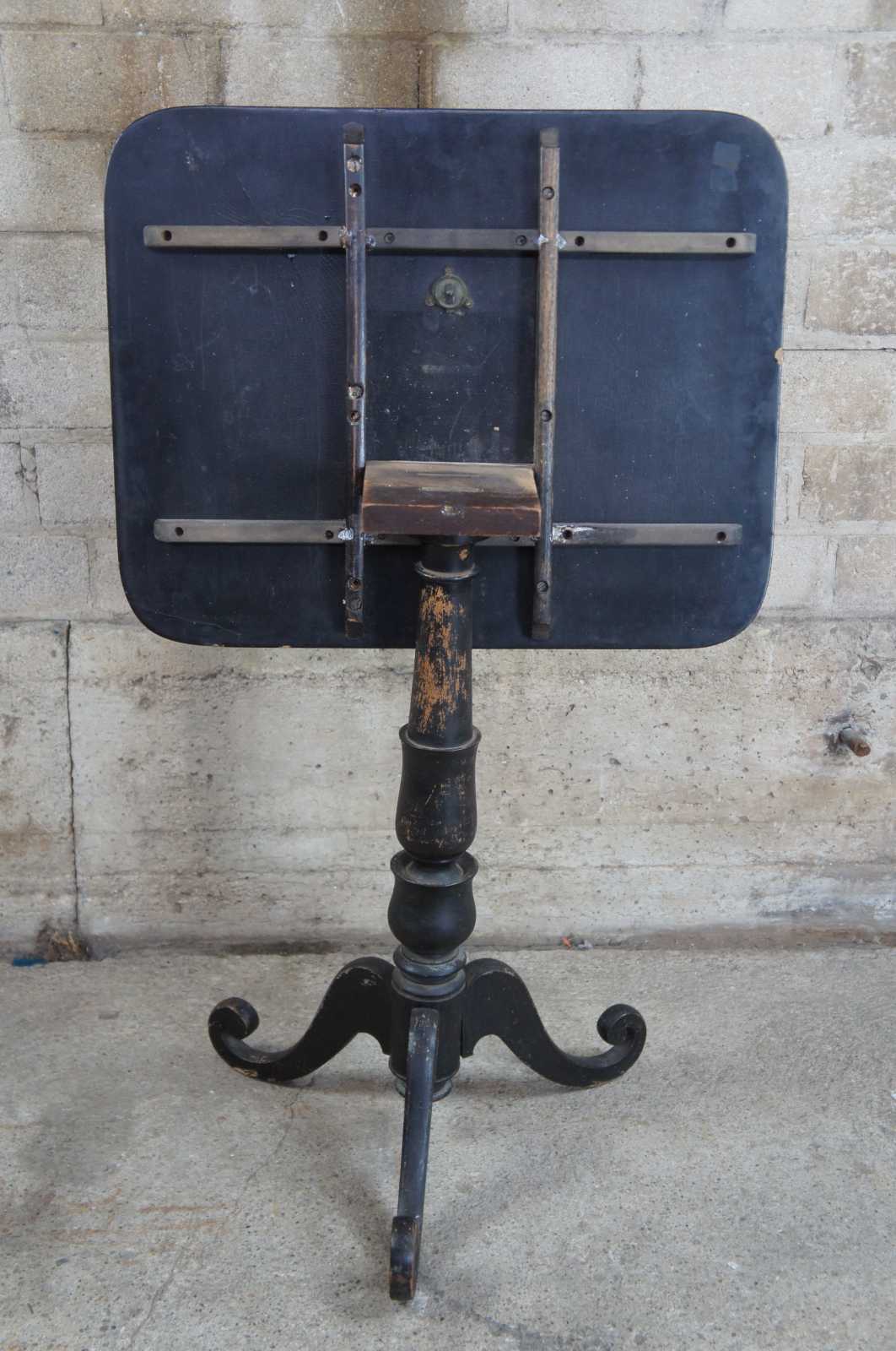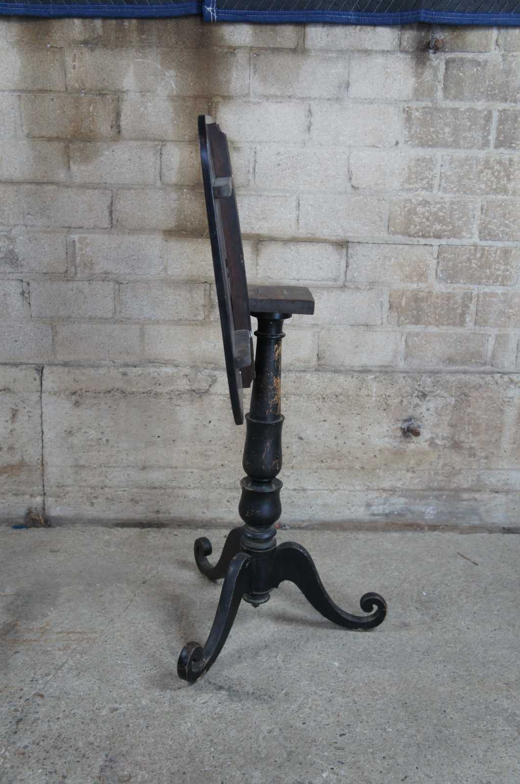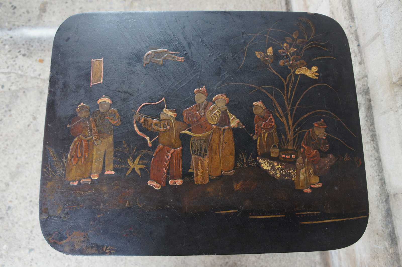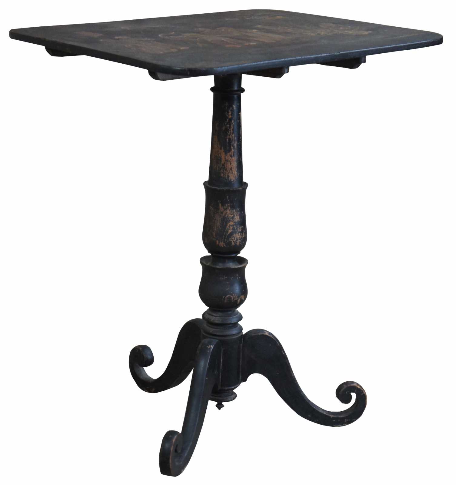 Antique Regency jappanned tilt top table. Features a distressed back finish with figures along the table top. Depicts a carnival scene with musicians, smokers and bow and arrow.