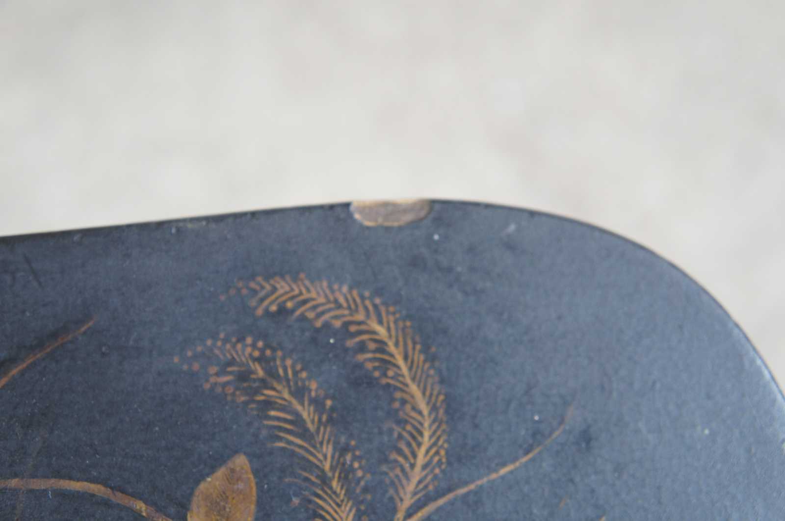 Good overall, wear and distressing, paint / finish loss on base, nick along edge, see pictures.