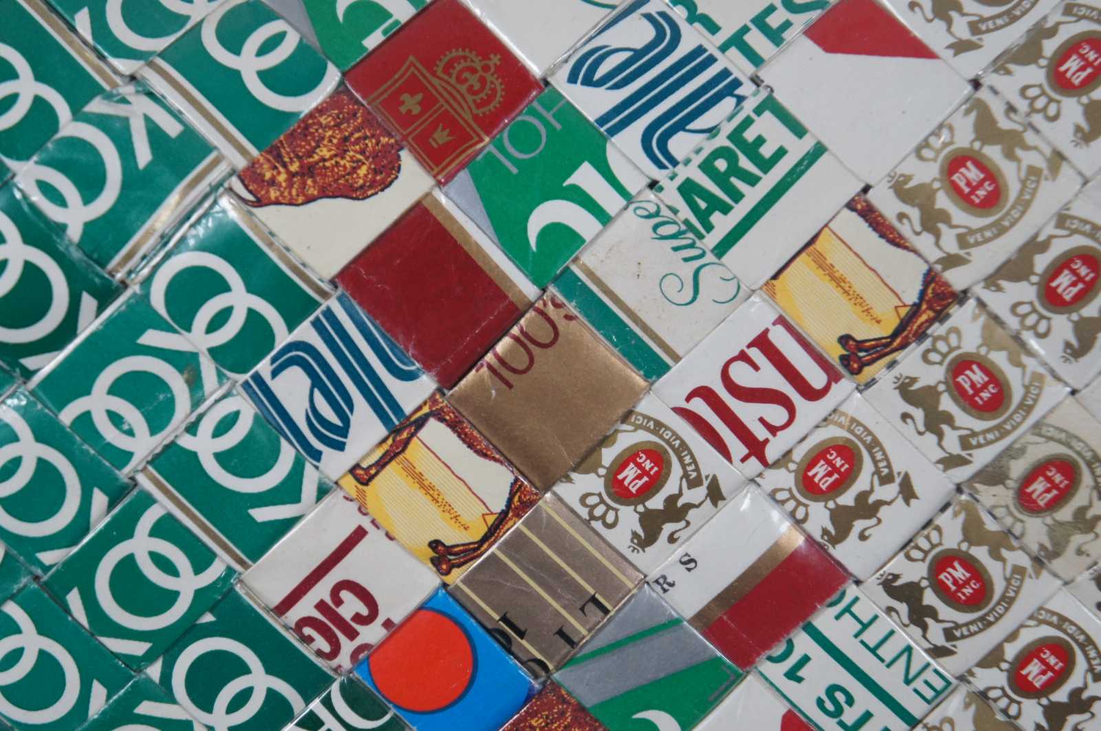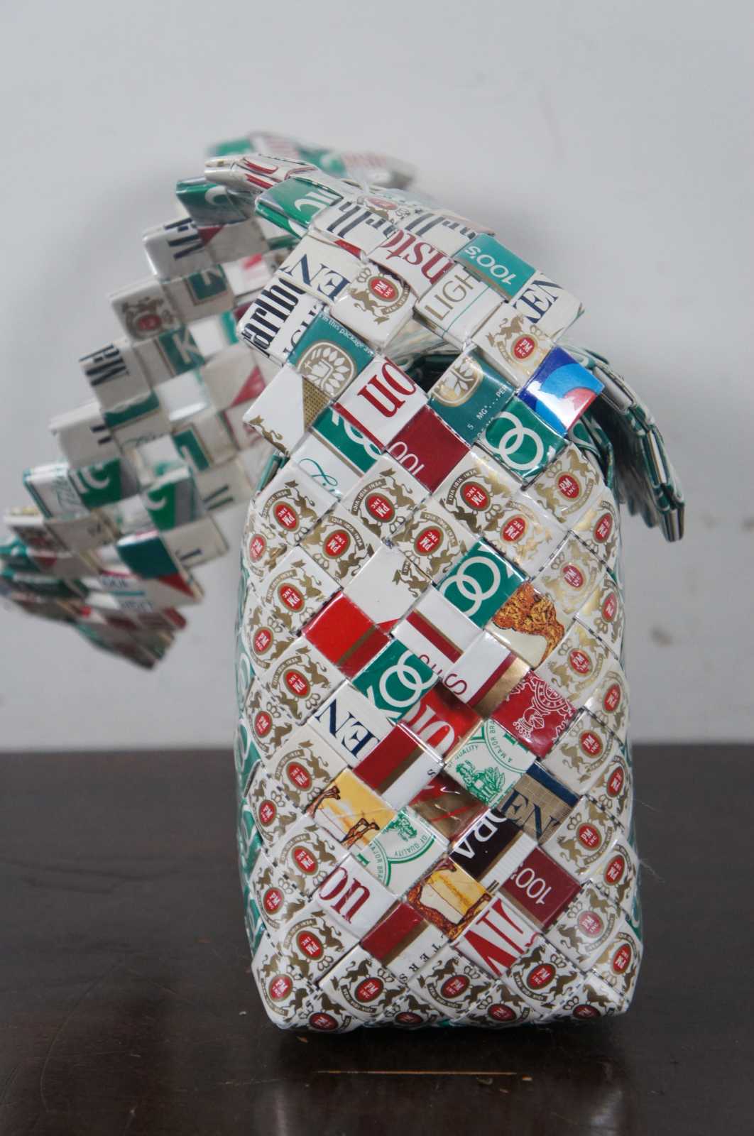 Vintage prison art shoulder bag intricately crafted out of up-cycled cigarette packages.
