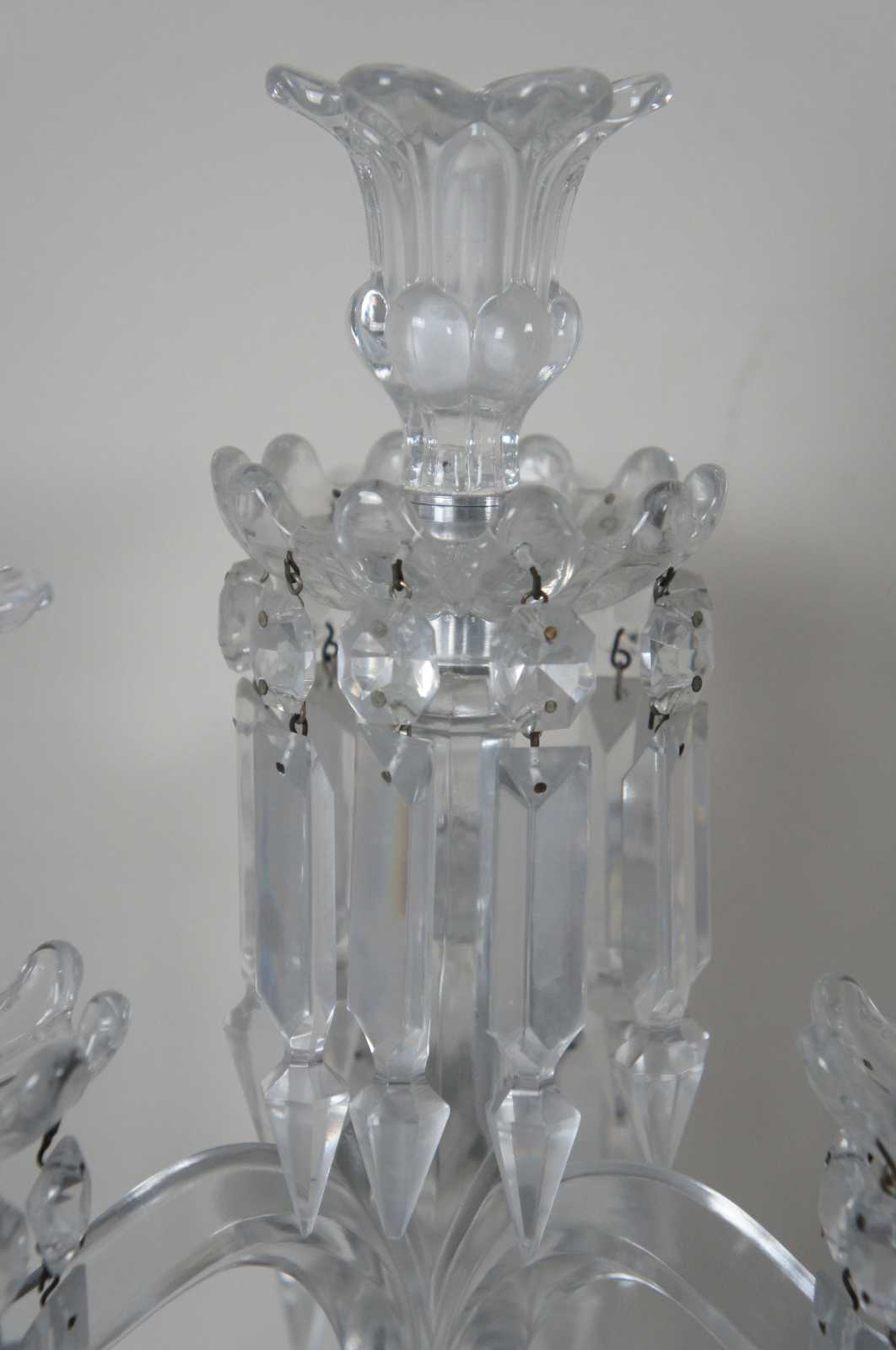 Pair of elegant Baccarat cut crystal candelabras with four flower shaped bobeches / candle holders surrounded by drop crystals / prisms. Marked on base. Made in France.