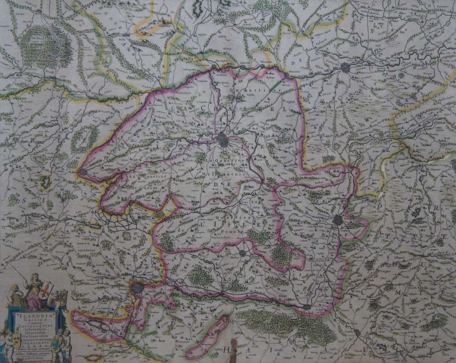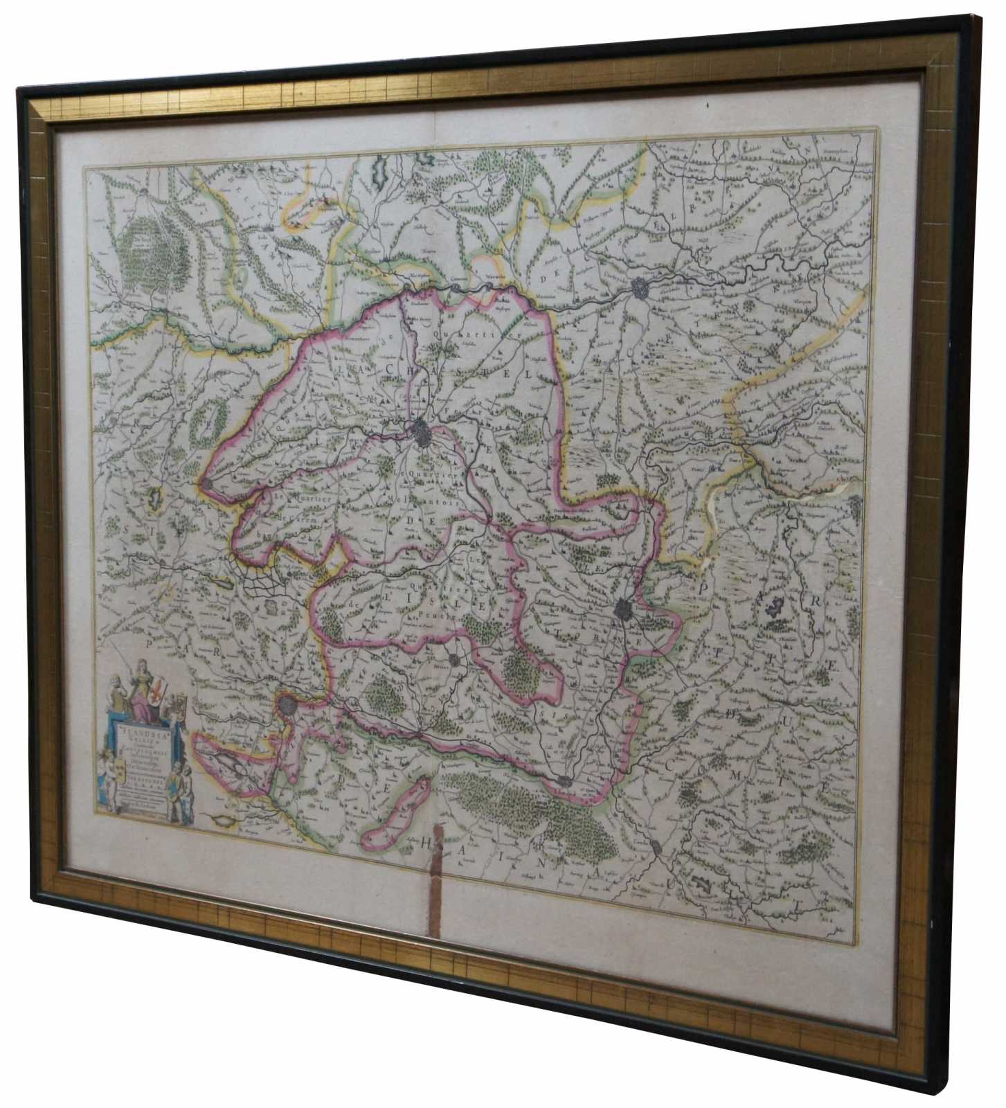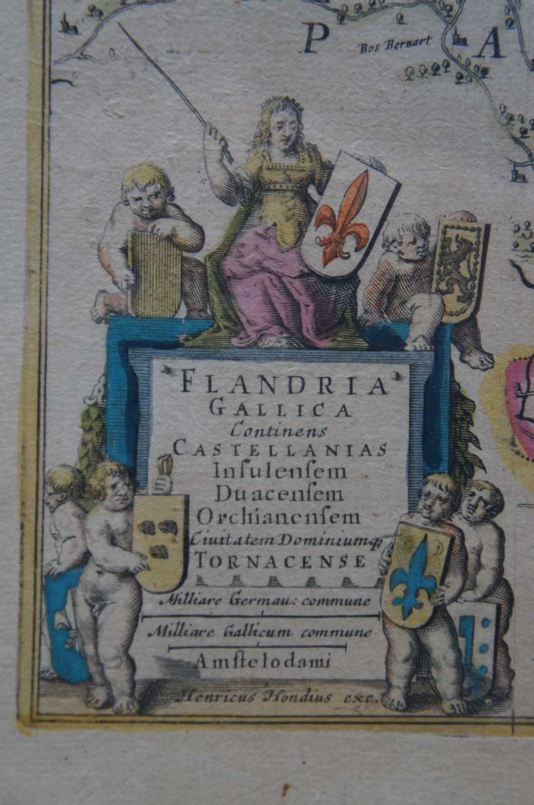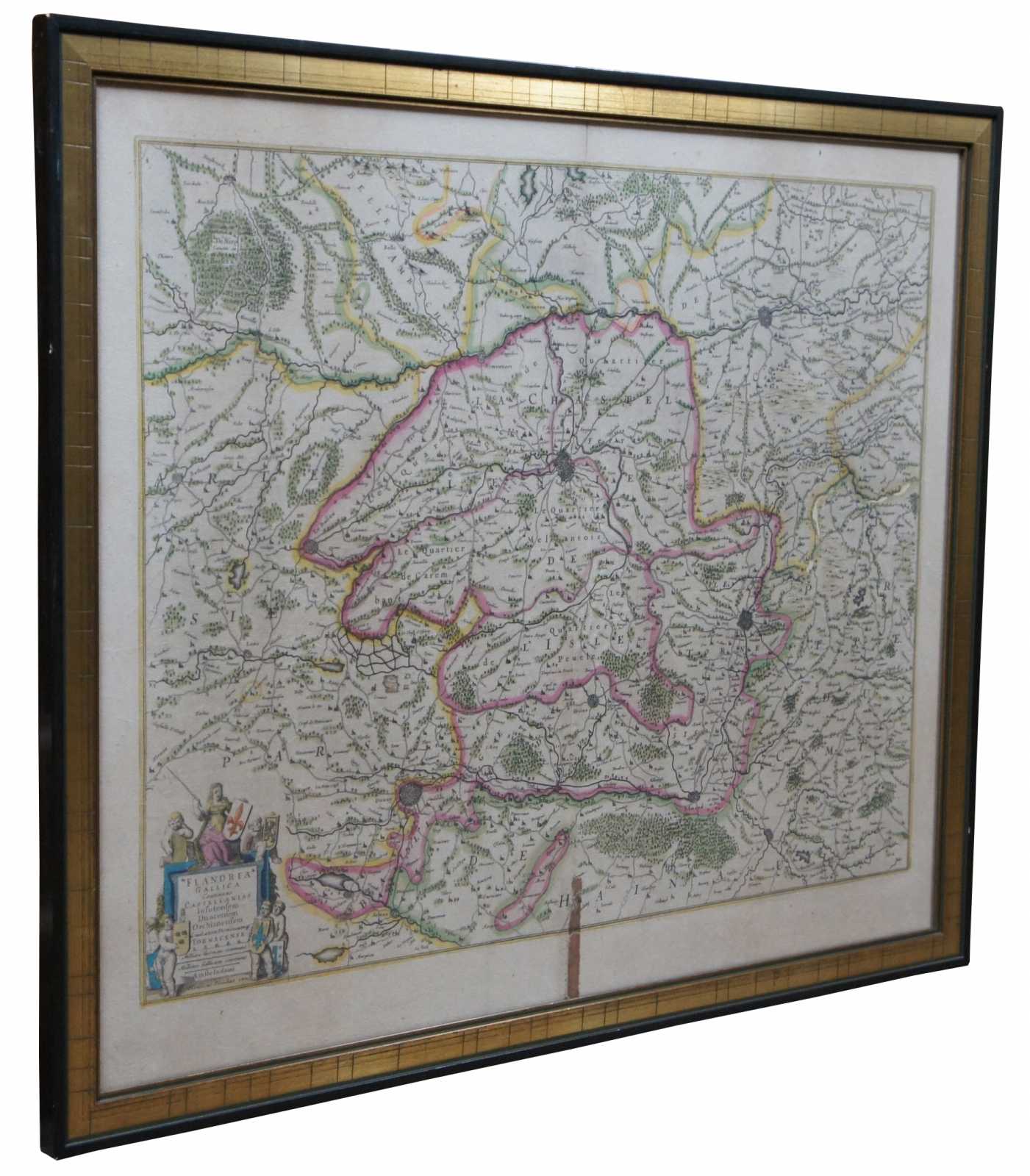 Antique hand colored map of Flanders, Belgium, circa 1630, engraved by Henricus Hondius. “Henricus Hondius II (1597 – 16 August 1651) was a Dutch engraver, cartographer, and publisher. He was born in Amsterdam, the son of the famous cartographer Jodocus Hondius who had started a map-making business in the city. Henricus obtained the original plates of the Mercator 1569 world map, and published a 1606 version of it. After his father died in 1612 Henricus co-ran the business with his brother-in-law.[1] In 1621 opened his own company in his hometown. The first time his name was mentioned in an atlas was in 1623 when he published the fifth edition of the Mercator-Hondius atlas. After 1628 Henricus partnered with the cartographer Jan Janssonius and together they continued the business. He died in Amsterdam.