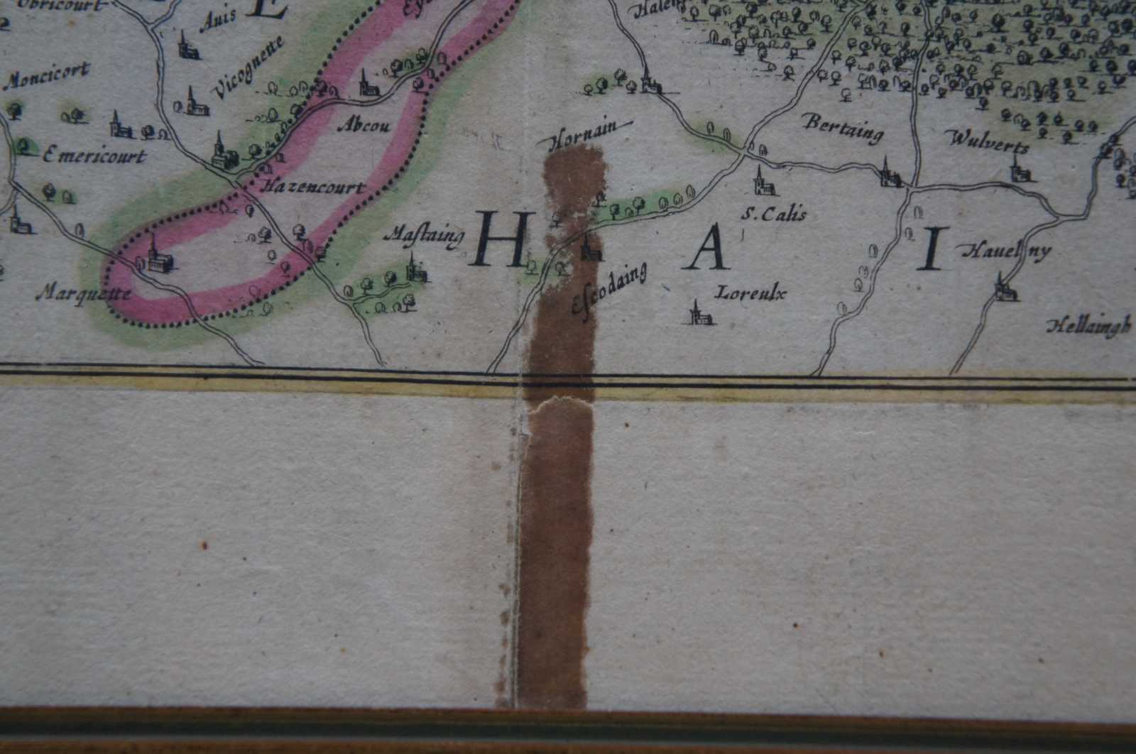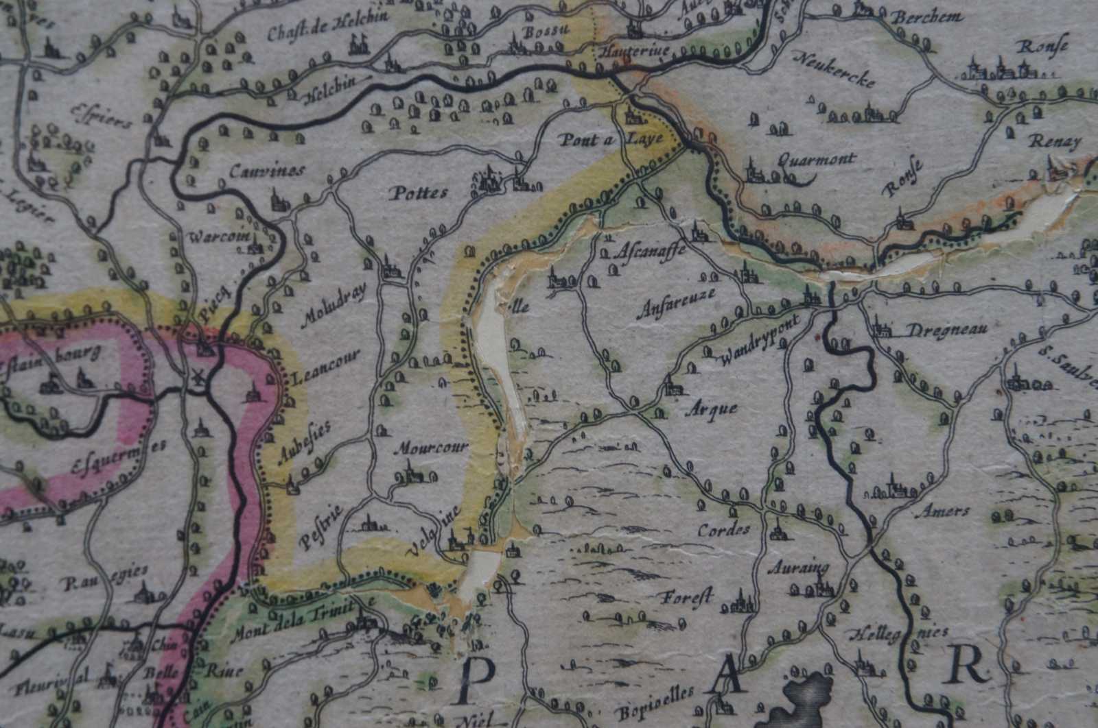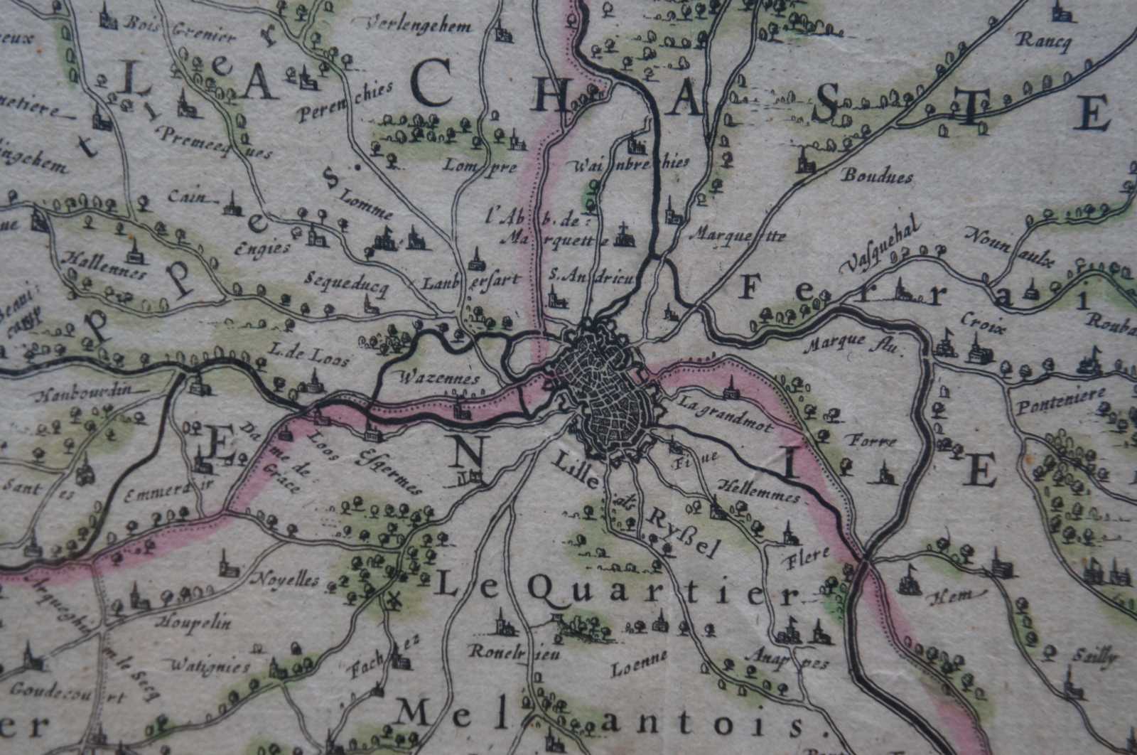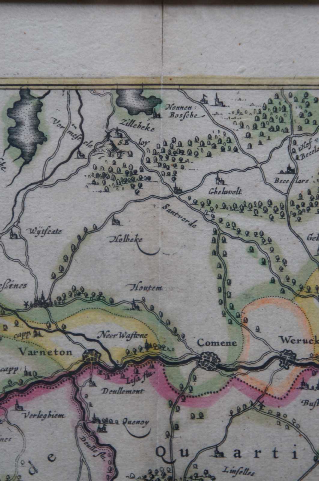 Antique hand colored map of Flanders, Belgium, circa 1630, engraved by Henricus Hondius. “Henricus Hondius II (1597 – 16 August 1651) was a Dutch engraver, cartographer, and publisher. He was born in Amsterdam, the son of the famous cartographer Jodocus Hondius who had started a map-making business in the city. Henricus obtained the original plates of the Mercator 1569 world map, and published a 1606 version of it. After his father died in 1612 Henricus co-ran the business with his brother-in-law.[1] In 1621 opened his own company in his hometown. The first time his name was mentioned in an atlas was in 1623 when he published the fifth edition of the Mercator-Hondius atlas. After 1628 Henricus partnered with the cartographer Jan Janssonius and together they continued the business. He died in Amsterdam.