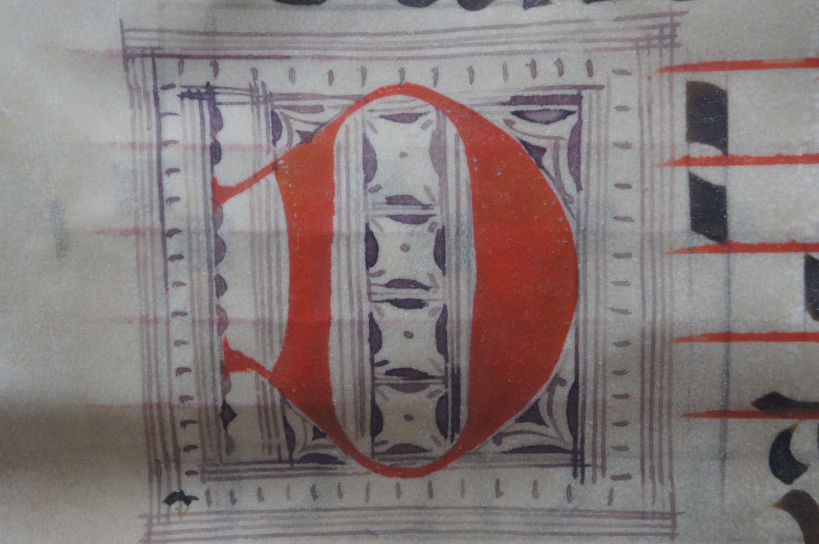 Framed 17th century Roman Catholic sheet music hand written in Latin on vellum in red and black ink.