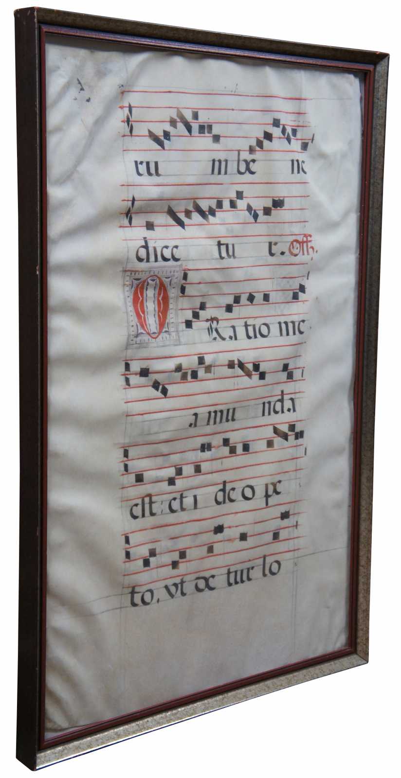 Framed 17th century Roman Catholic sheet music hand written in Latin on vellum in red and black ink.