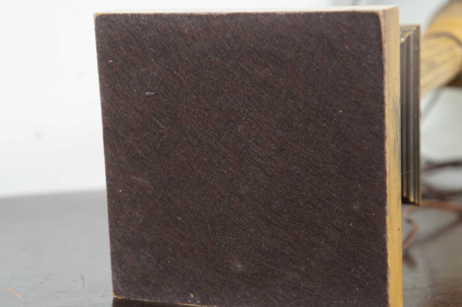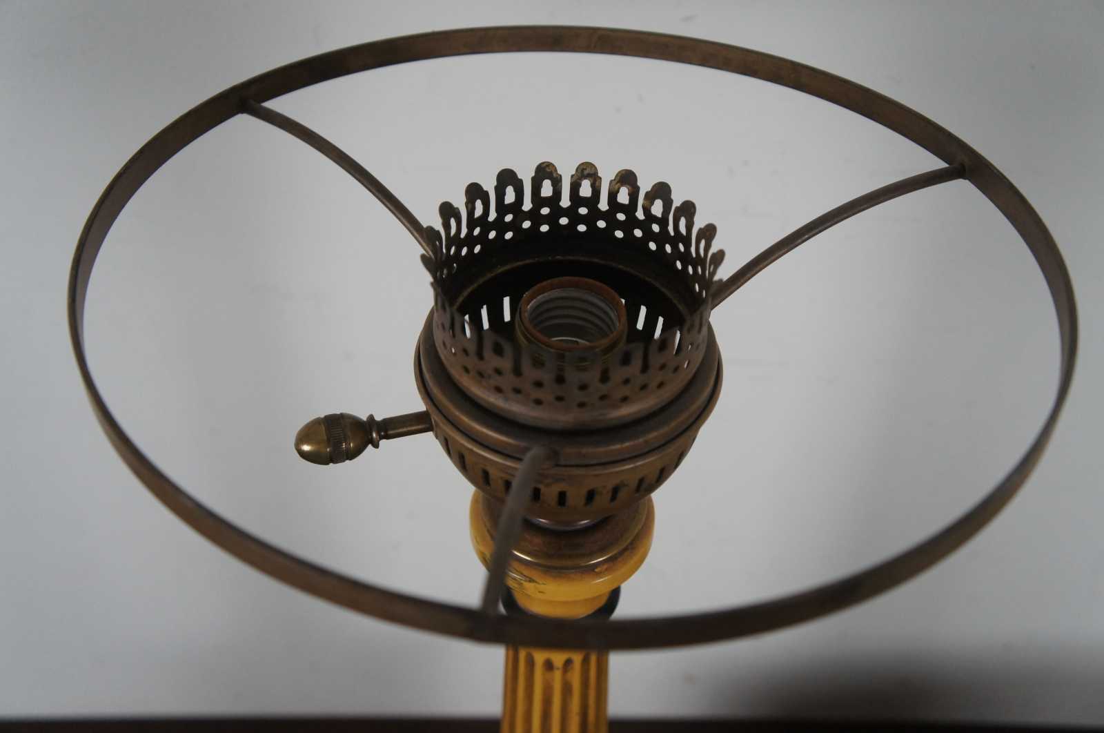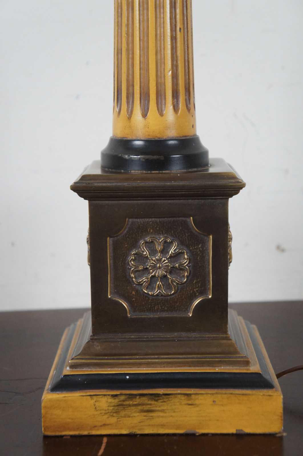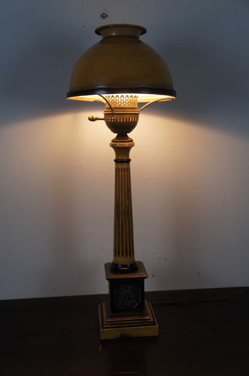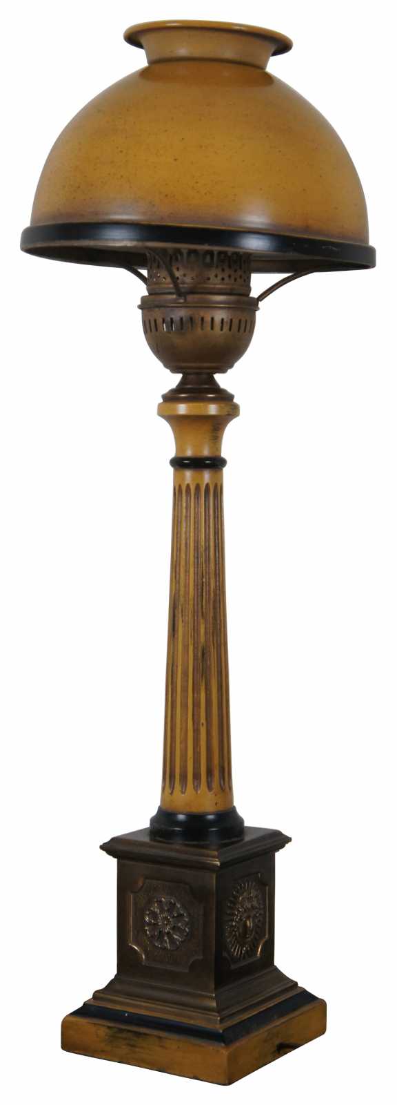 Vintage Grecian column shaped table lamp with neoclassical motifs around the base, oil lamp style top with hurricane and painted yellow metal toleware shade.