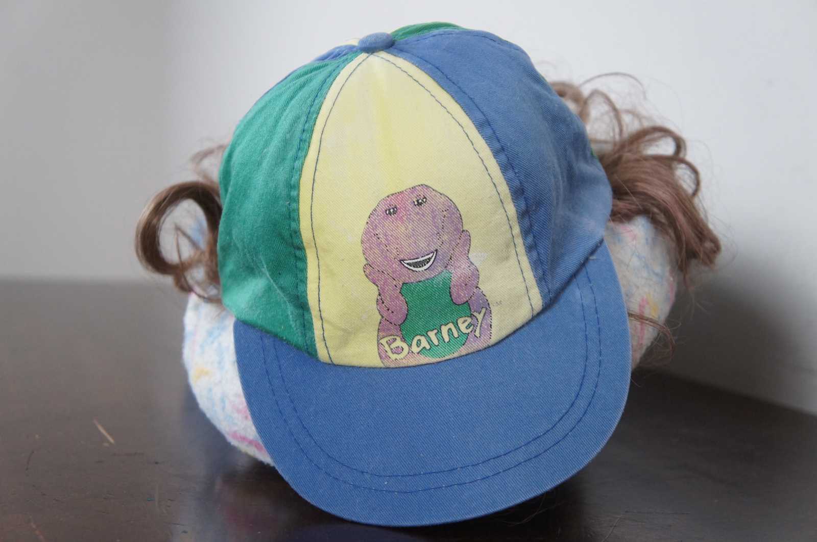 Vintage 1990’s time out doll dressed in a pastel shirt, denim overalls, red and blue sneakers, and a Barney the Dinosaur hat over curly brown hair. Hat marked The Lyons Group 1992.