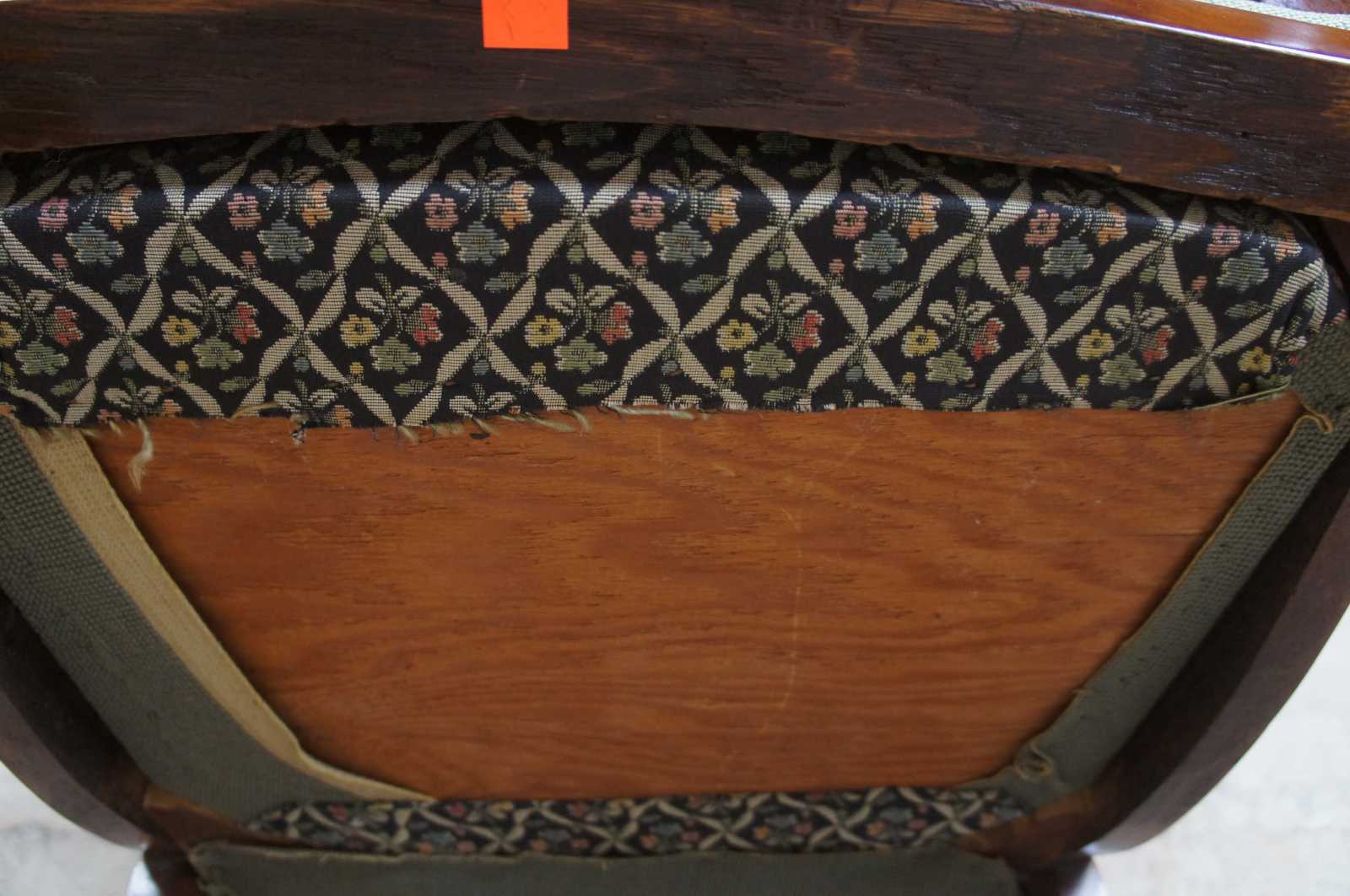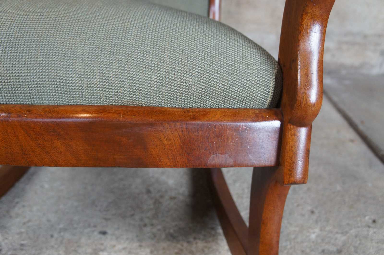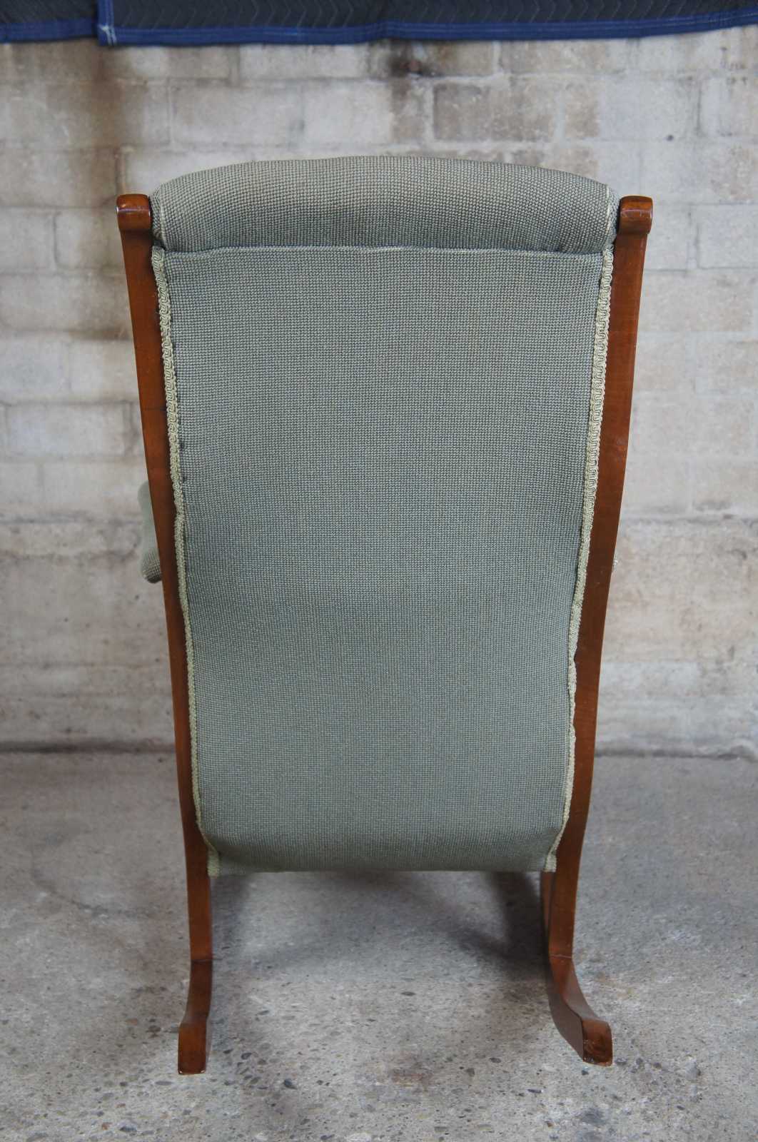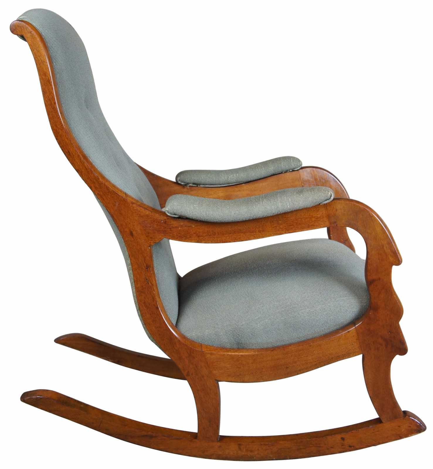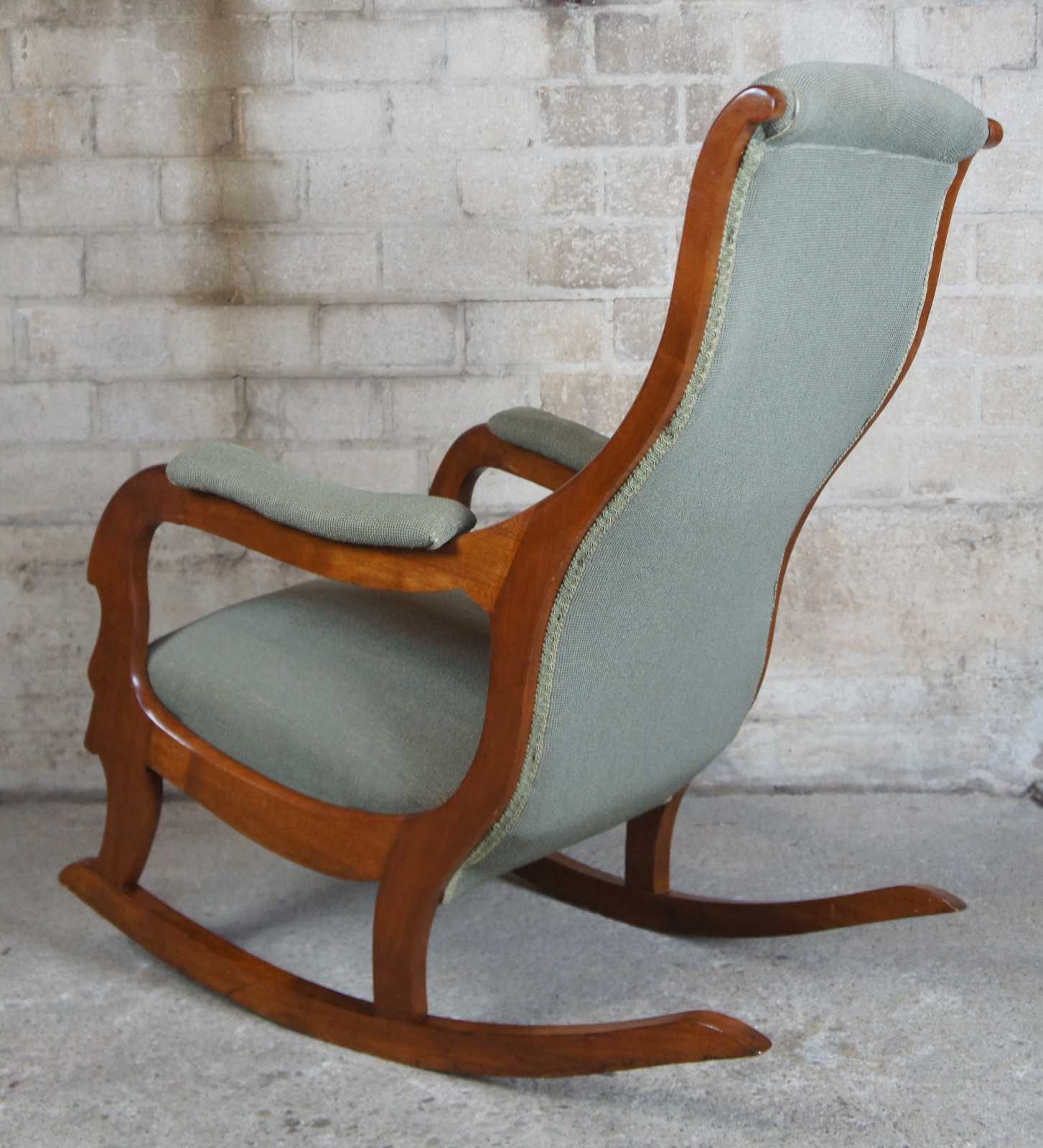 Antique American Empire / Victorian rocking chair. Made of mahogany with green needlepoint fabric and padded arms and tufted back.