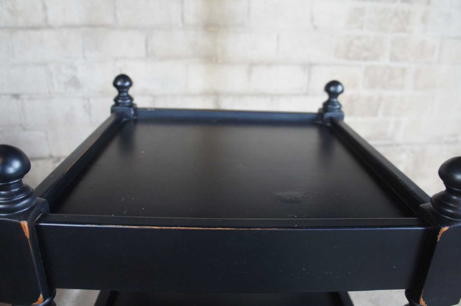 A quaint set of barley twist end tables. Features a 3 tier design with inset tops and a distressed finish. Drawing inspiration from Louis XIII and English styling