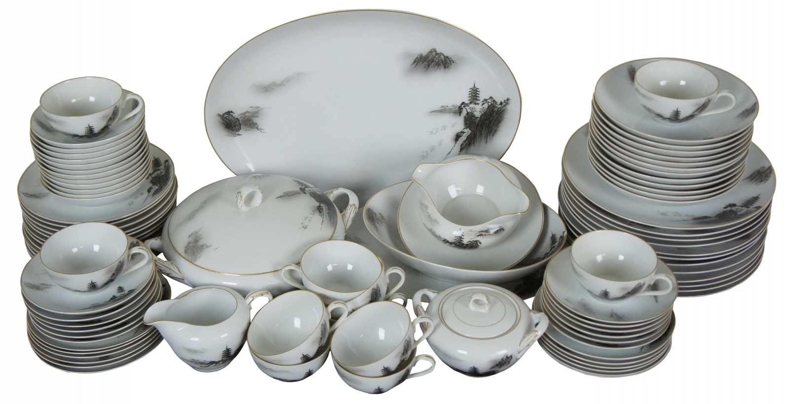 92 piece set of dinnerware by Fukagawa, pattern number 903, featuring a black and white pagoda tower on a rocky hillside or landscape with gilded edges.