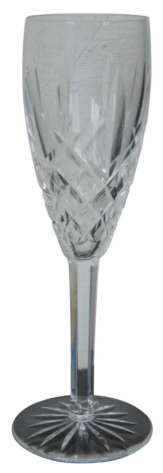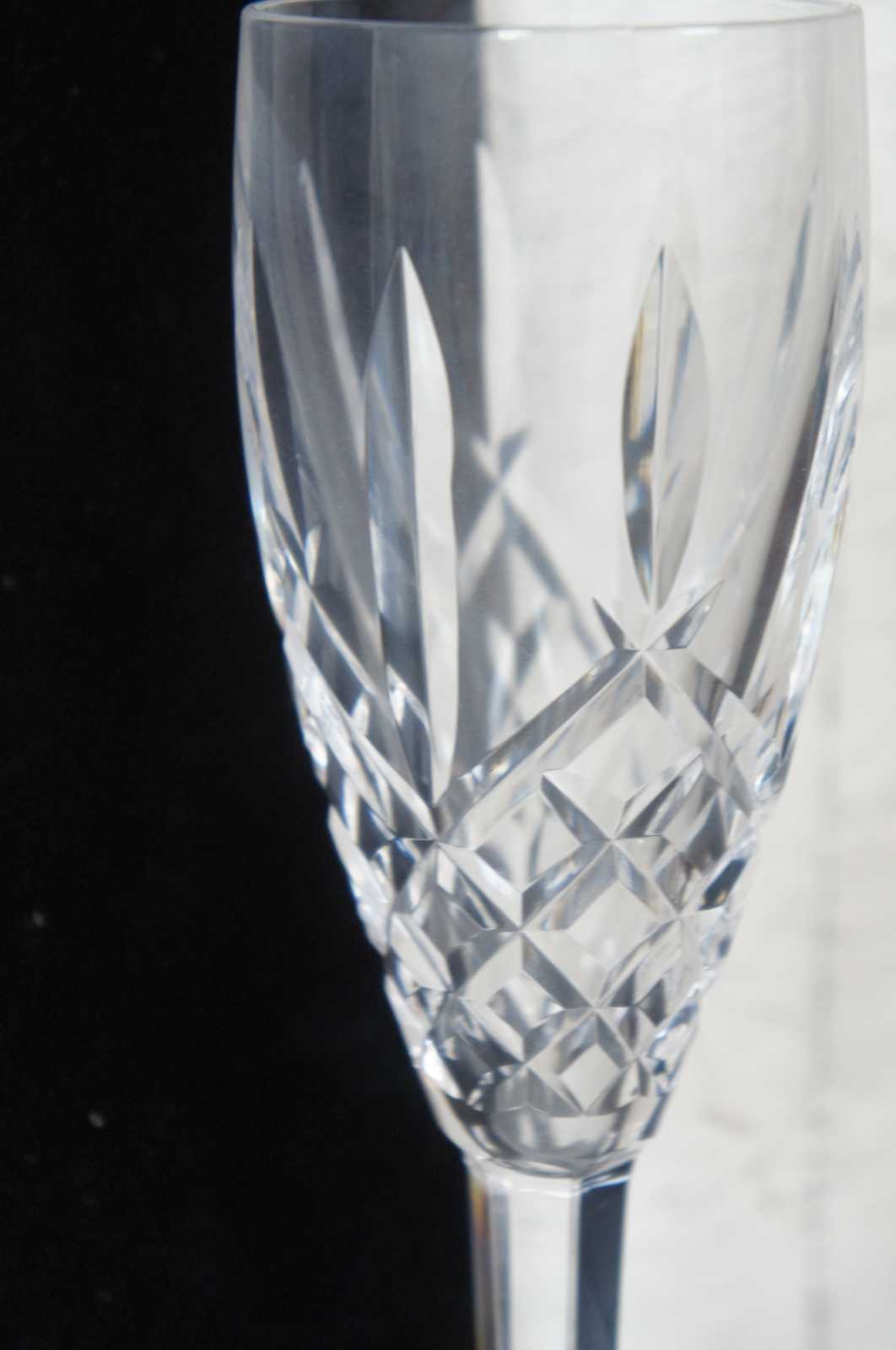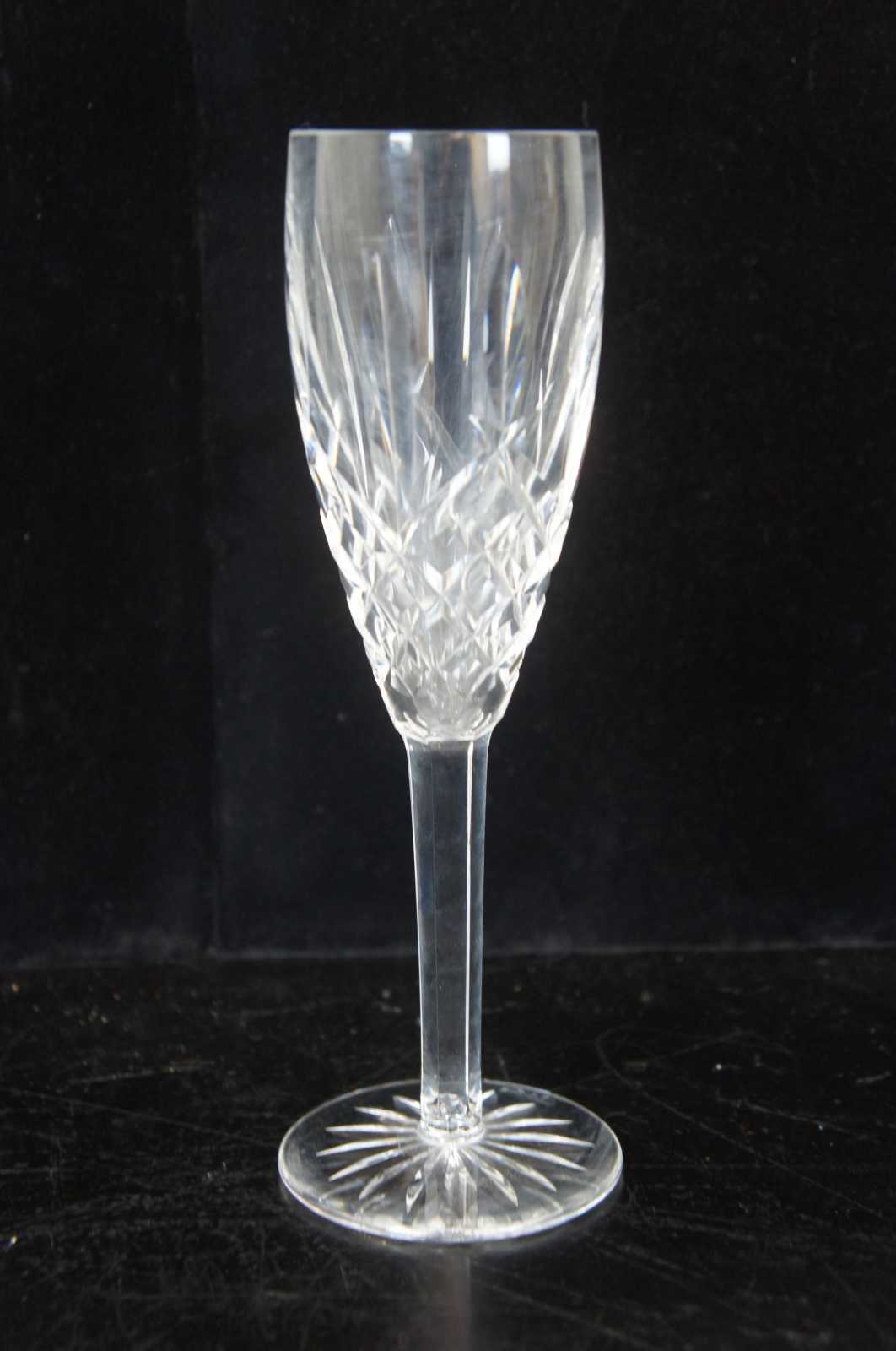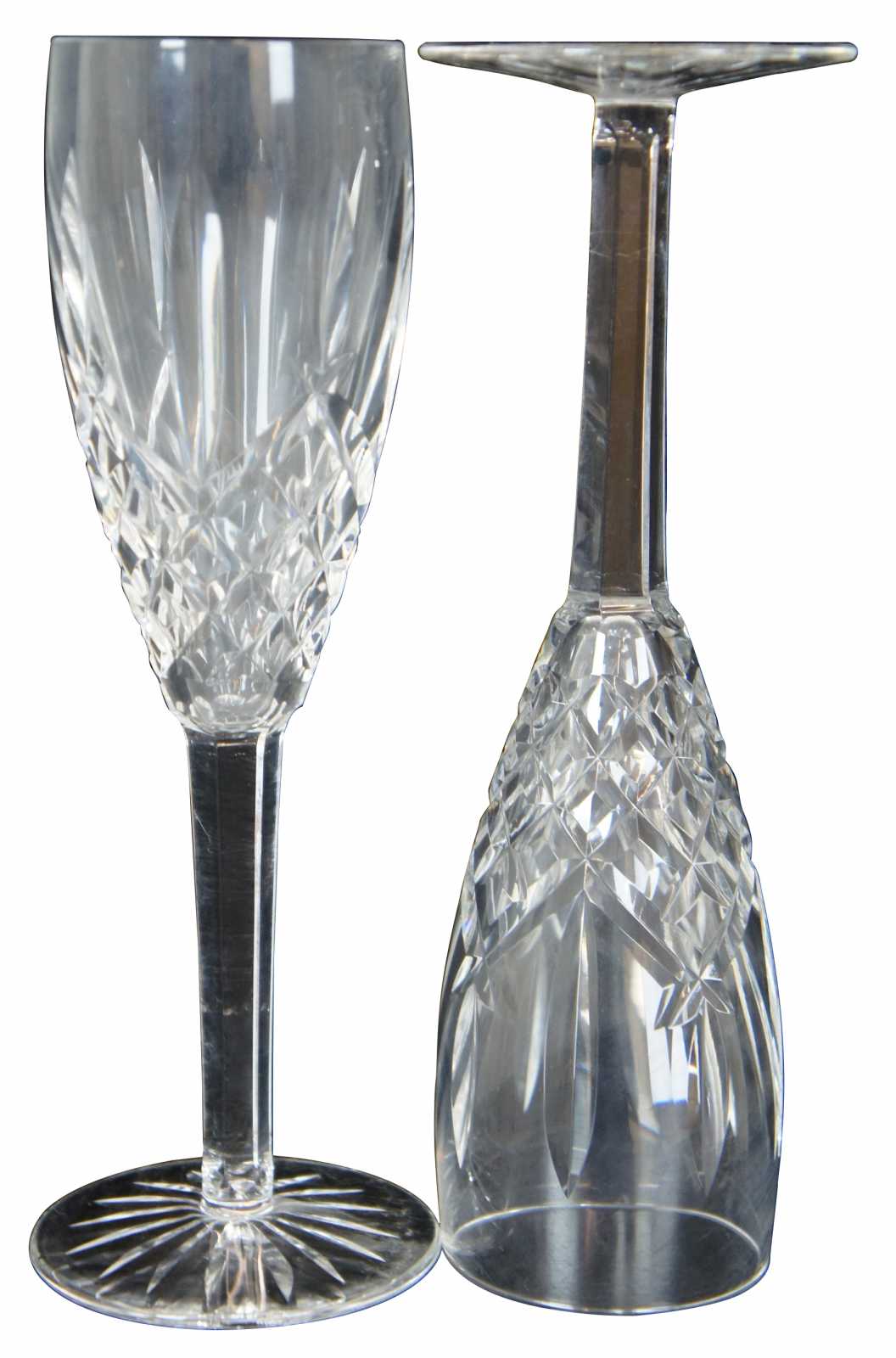 Set of 8 Waterford crystal champagne flutes in the Araglin pattern with cut criss cross and verticals, faceted stem, and a cut foot.
