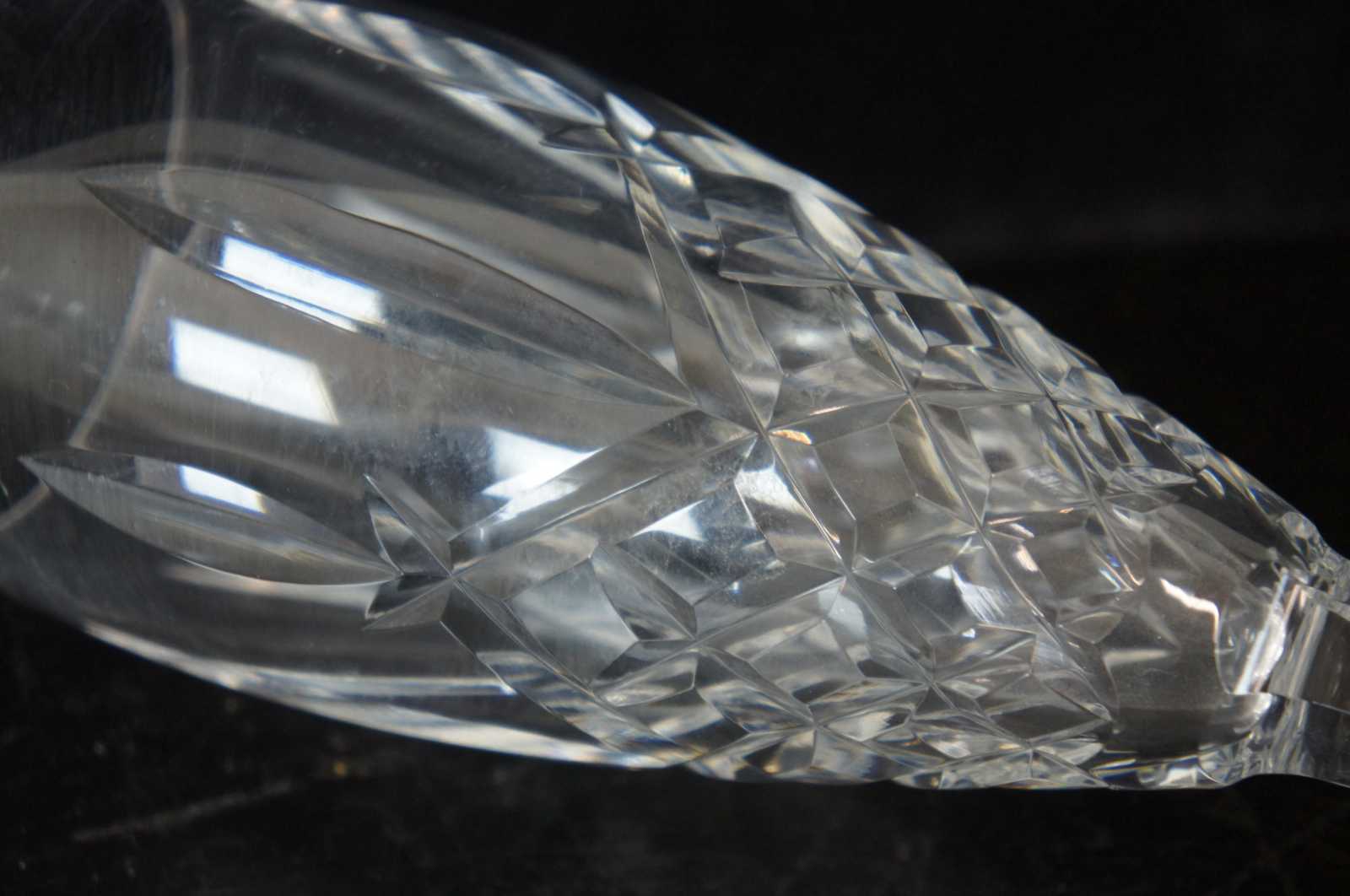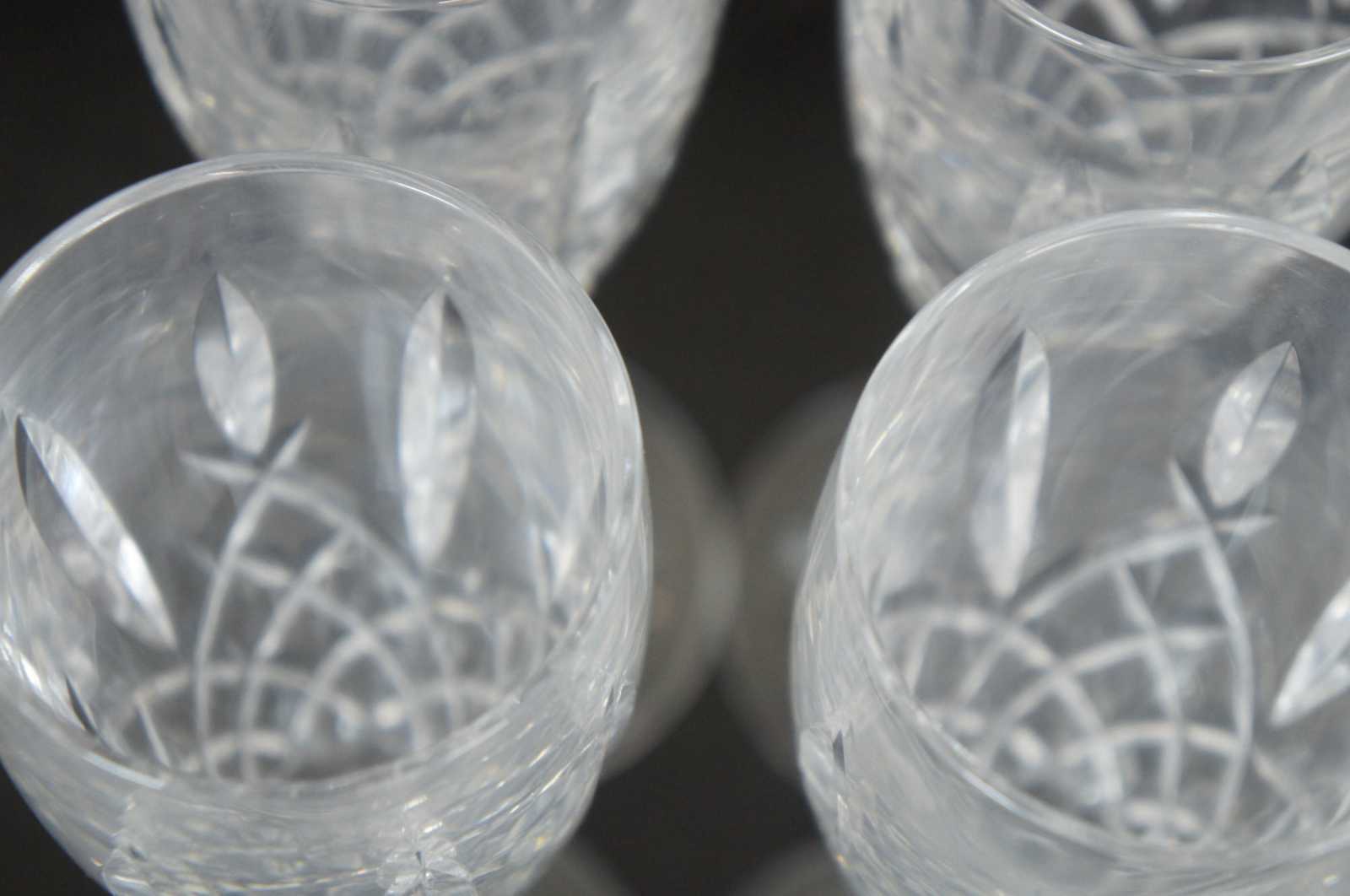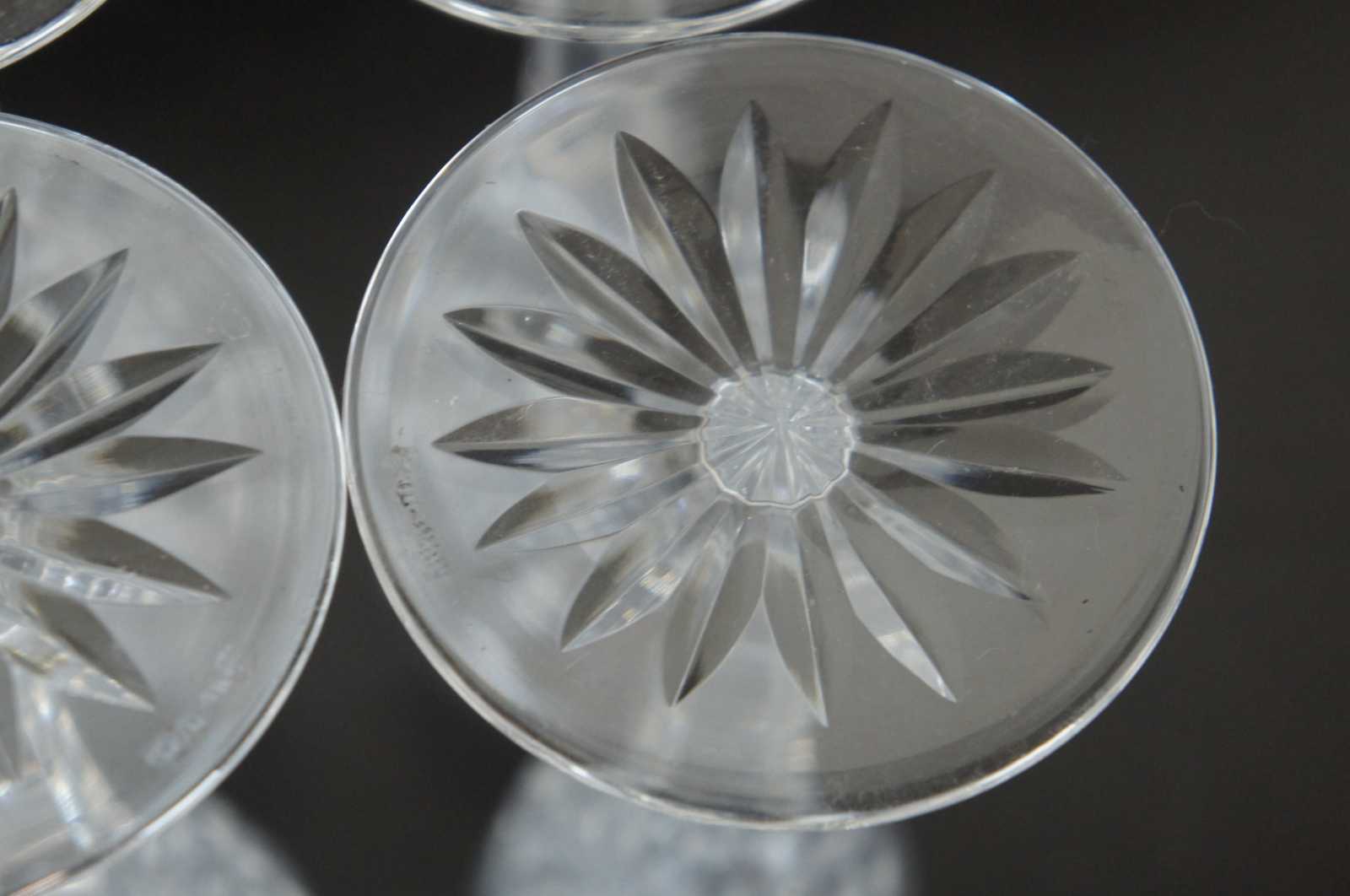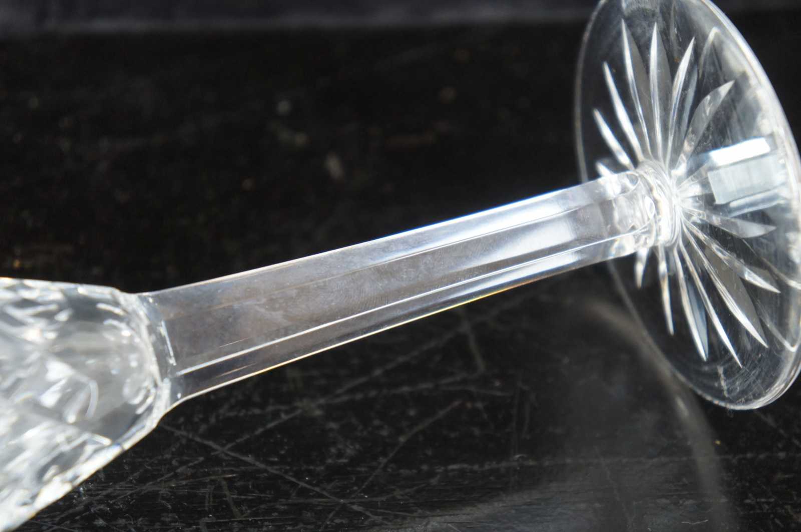 Set of 8 Waterford crystal champagne flutes in the Araglin pattern with cut criss cross and verticals, faceted stem, and a cut foot.