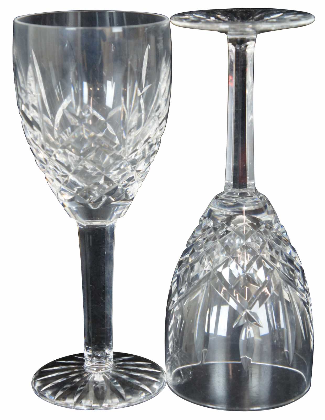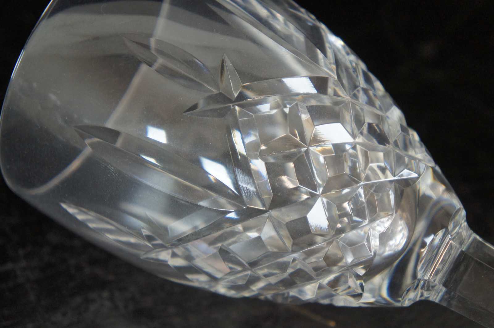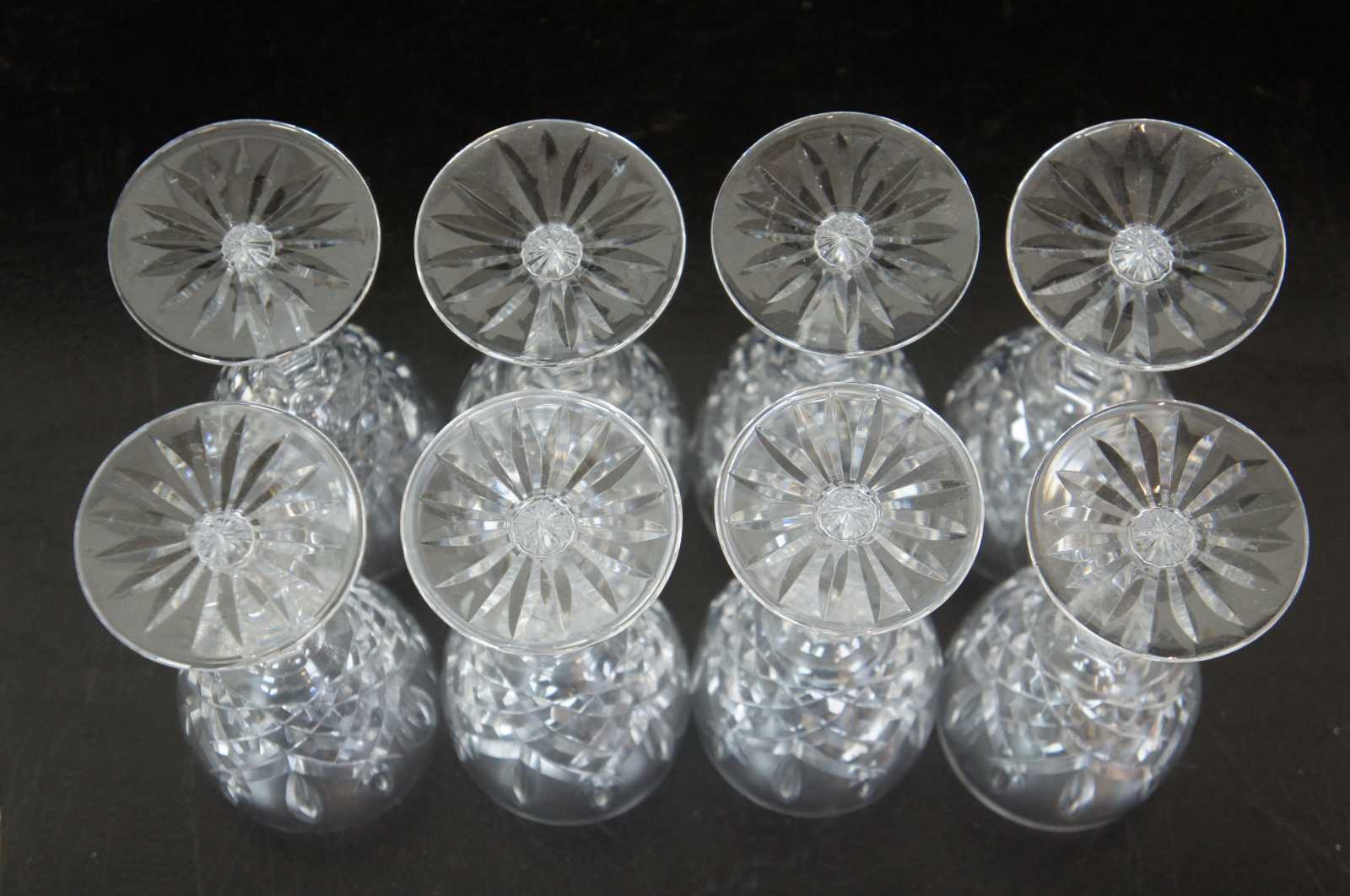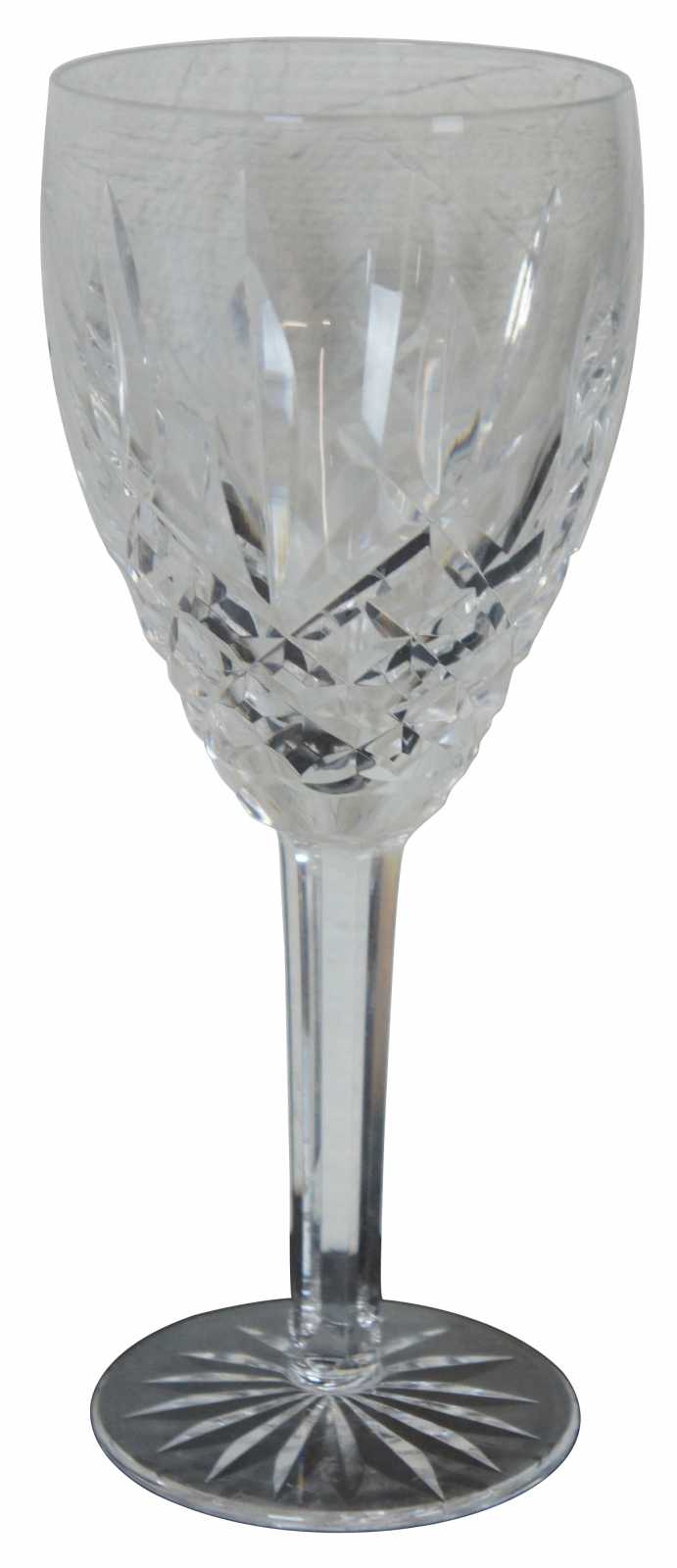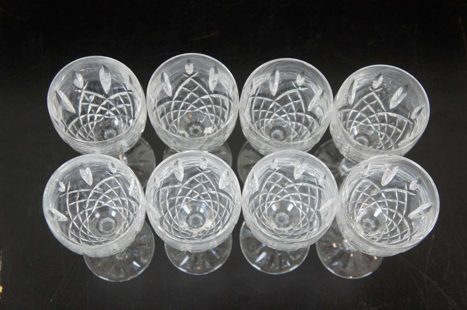 Set of 8 Waterford cut crystal wine glasses in the Araglin pattern with cut criss cross and verticals, faceted stem, and a cut foot.