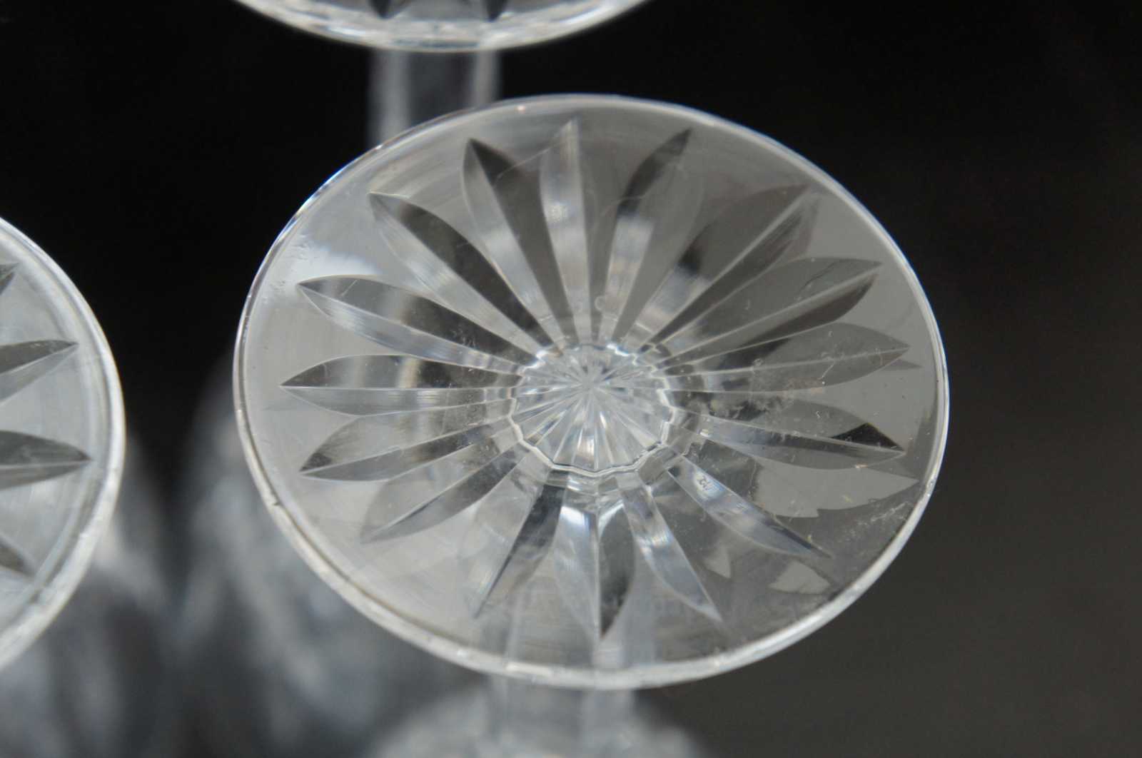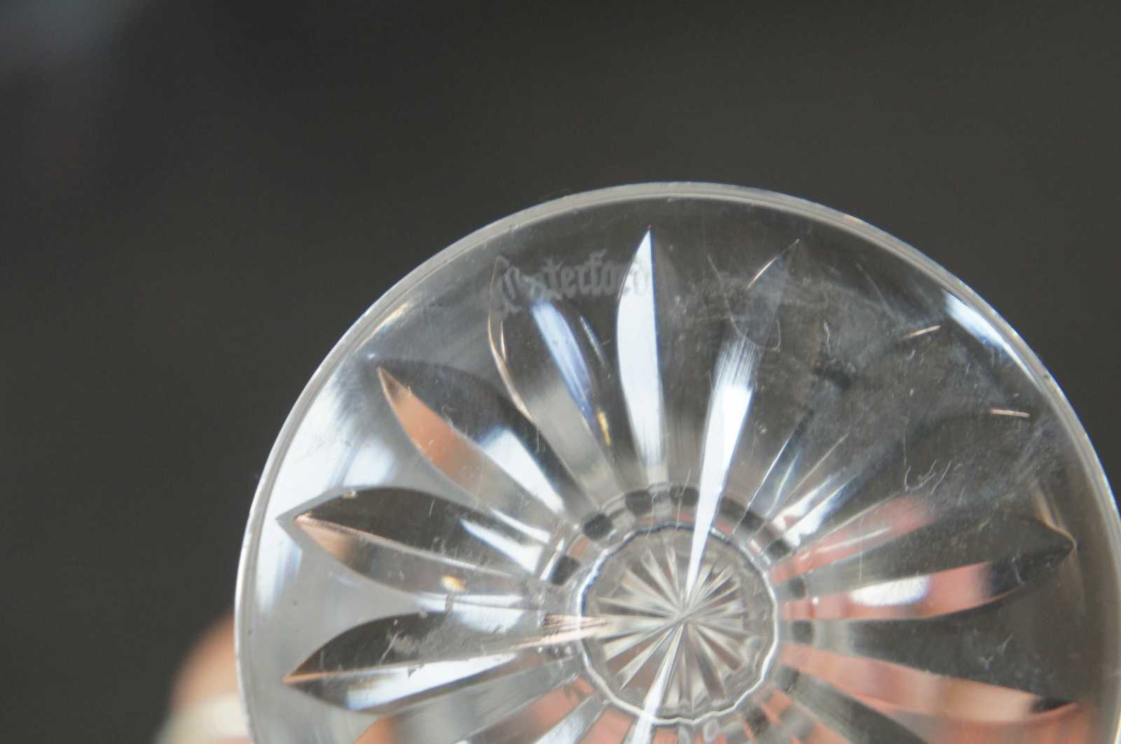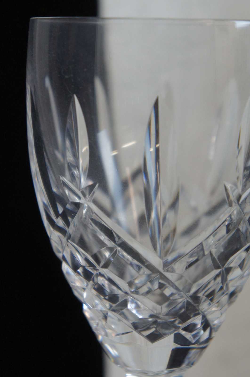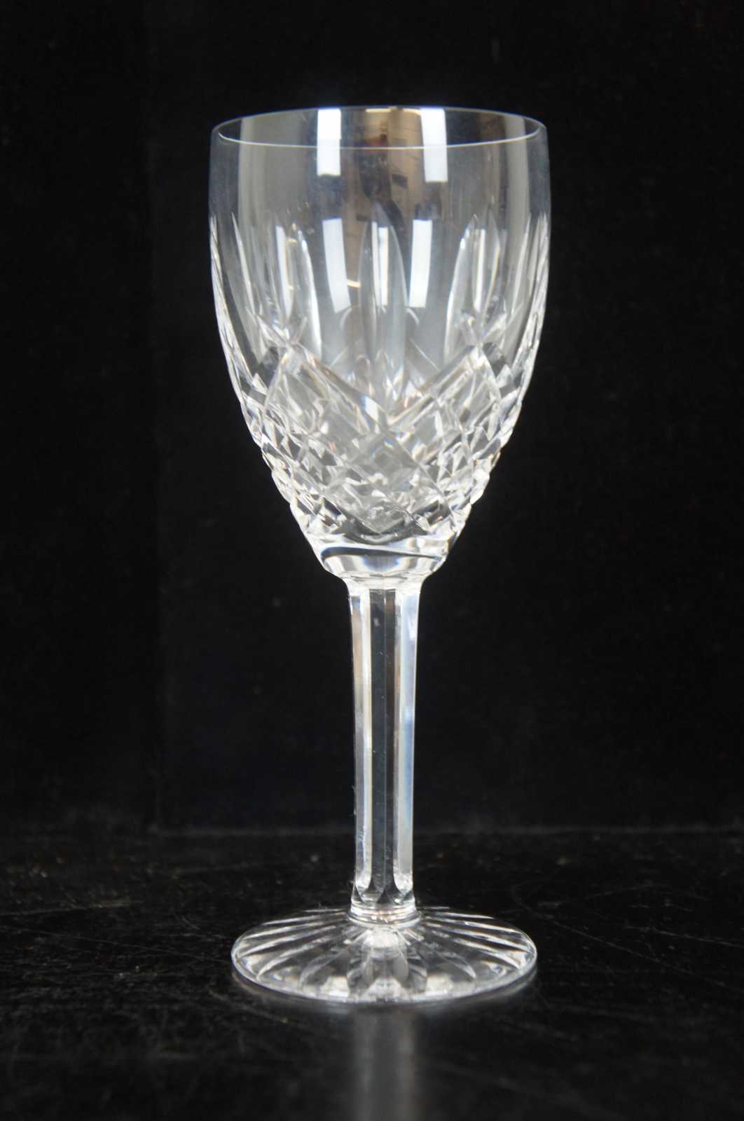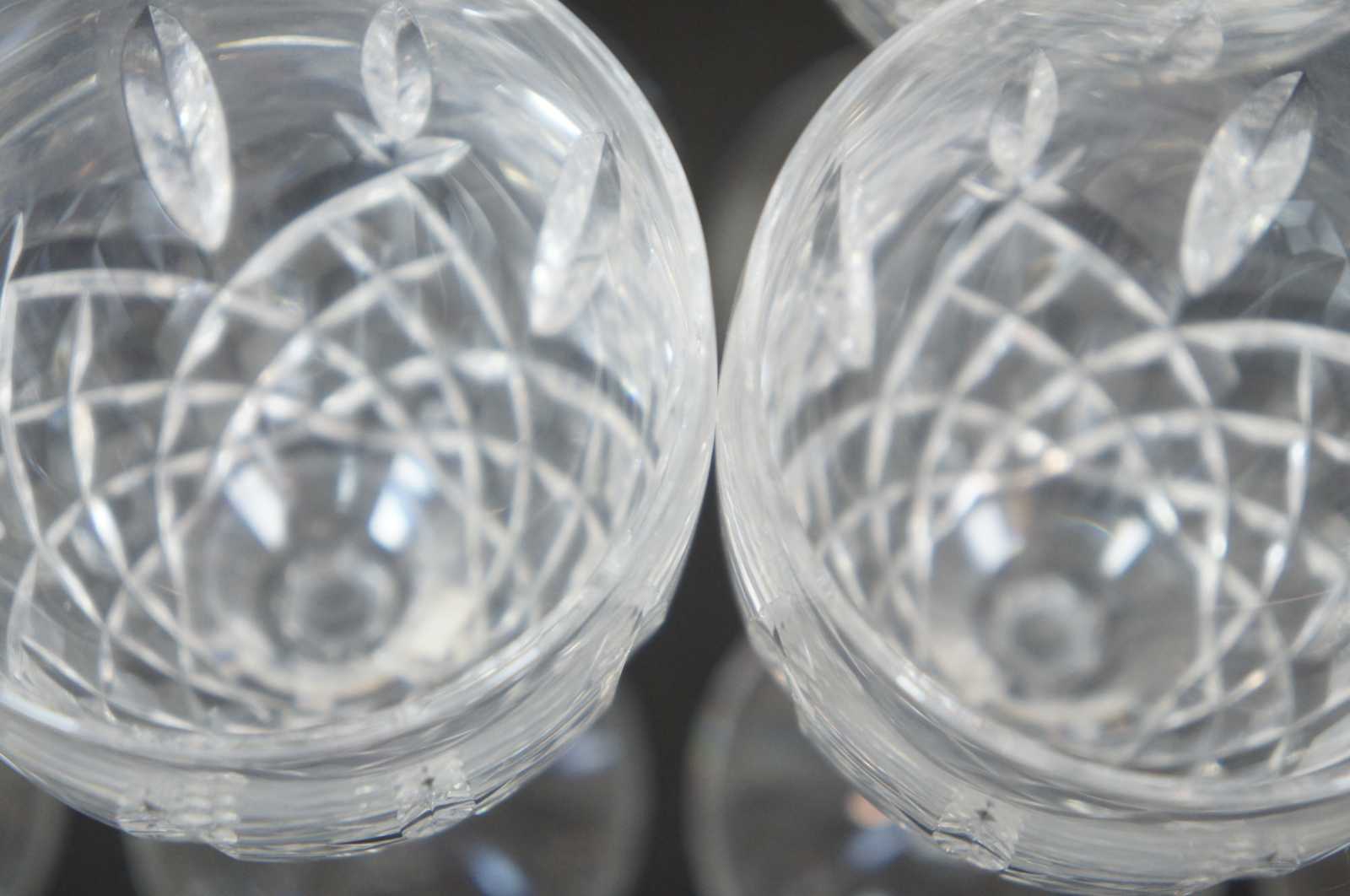 Set of 8 Waterford cut crystal wine glasses in the Araglin pattern with cut criss cross and verticals, faceted stem, and a cut foot.
