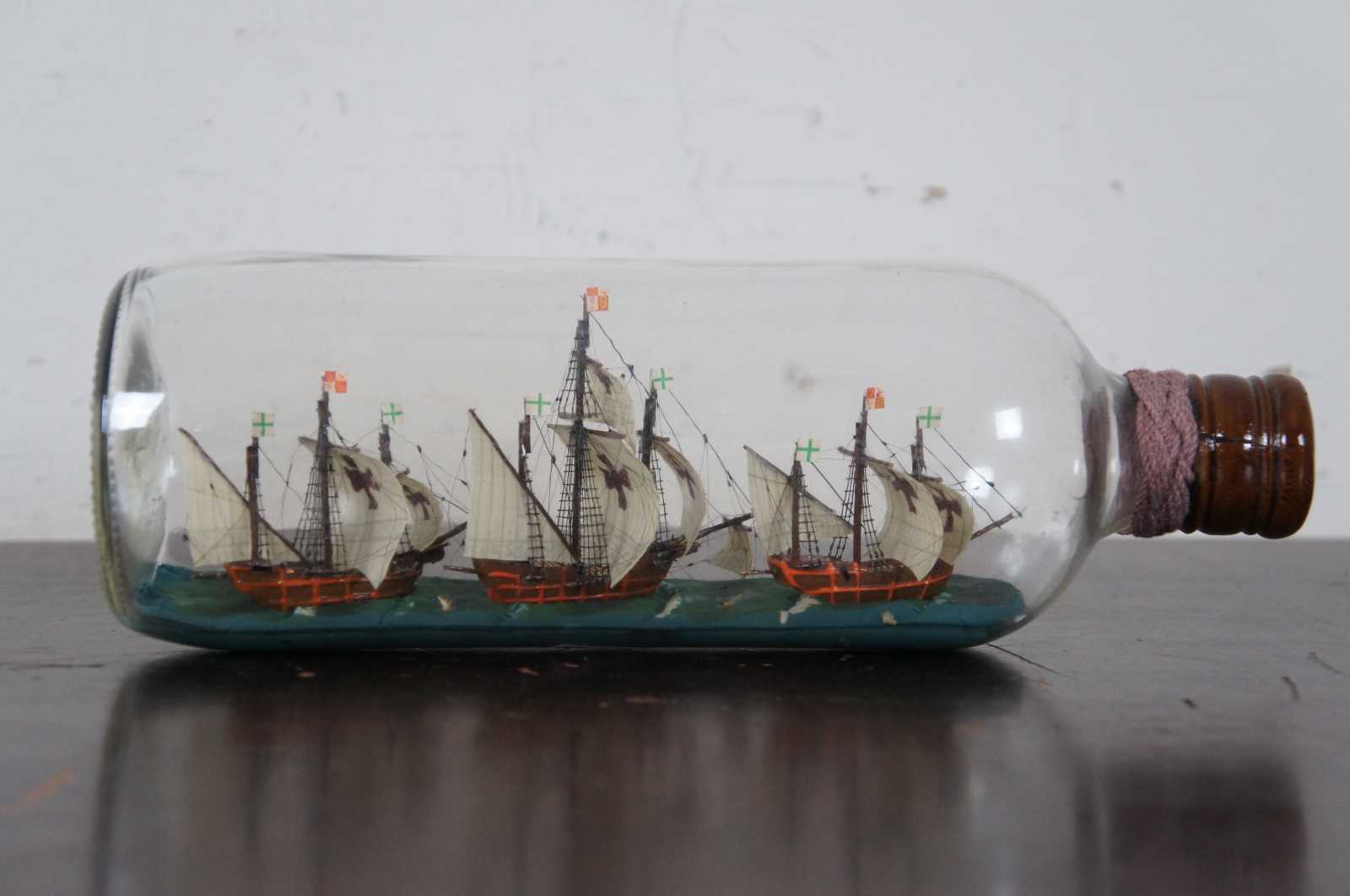 Ship in a bottle tableau handmade for Authentic Models showing Christopher Columbus’ Nina, Pinta and Santa Maria that sailed for the New World in 1492.