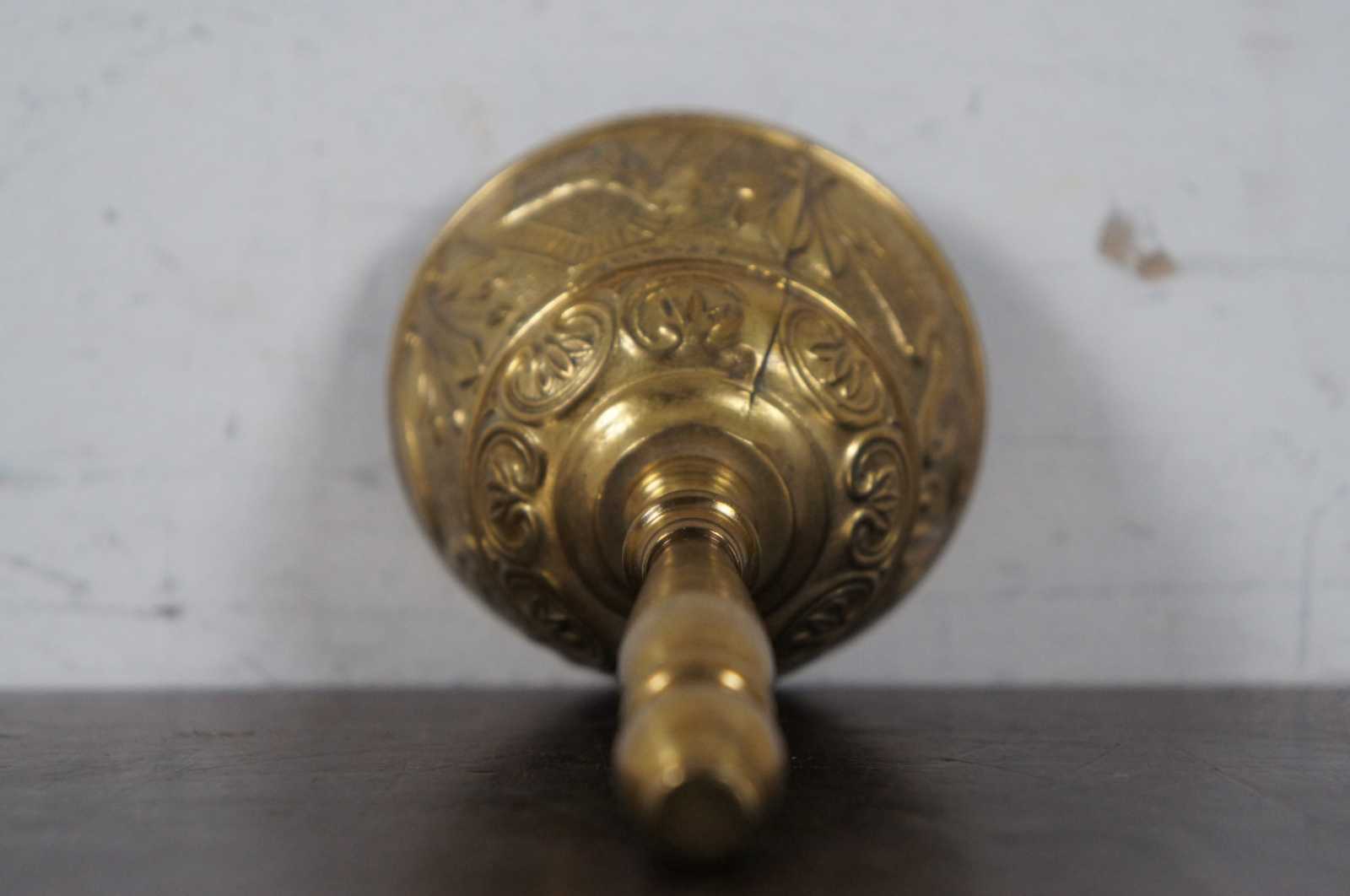 Vintage made in England brass sanctuary bell inscribed with animals and their names in Latin: Leo (lion), Aqvila (eagle), Agnvs (lamb), and Pelicanvs (pelican).