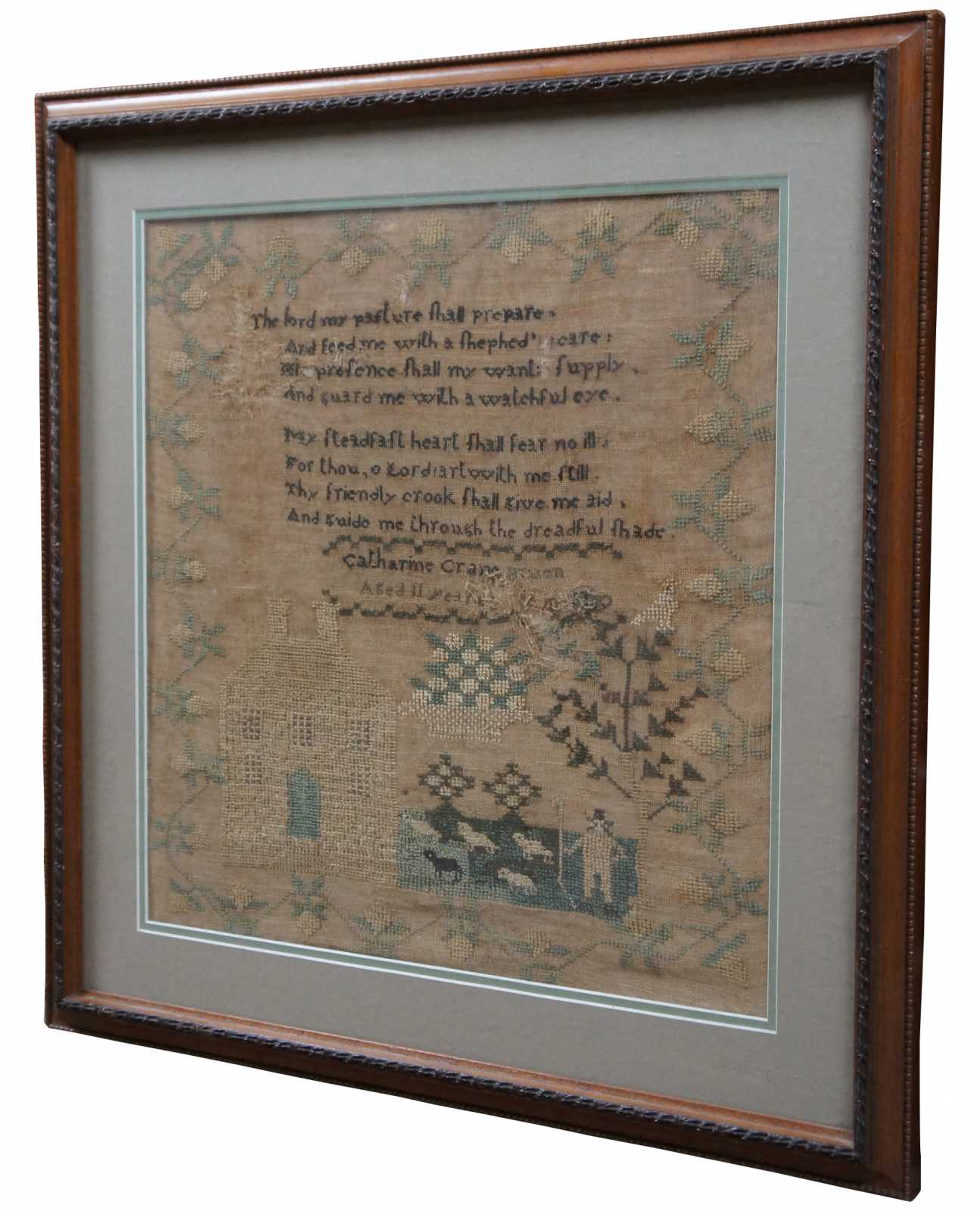 Antique 18th century child’s cross stitch sampler featuring a religious Christian poem above a scene with a house and a shepherd tending a flock of sheep, framed in flowers. “The Lord my pasture shall prepare And feed me with a shepherds care: His presence shall my wants supply, and guard me with a watchful eye. My steadfast heart shall fear no ill, For thou, O Lord: art with me still. Thy friendly crook shall give me aid, And guide me through the dreadful shade. - Catherine Crane, Aged 11 Years.”