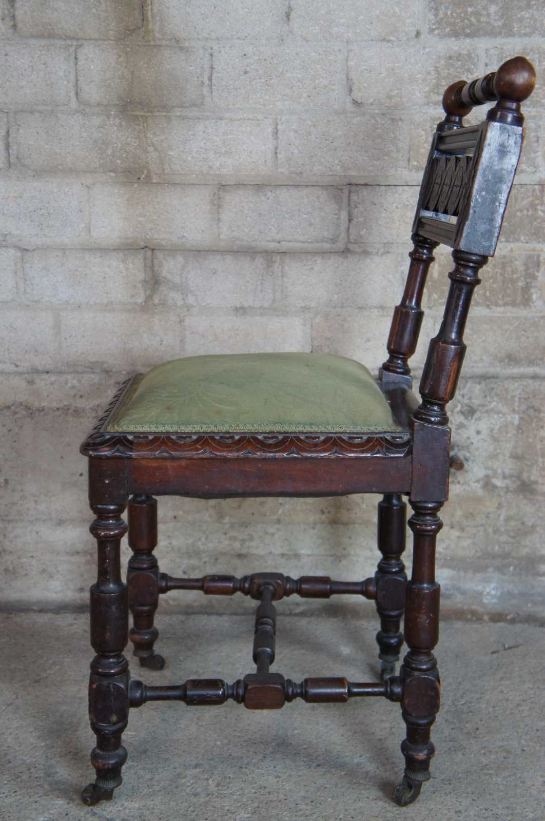 Antique 19th century Charles II style side or desk chair. Made from oak with ornately carved details. Features a ball and stick design along the back rail over a unique pierced helix design between carved medallions. The green upholstered seat is nicely framed by a repeating crescent carving. The chair is supported by four turned over castors and is connected by an H stretcher.