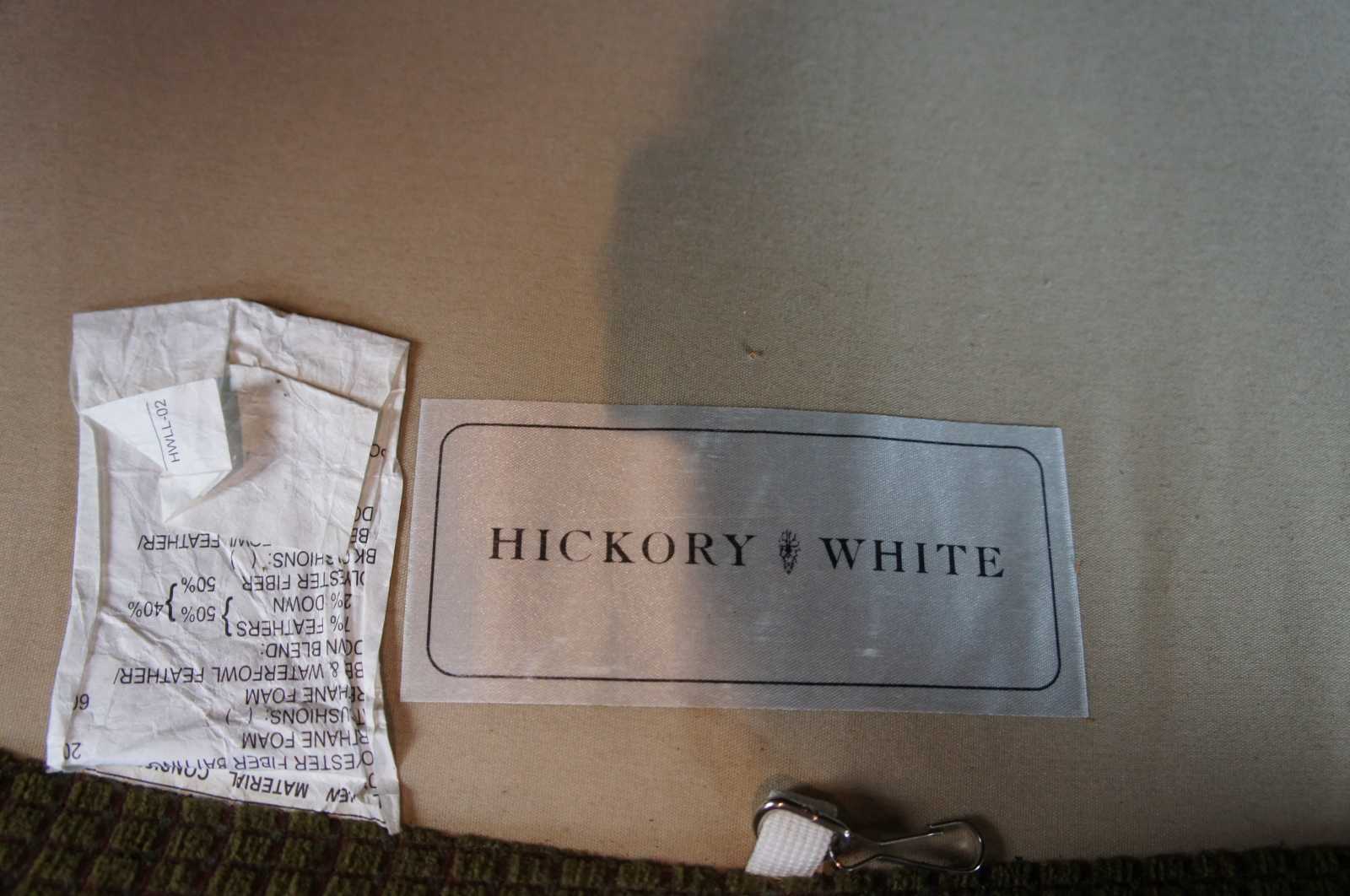 Vintage Hickory White camel back sofa or love seat. Features serpentine camel back with overstuffed rolled arms with green and maroon fabric and black oak stained legs.