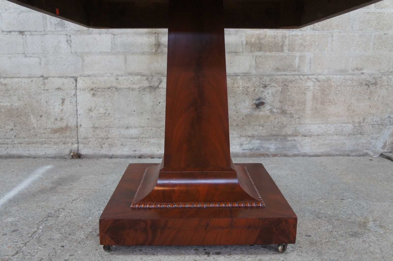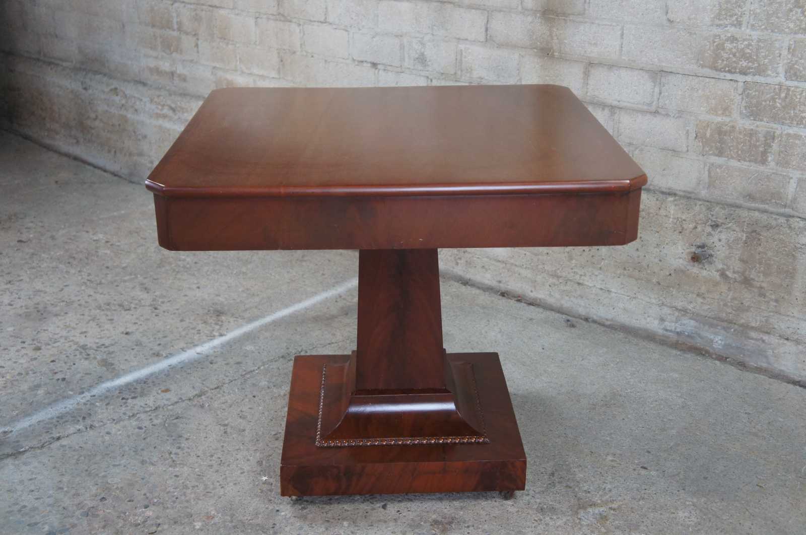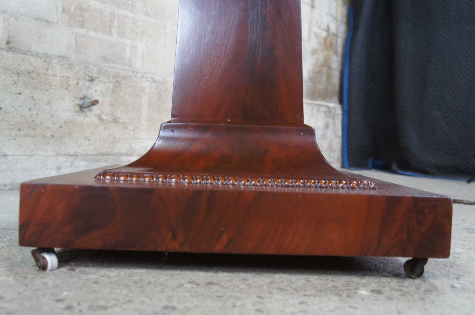 Antique American Empire pedestal center table. Made of mahogany with a crotch veneer featuring a square form and pedestal base with castors.