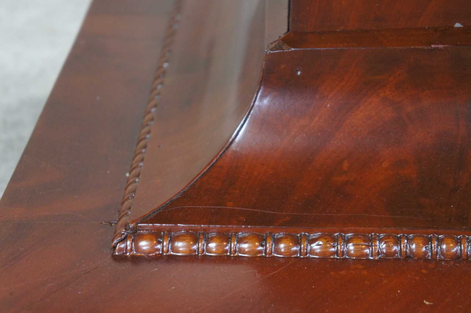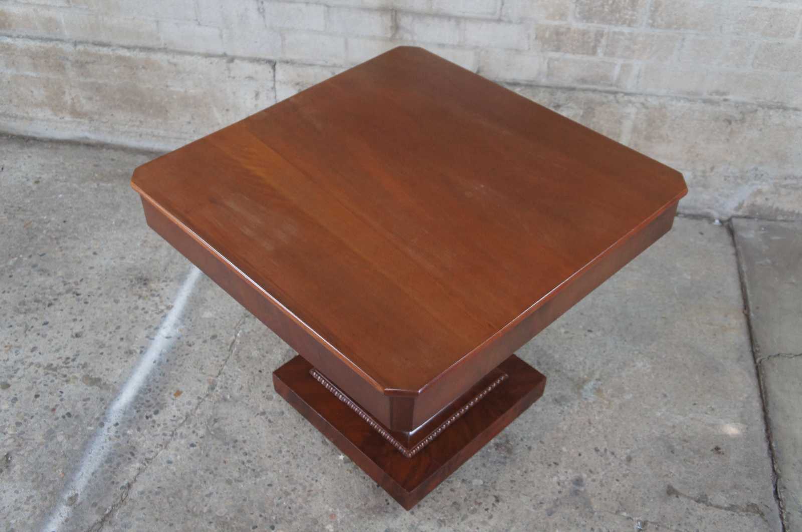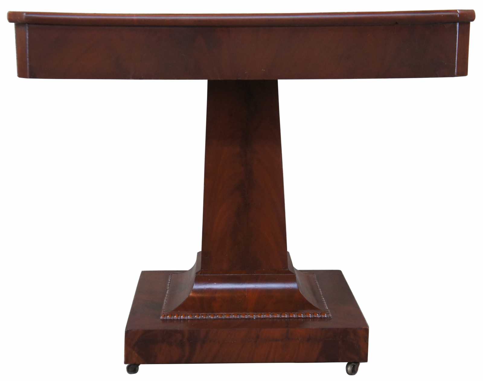 Antique American Empire pedestal center table. Made of mahogany with a crotch veneer featuring a square form and pedestal base with castors.
