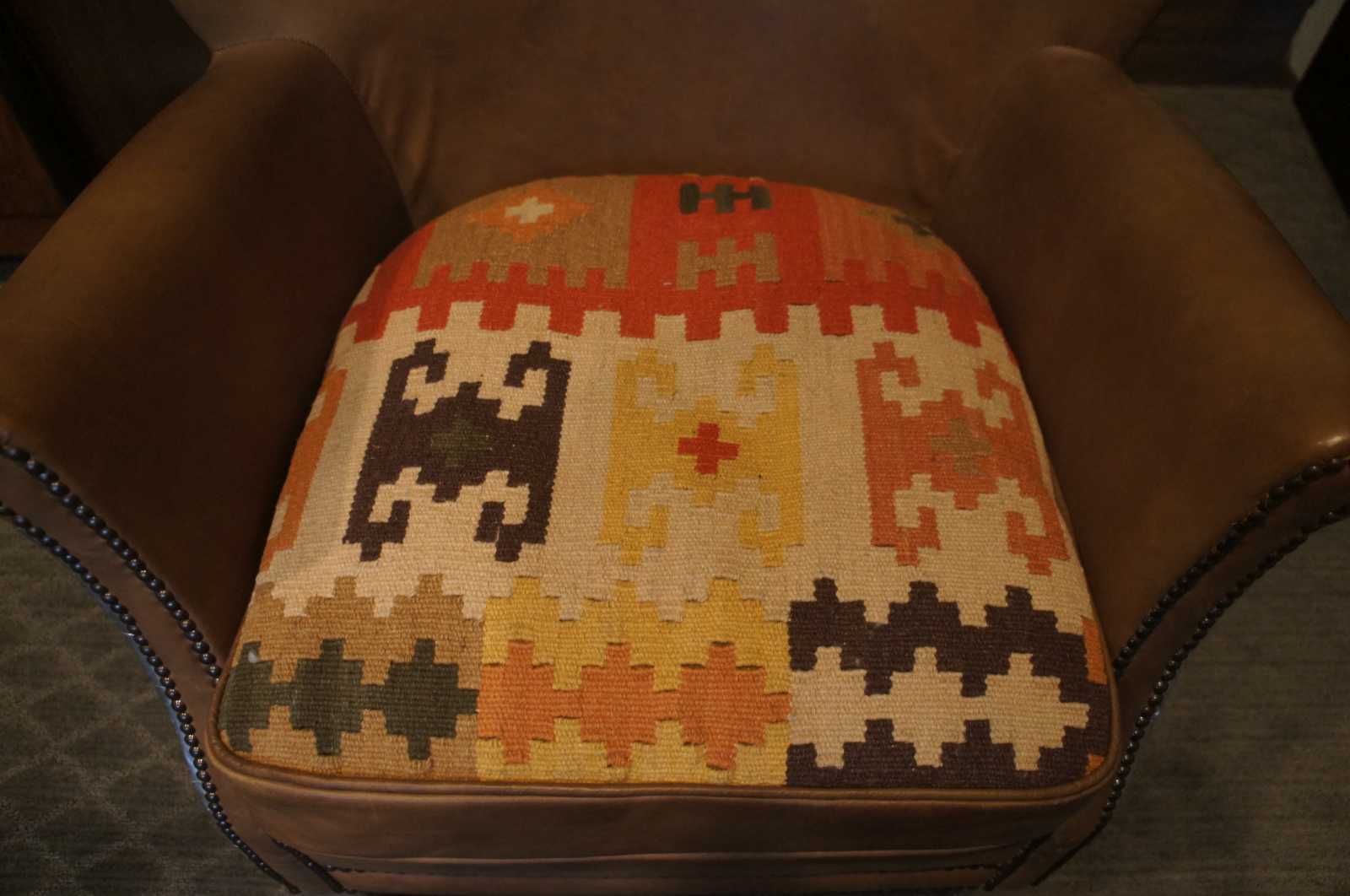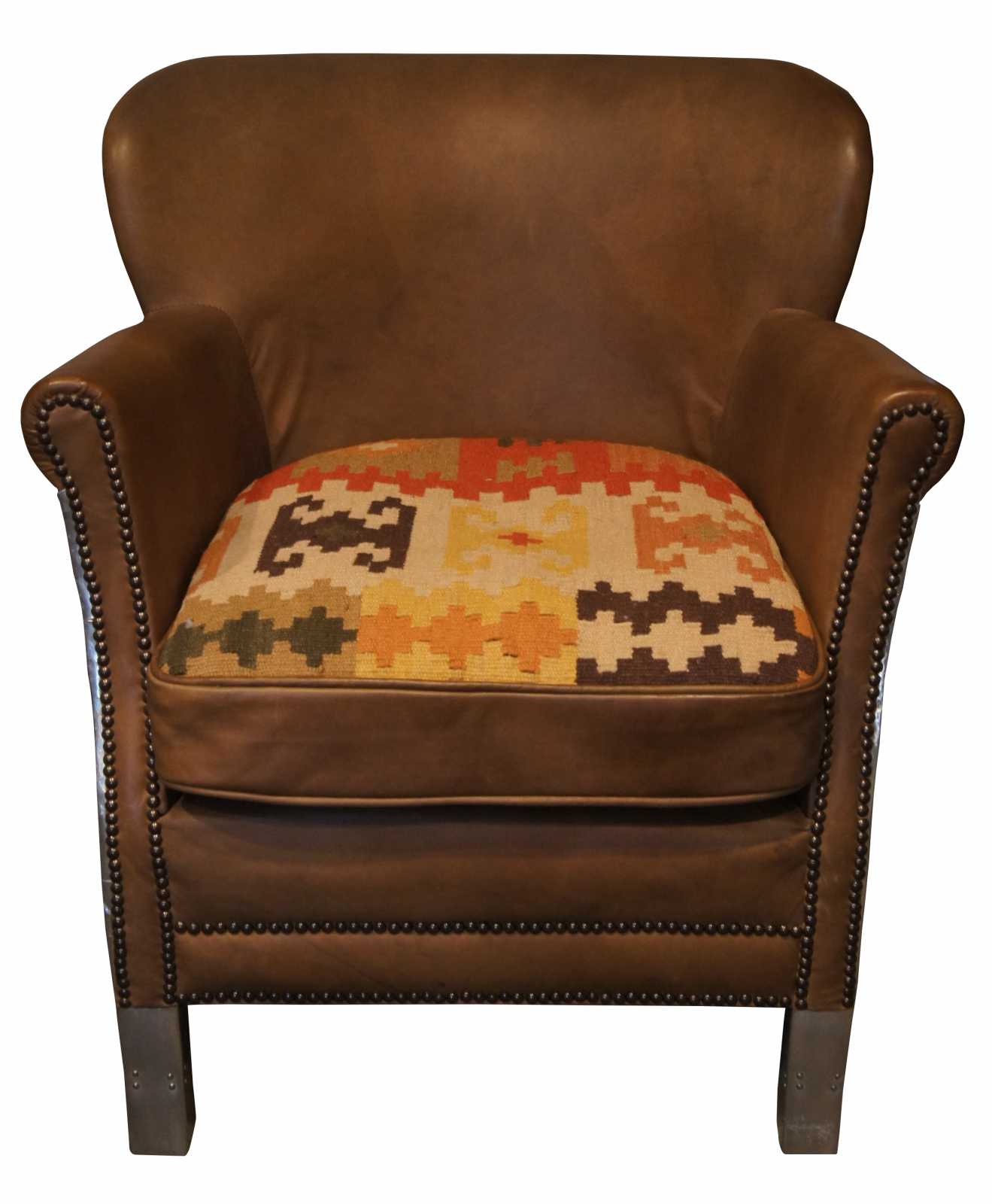 Small in stature, grand in style, the Professor's Chair provides all the presence and comfort of its larger kin. A 1920s English wing chair by design, its petite proportions and enveloping embrace offer seating on a more intimate scale. Upholstered with a down-feather fill and tailored with refined welting and nailhead trim. A special version with the Aviator aluminum flare and southwestn fabric along one side of seat.