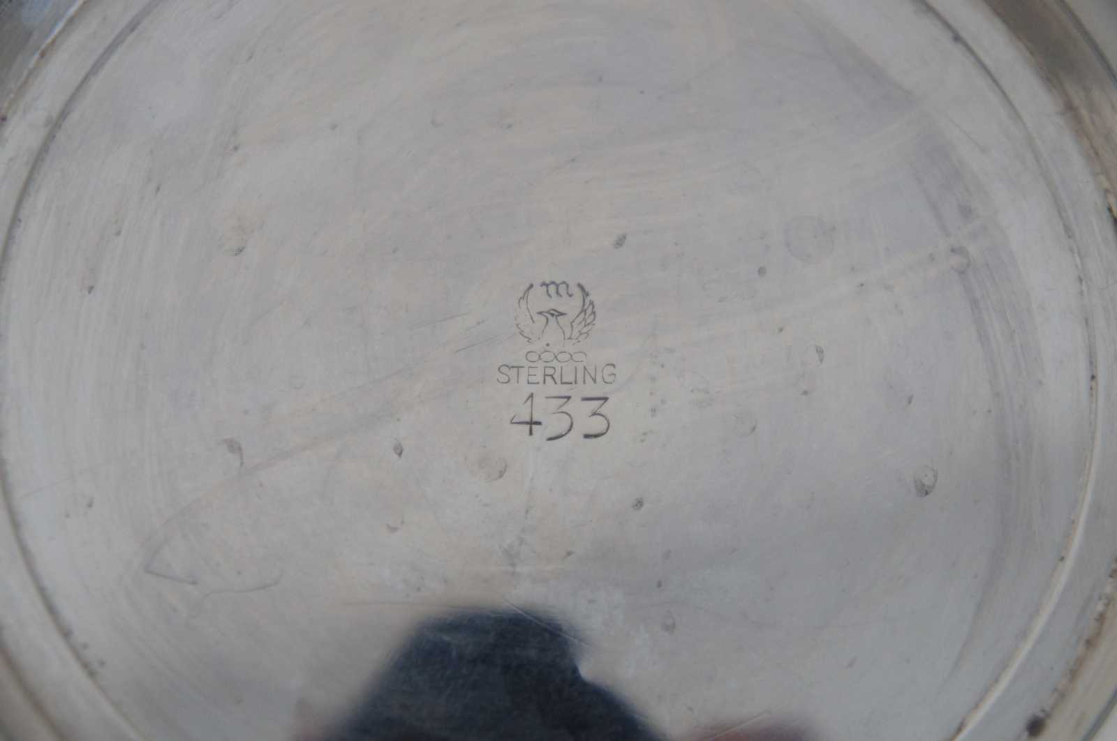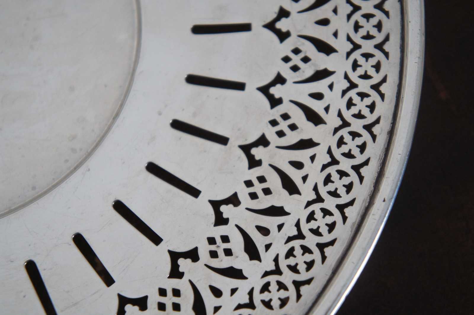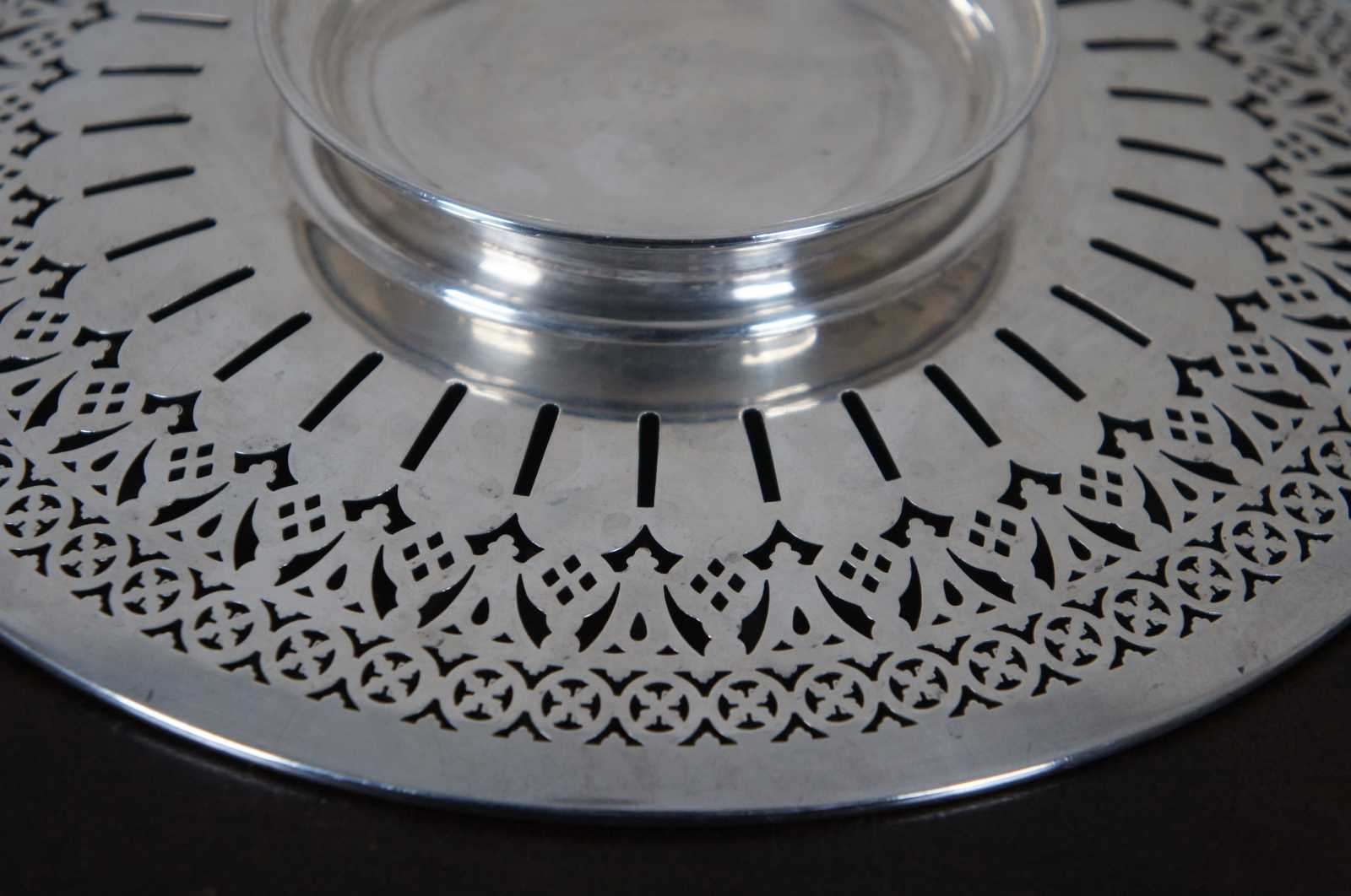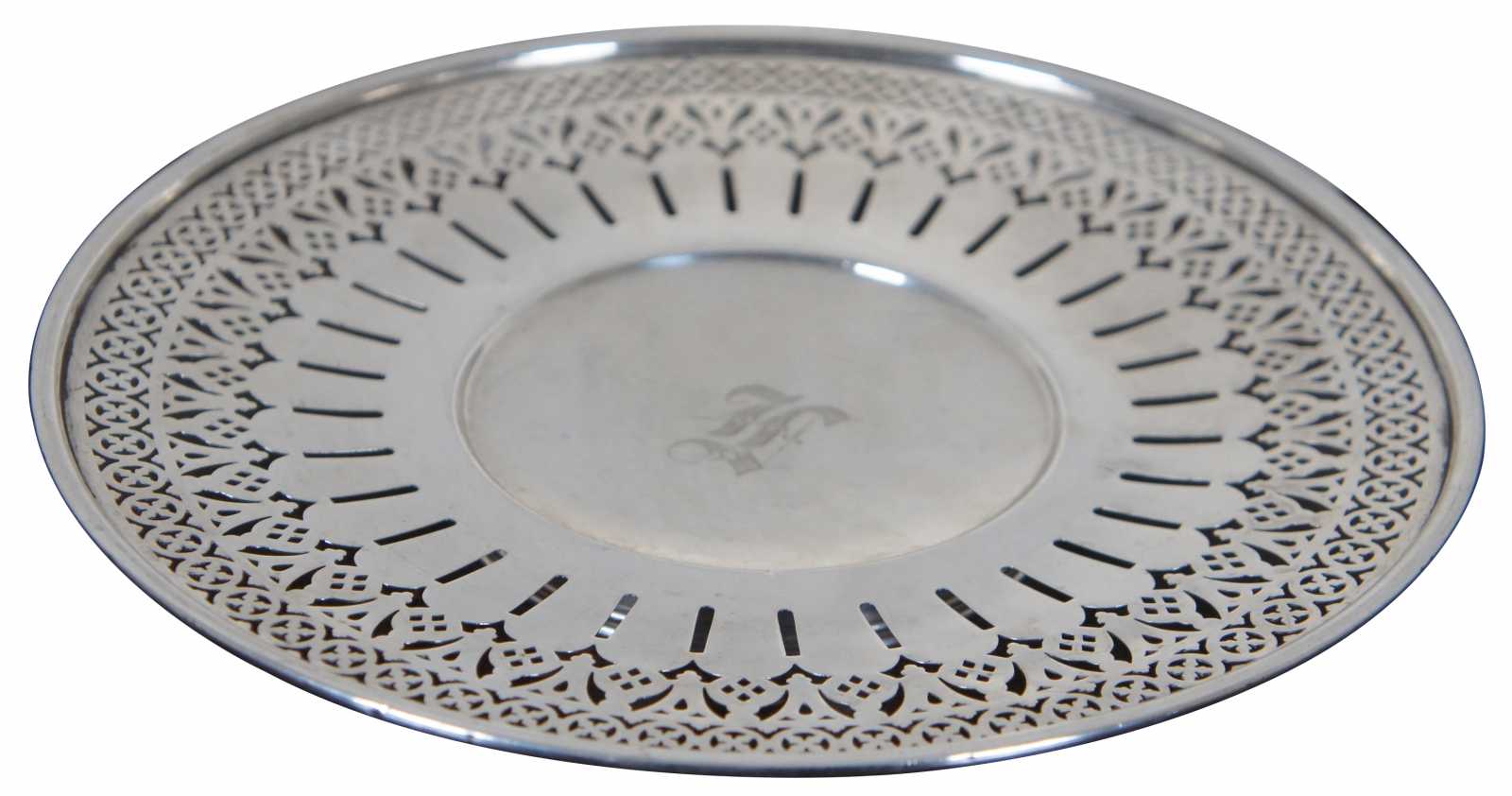 Antique Meriden Brittania Company sterling silver round footed serving tray with pierced edge and engraved monogram at the center.