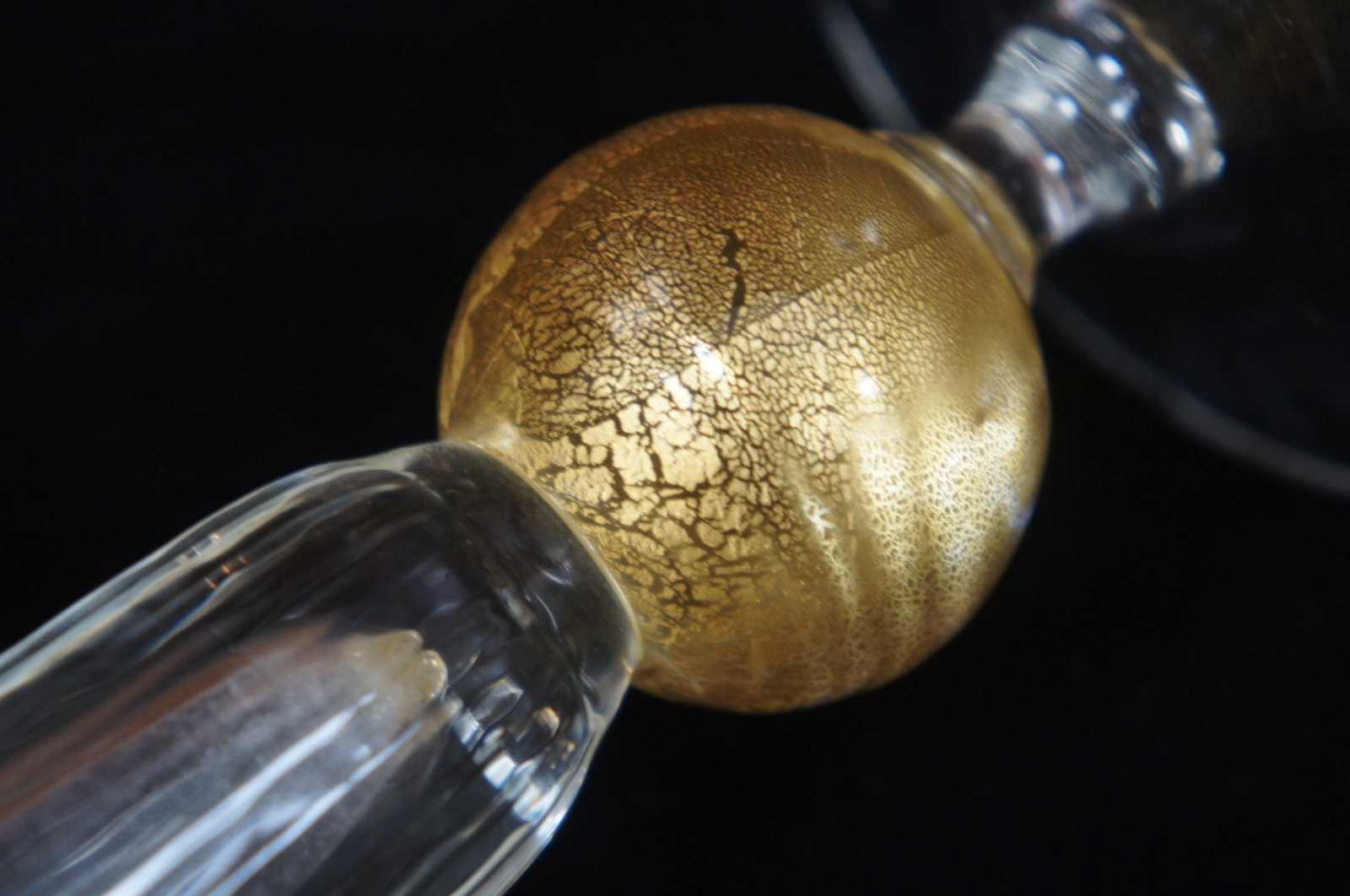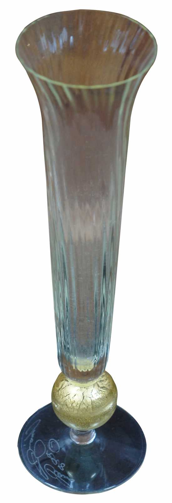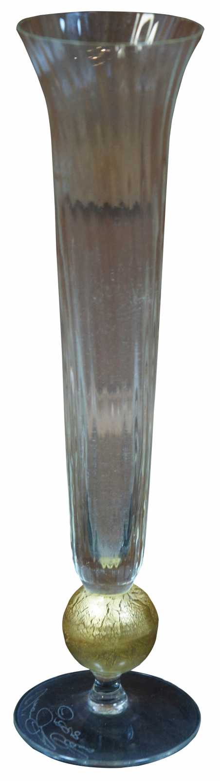 Vintage 1998 signed studio art glass vase with clear fluted neck, round foot and decorated with a speckled gold flake bauble or orb.