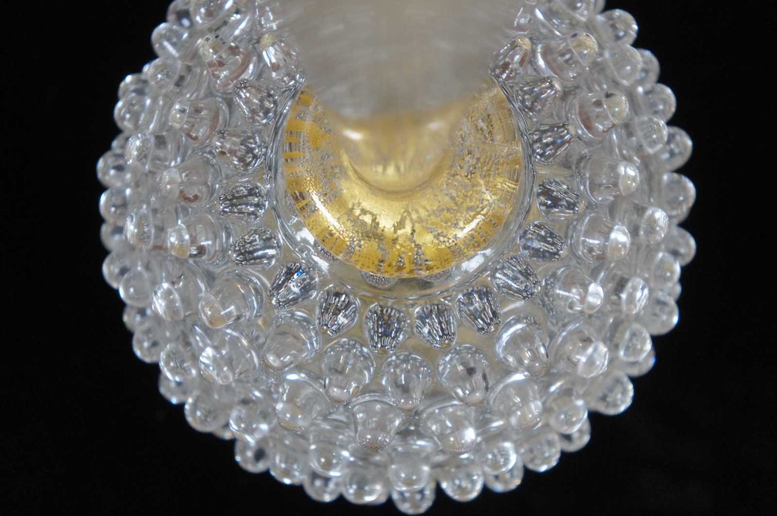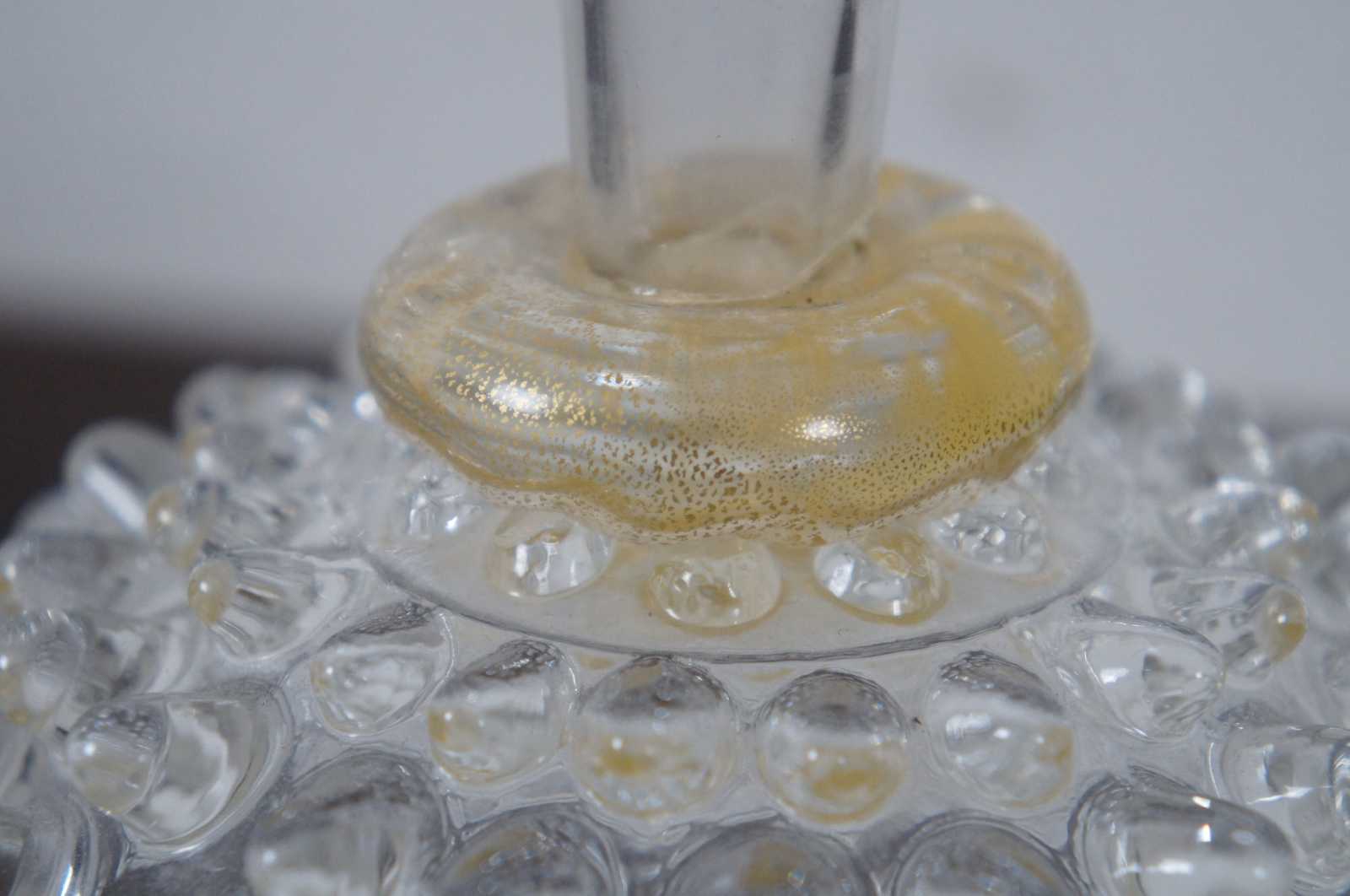 Vintage 1998 signed studio art glass vase with clear tapered neck atop a hobnail textured orb with speckled gold flake collar and foot.