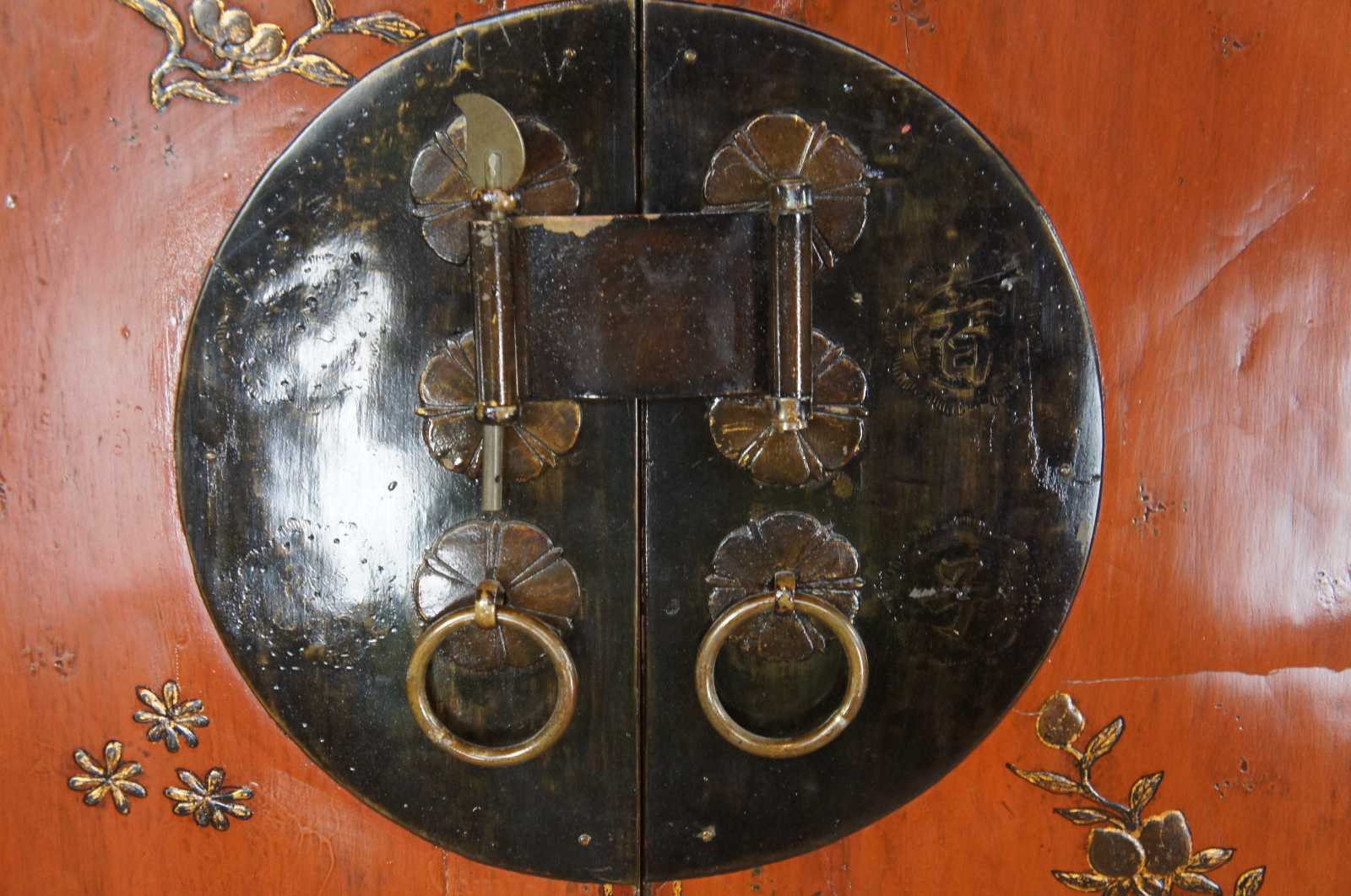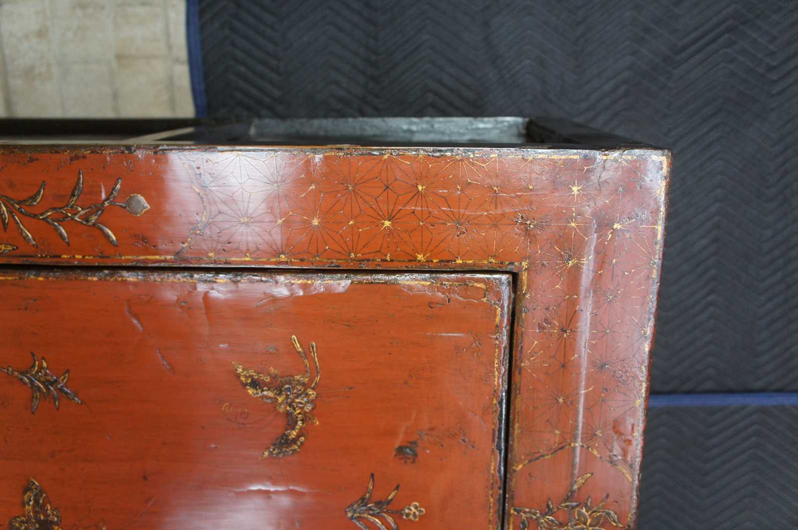 Antique 19th century Qing Dynasty wedding cabinet. Made from elm with red lacquer finish over dragonfly / butterfly motif. Features two shelves and hidden interior compartment.