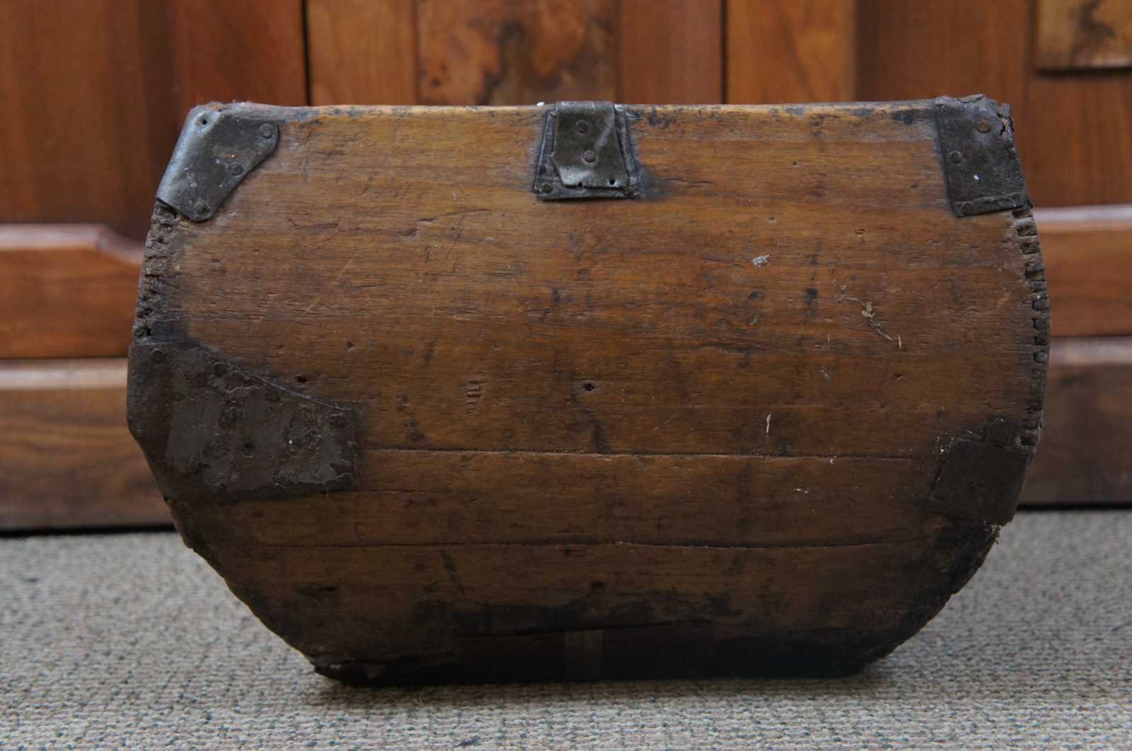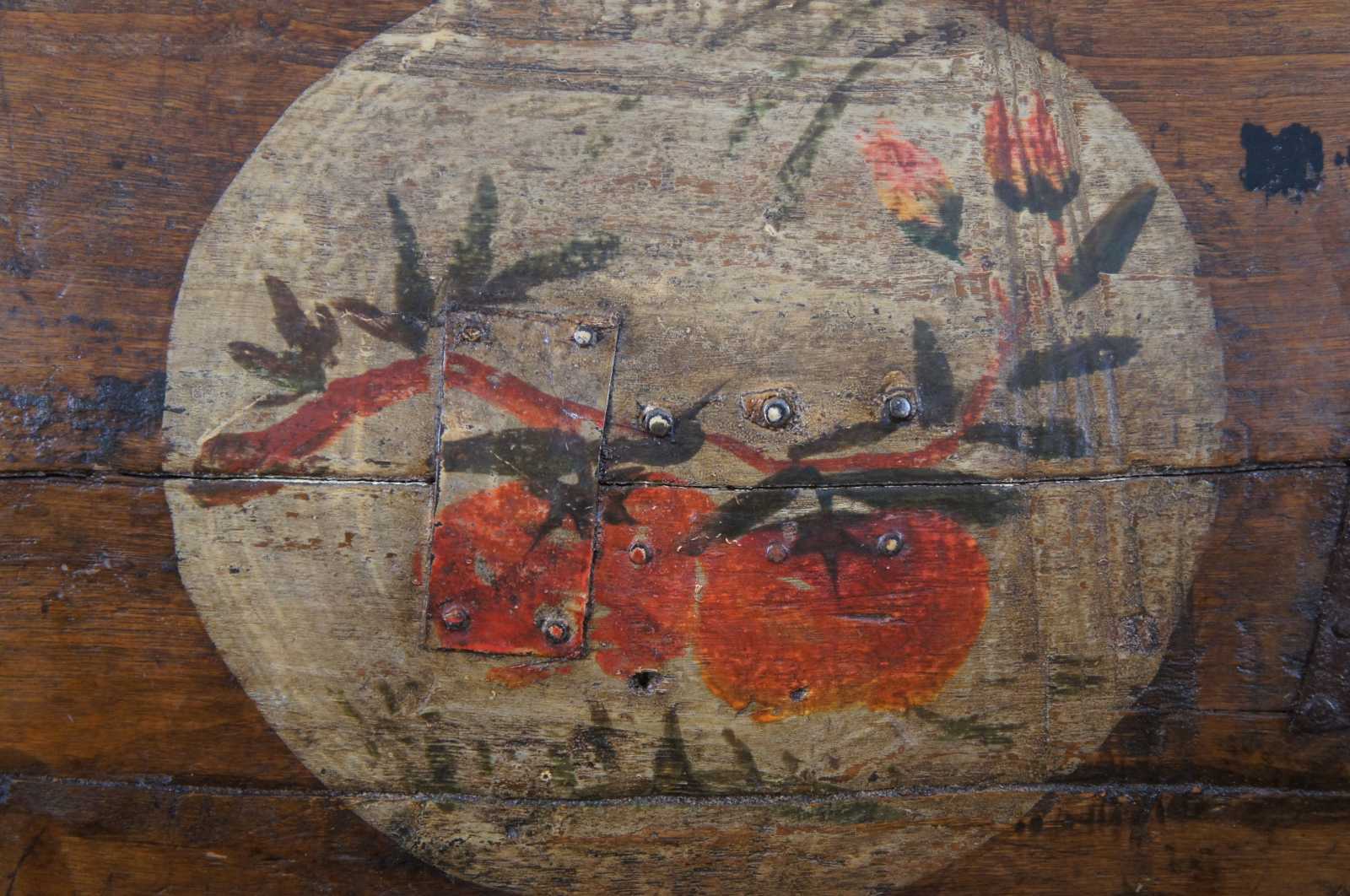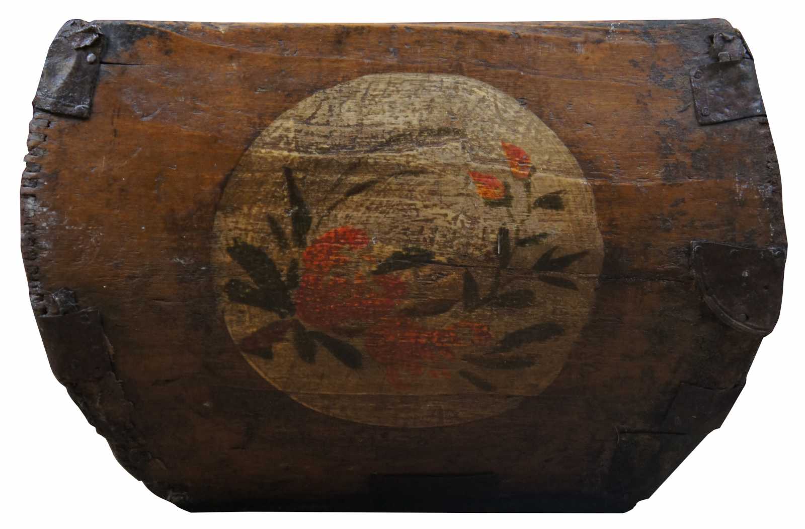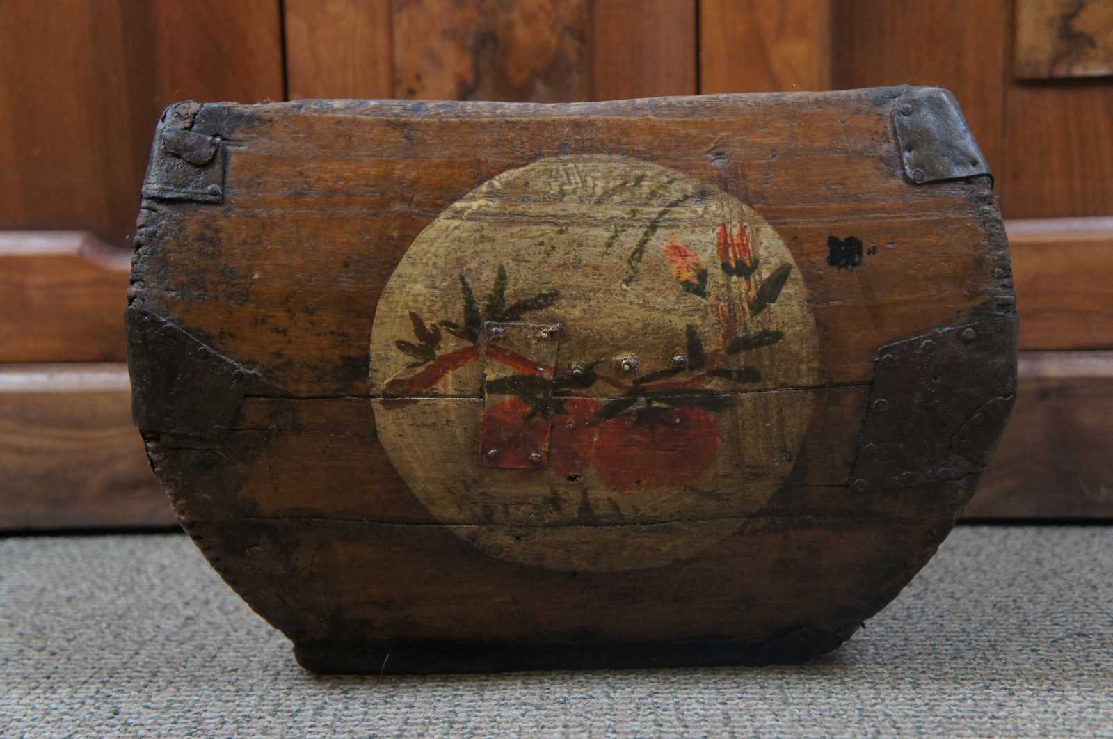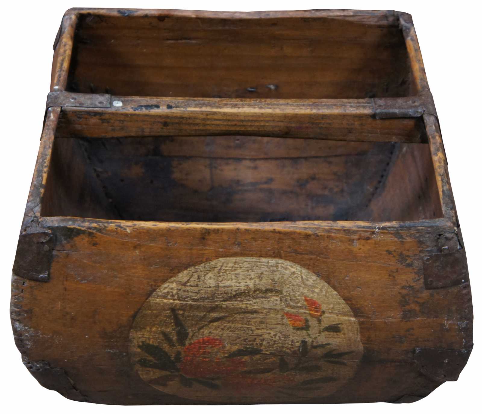 Antique wooden grain or rice measure / harvesting bucket with handle across the middle and primitive iron accents. Two sides are painted with folk art medallions of flowers and tomatoes.